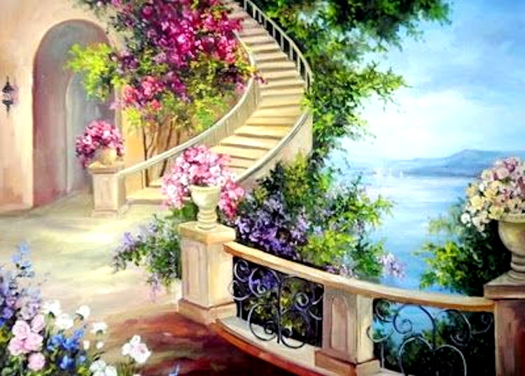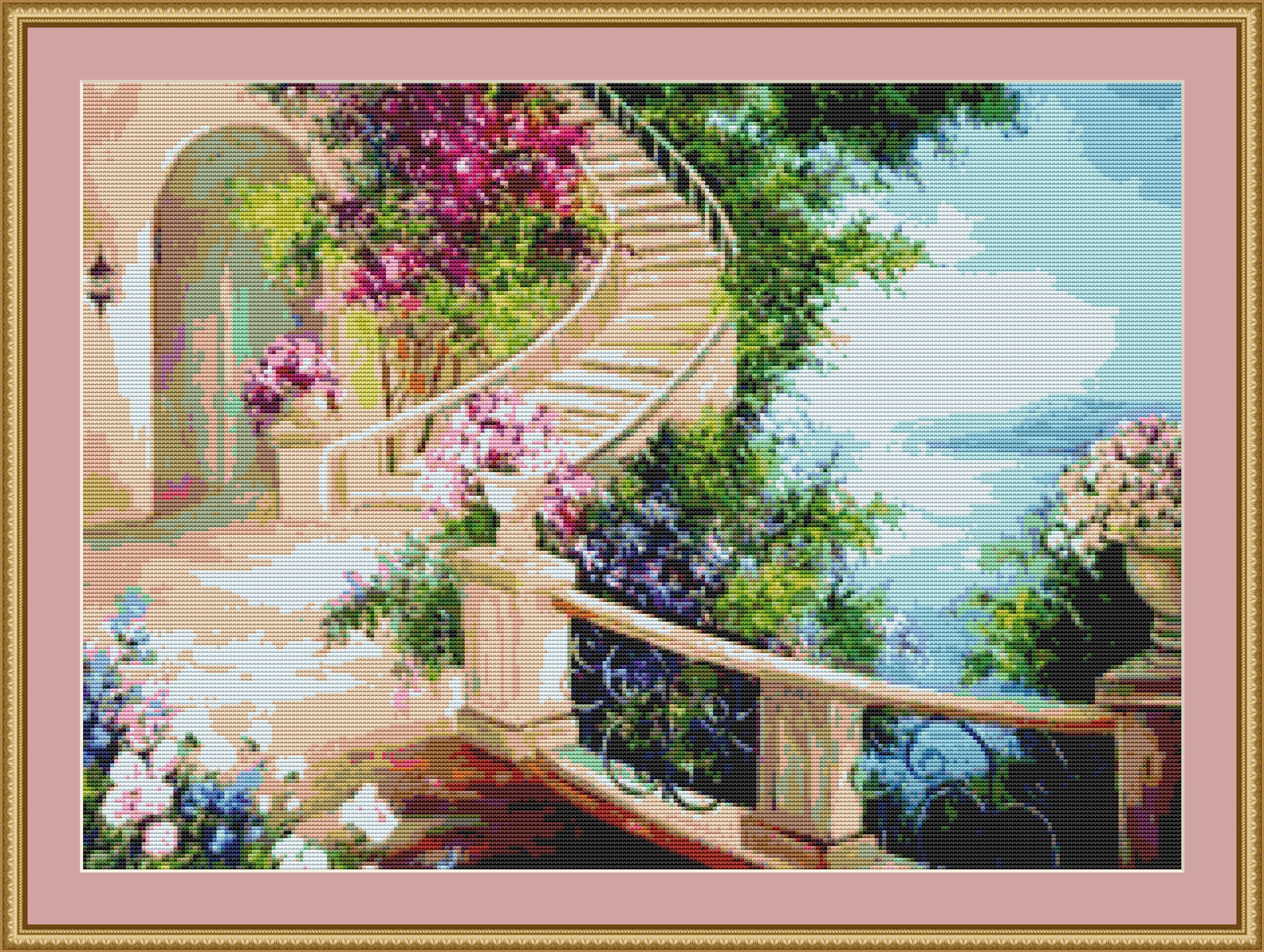 This cross stitch pattern of a beautiful staircase coming down to a terraced garden.