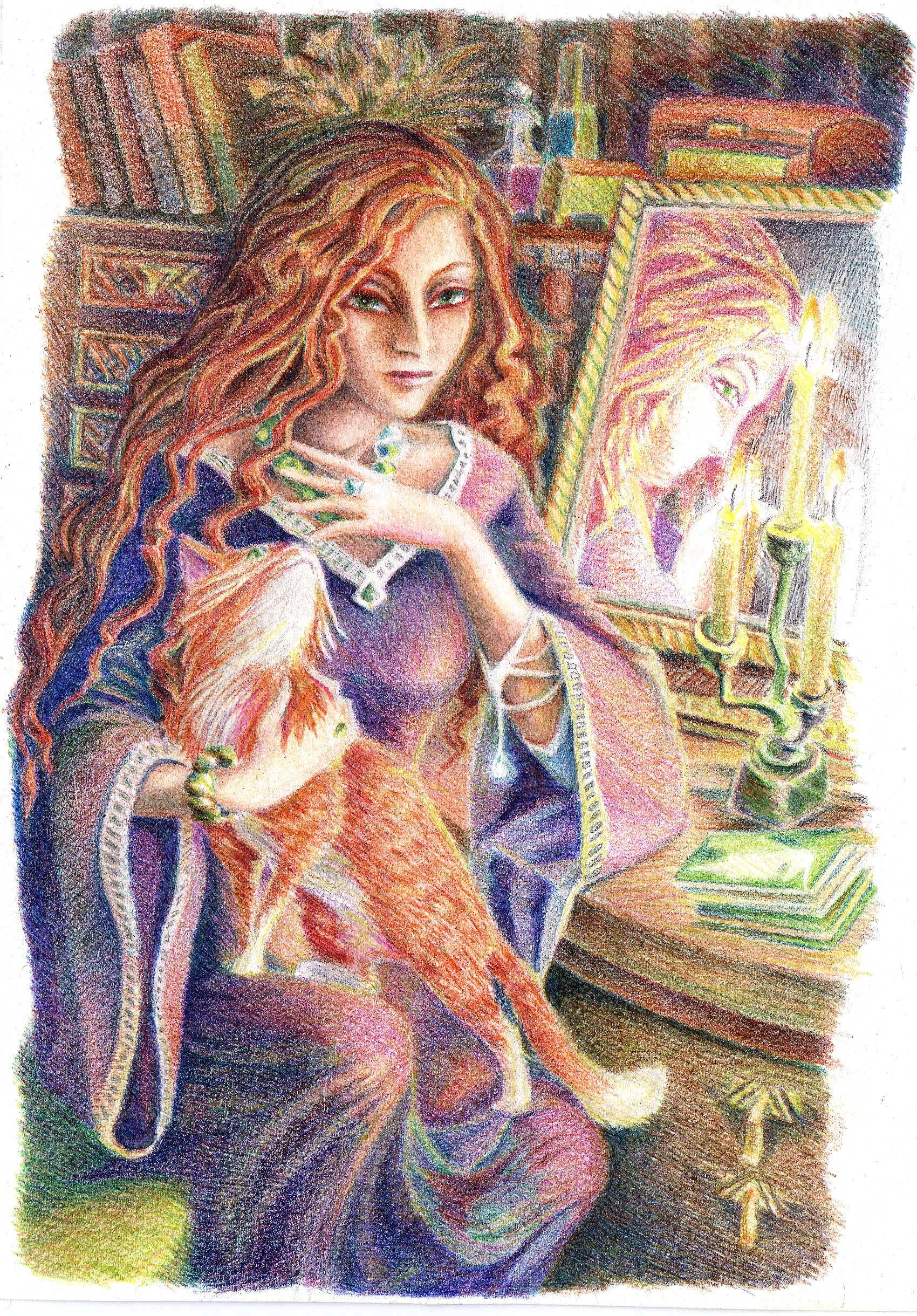 This cross stitch pattern depicts a picture of a woman sat holding her cat.