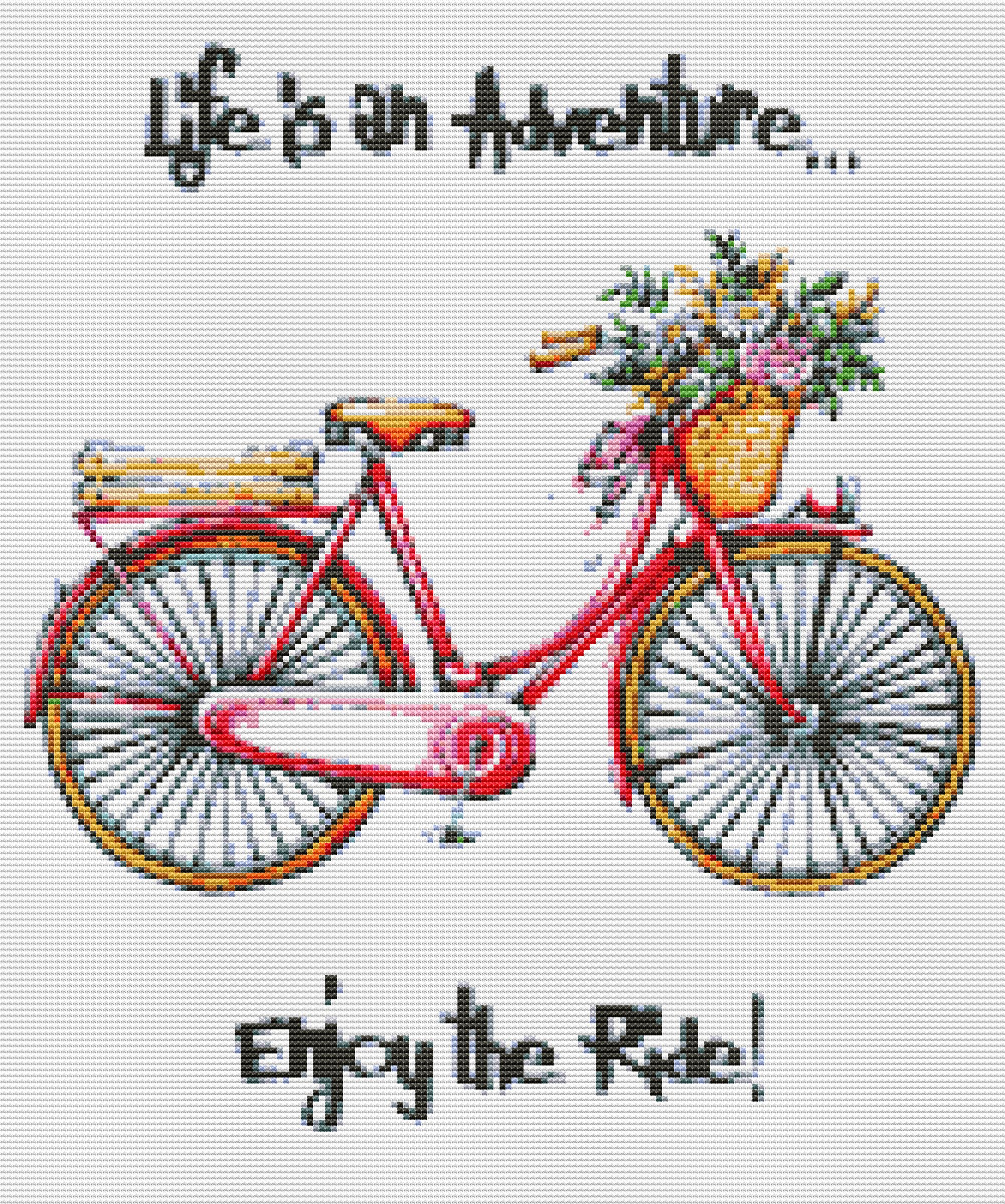 This cross stitch pattern depicts a picture of a lovely pink bicycle with a basket of flowers and a quotation.