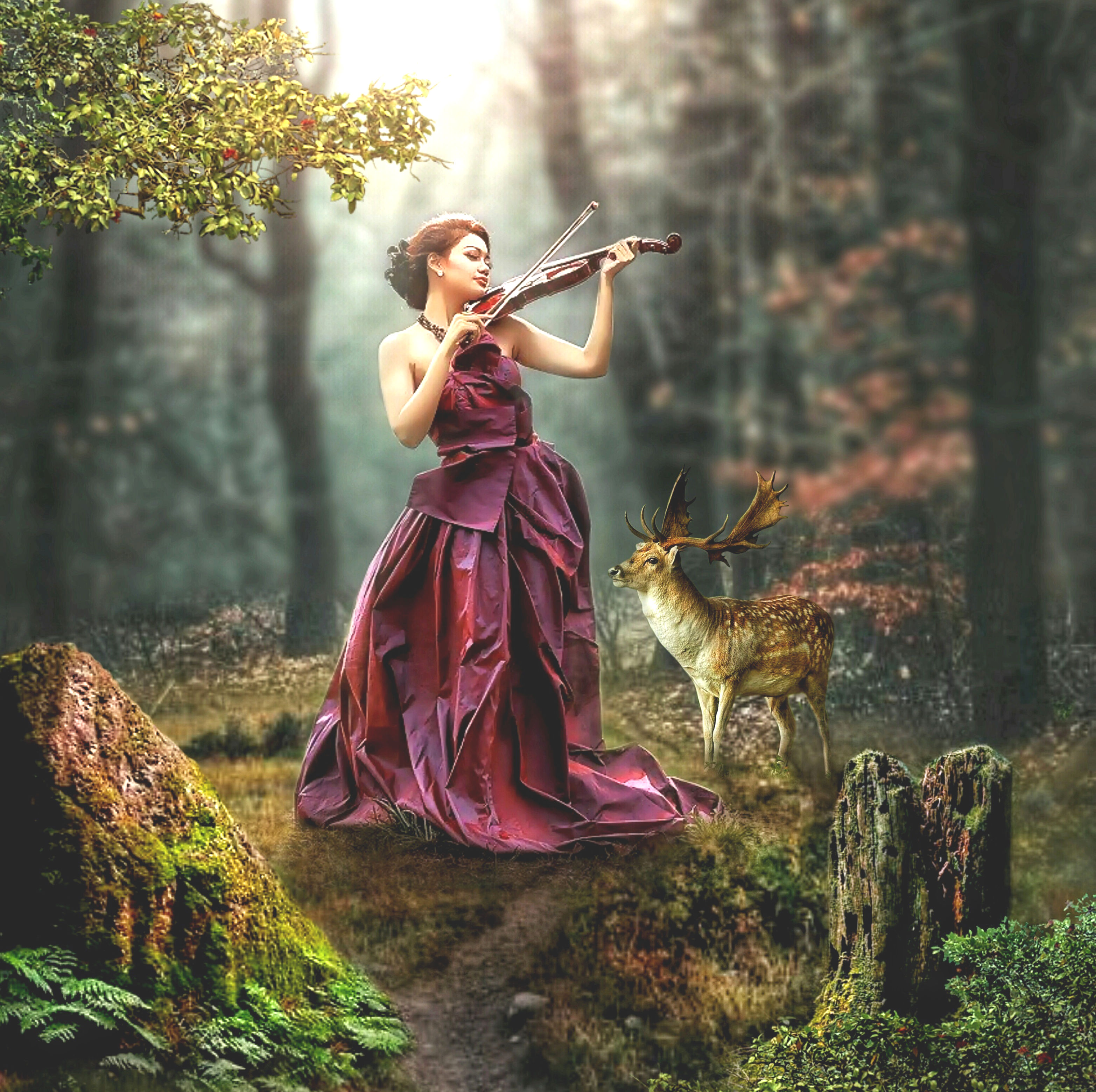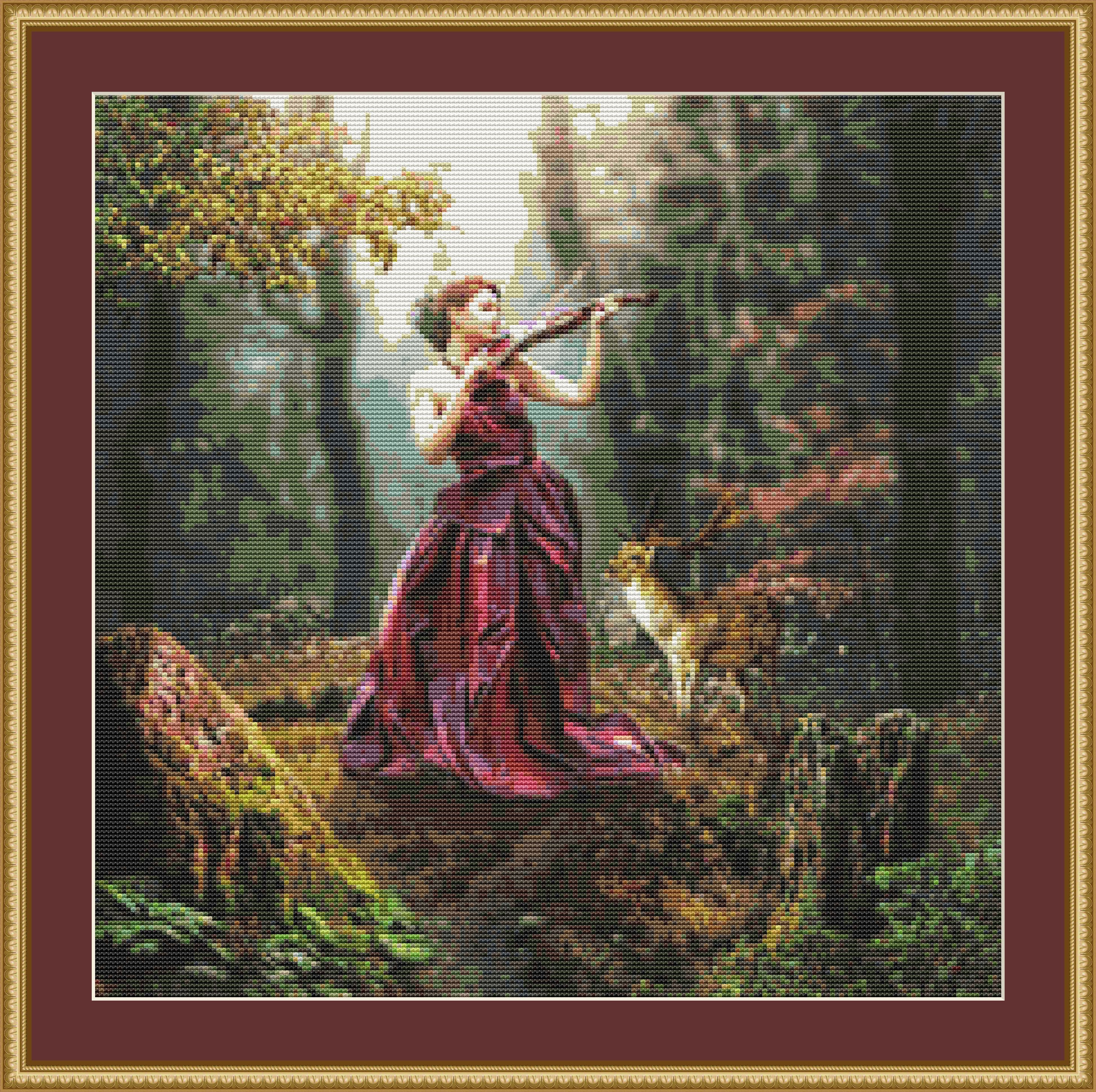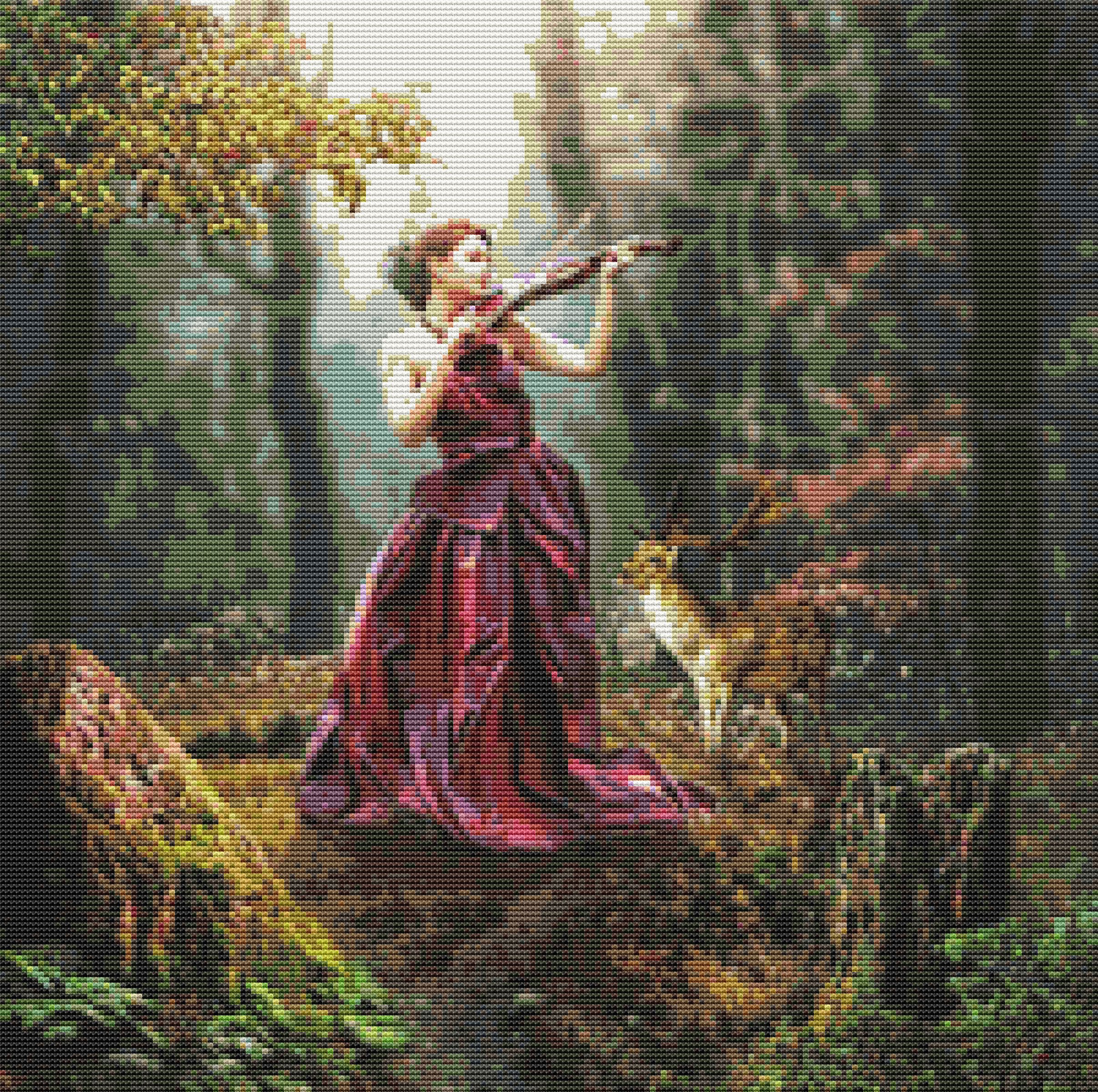This cross stitch pattern of a woman playing a violin in a woodland scene.
