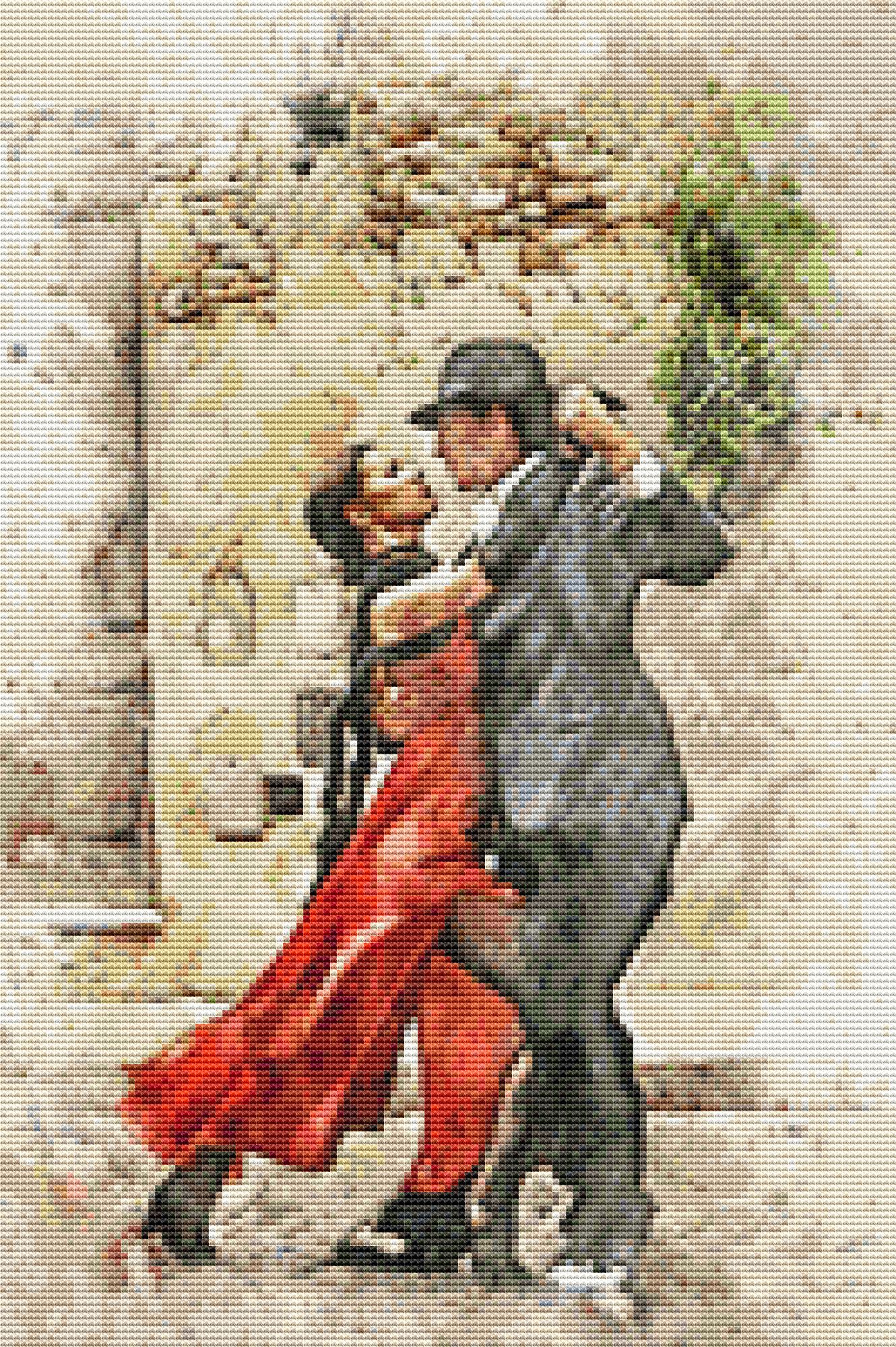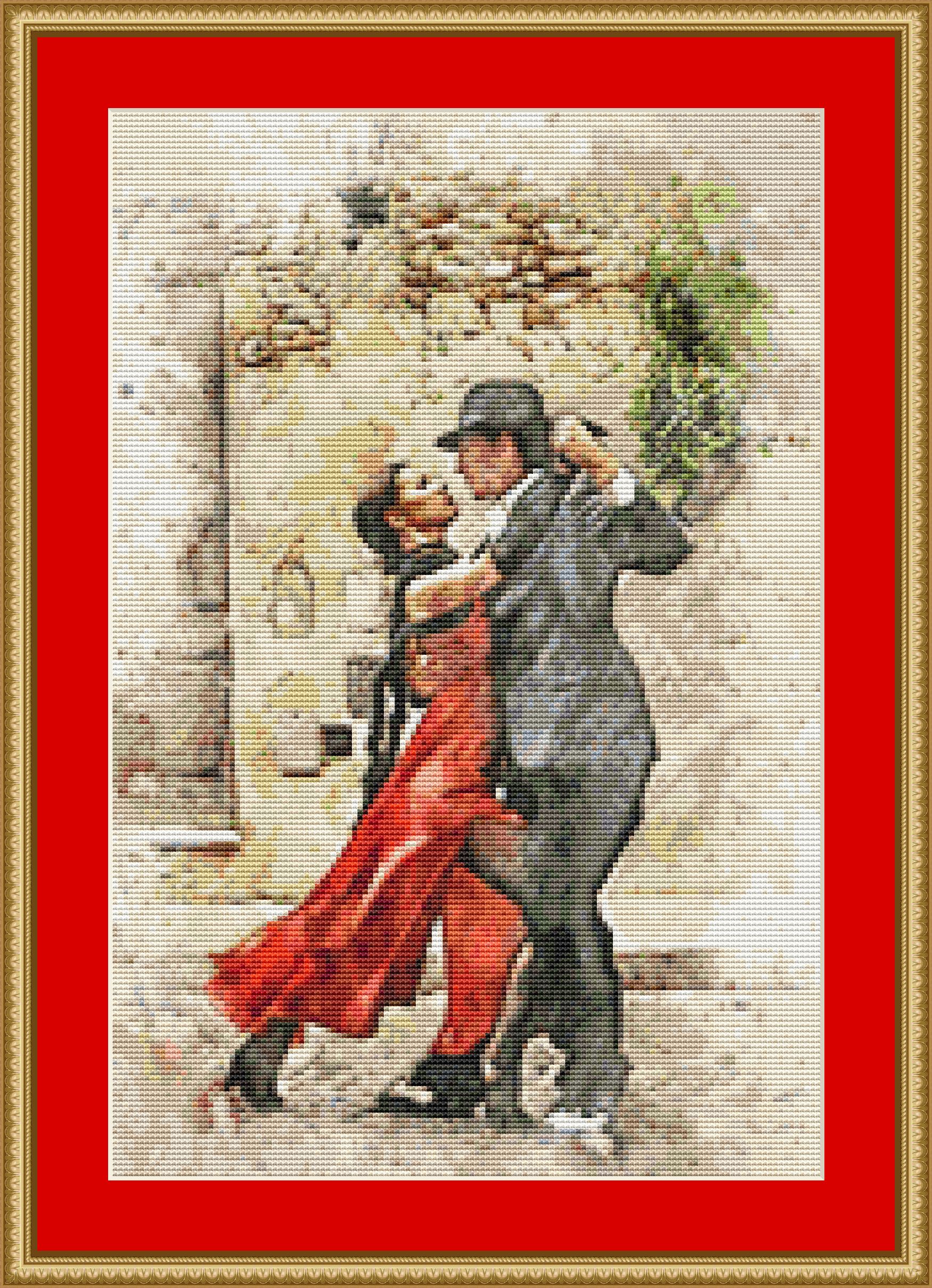 This cross stitch pattern depicts a picture of a couple dancing the tango.