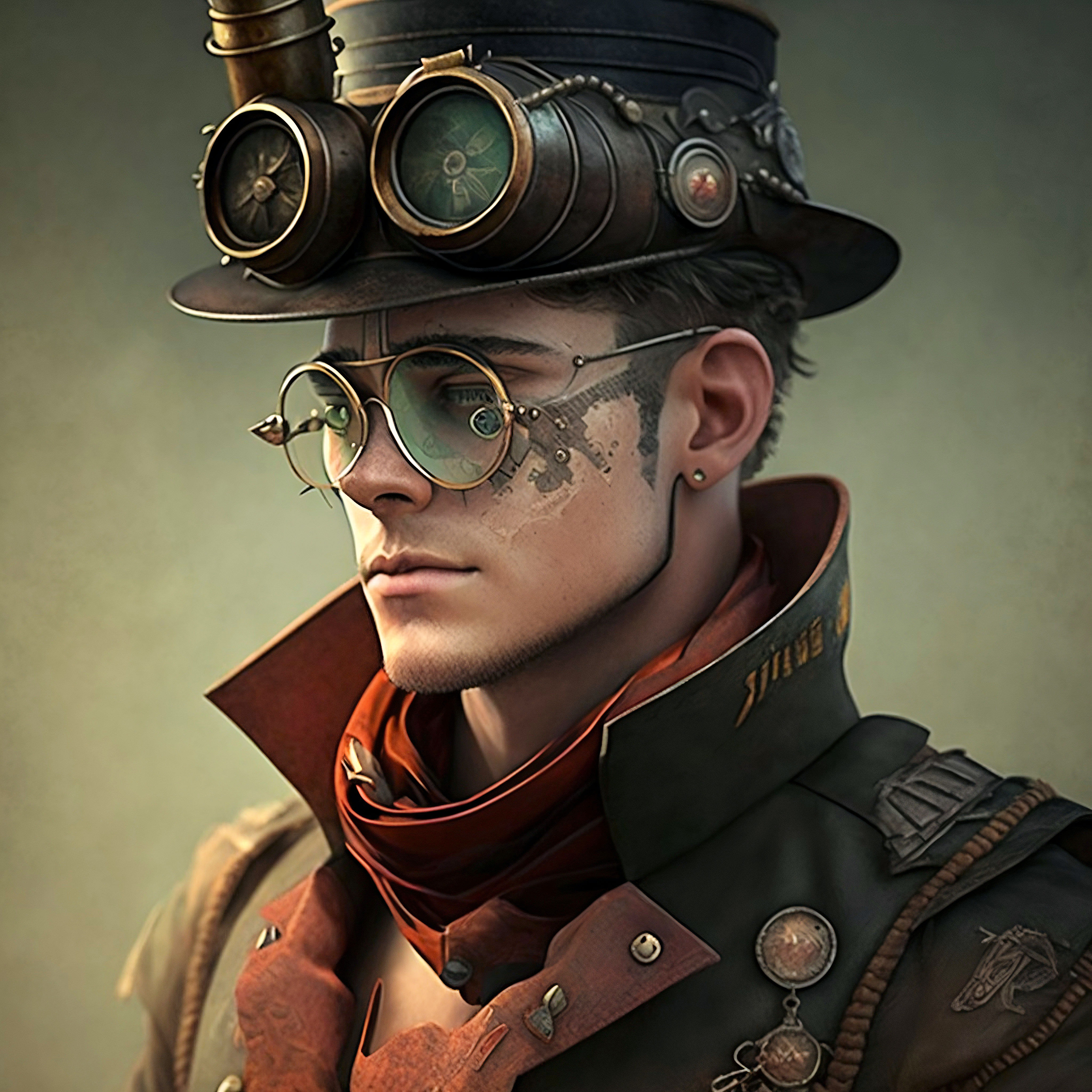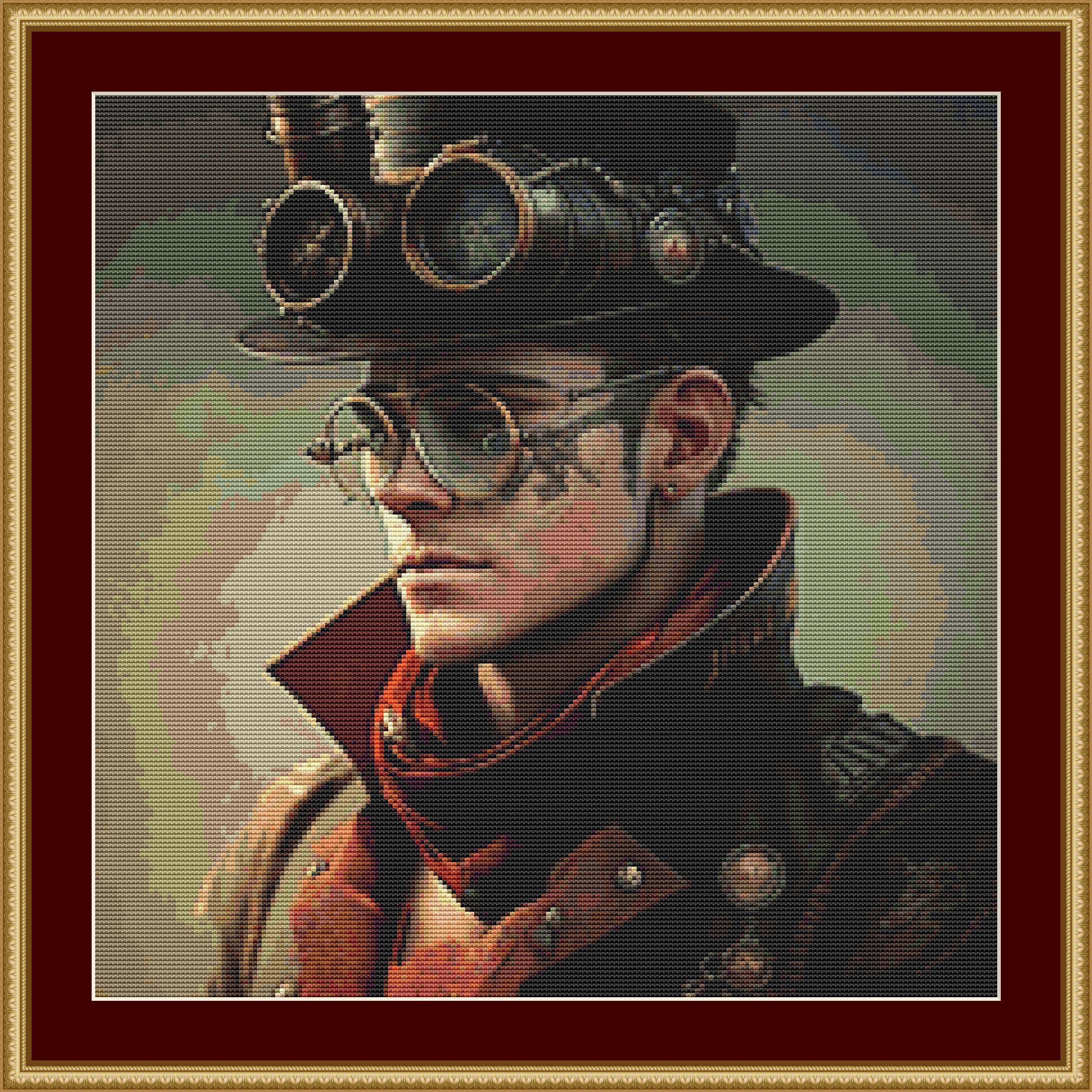 This cross stitch pattern depicts a picture of a steampunk man.