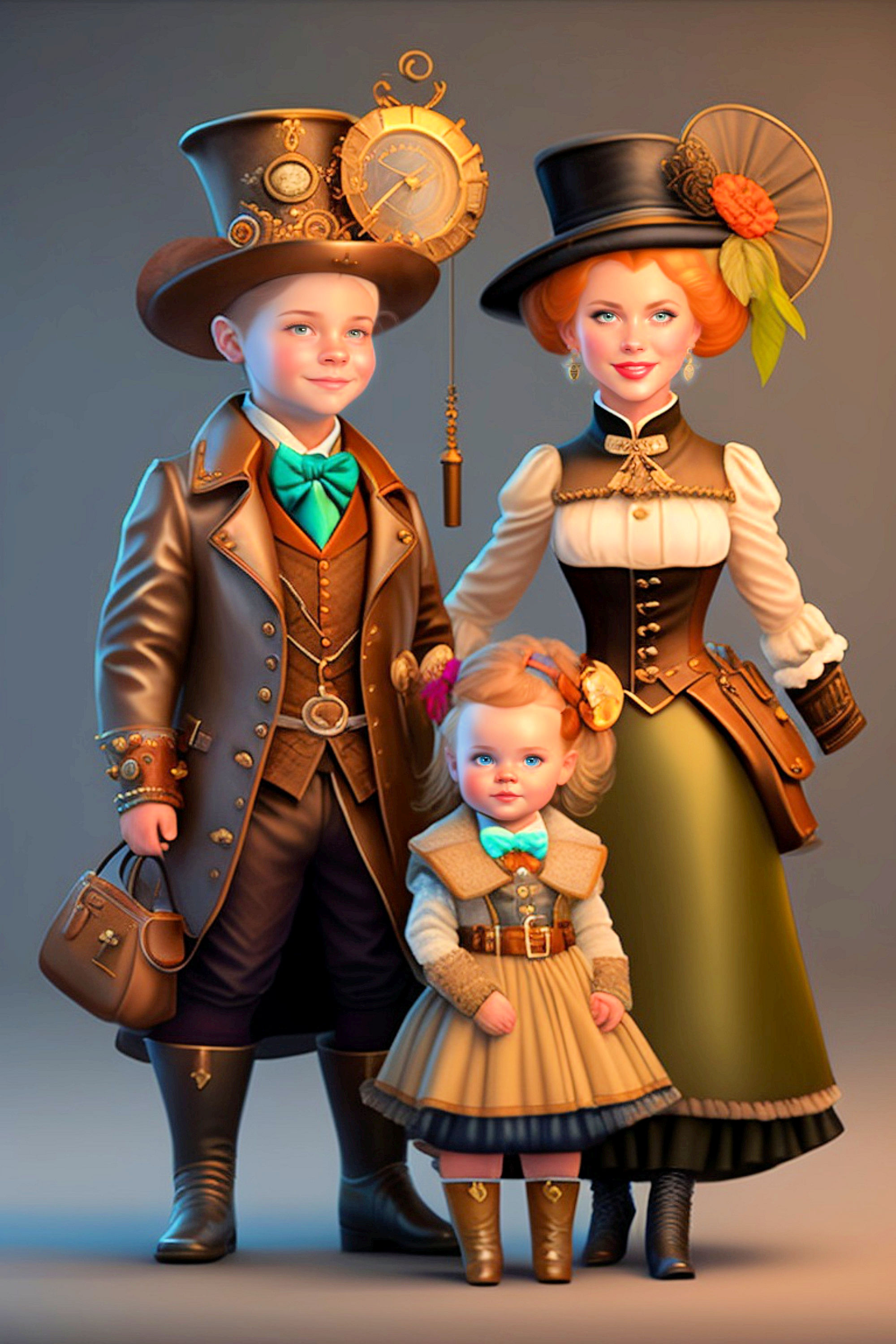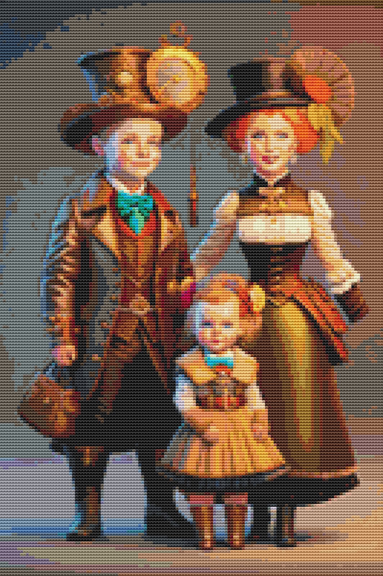 This cross stitch pattern depicts a picture of a mother, father and child in steampunk outfits.