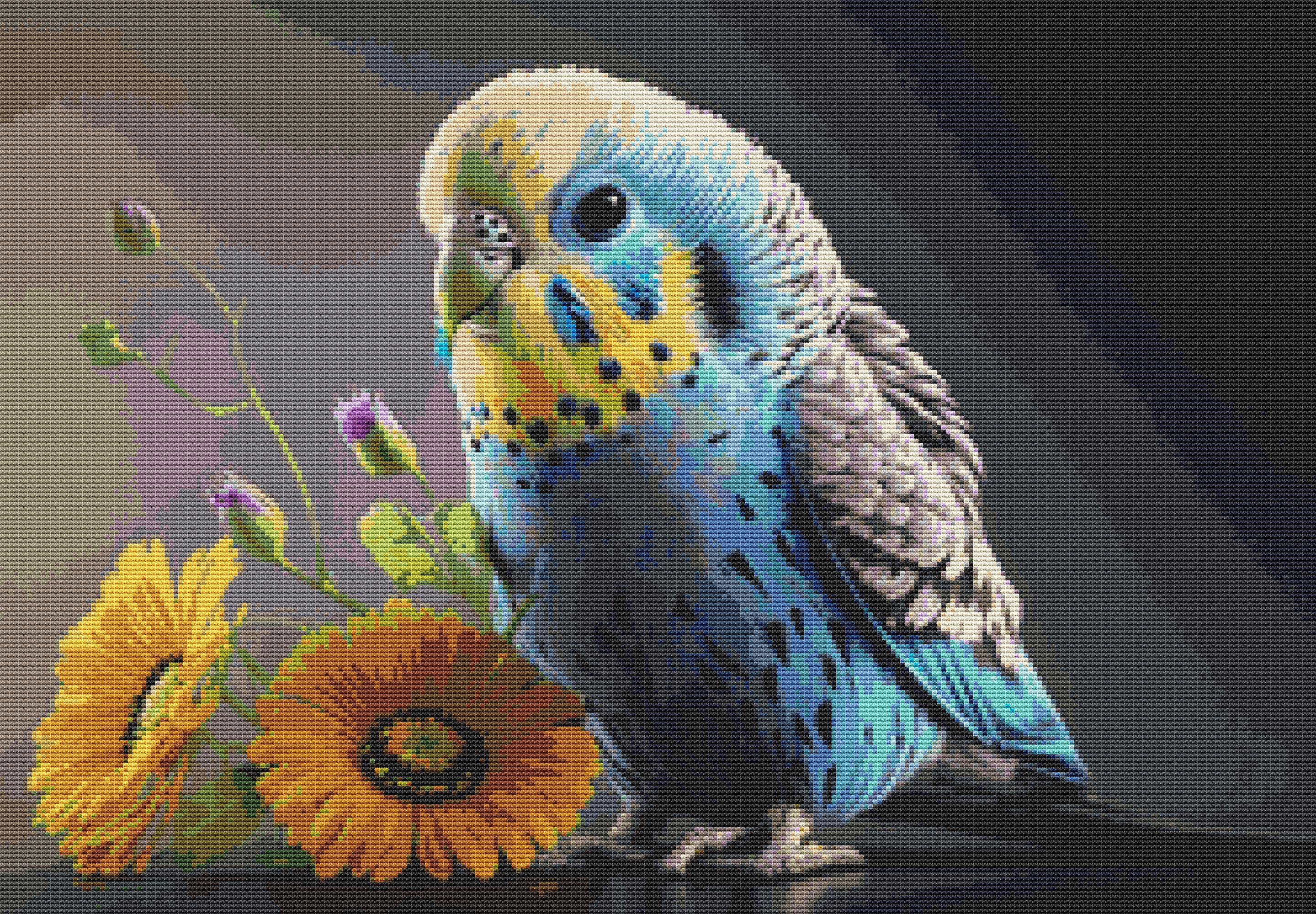 This cross stitch pattern depicts a picture of a pretty budgie.