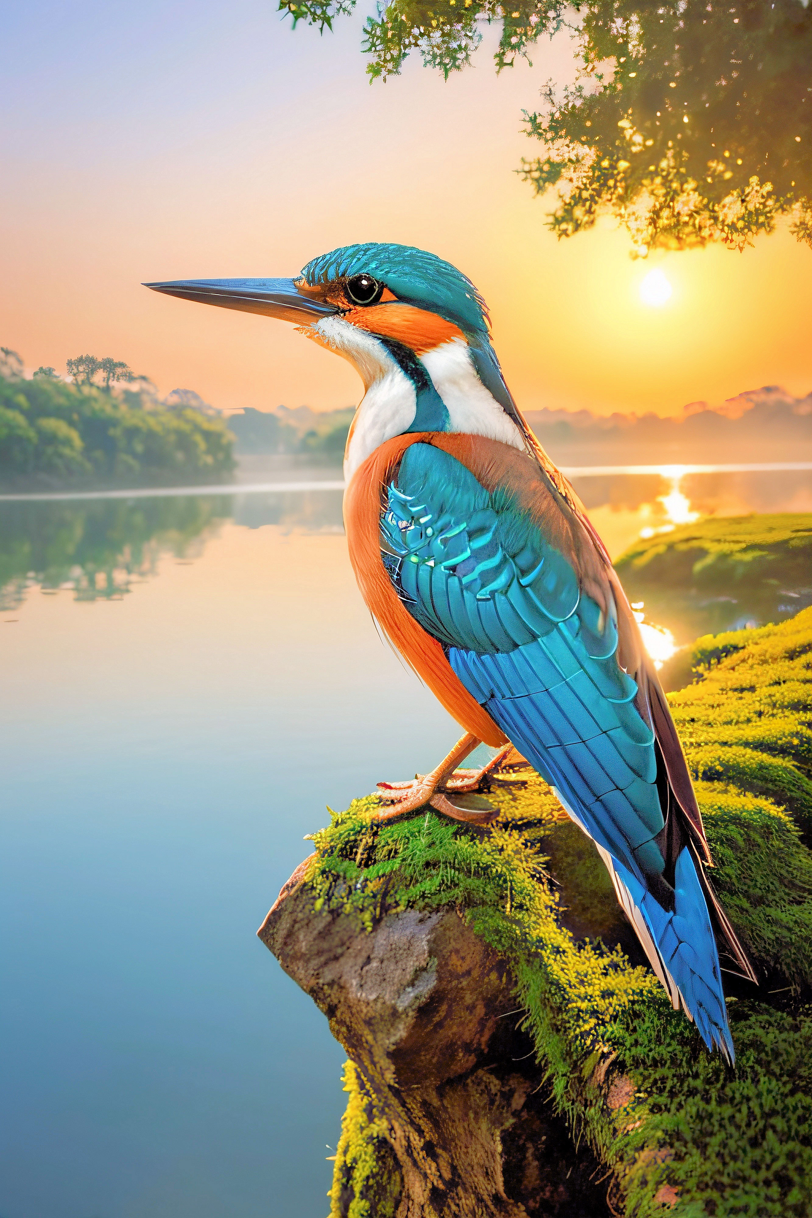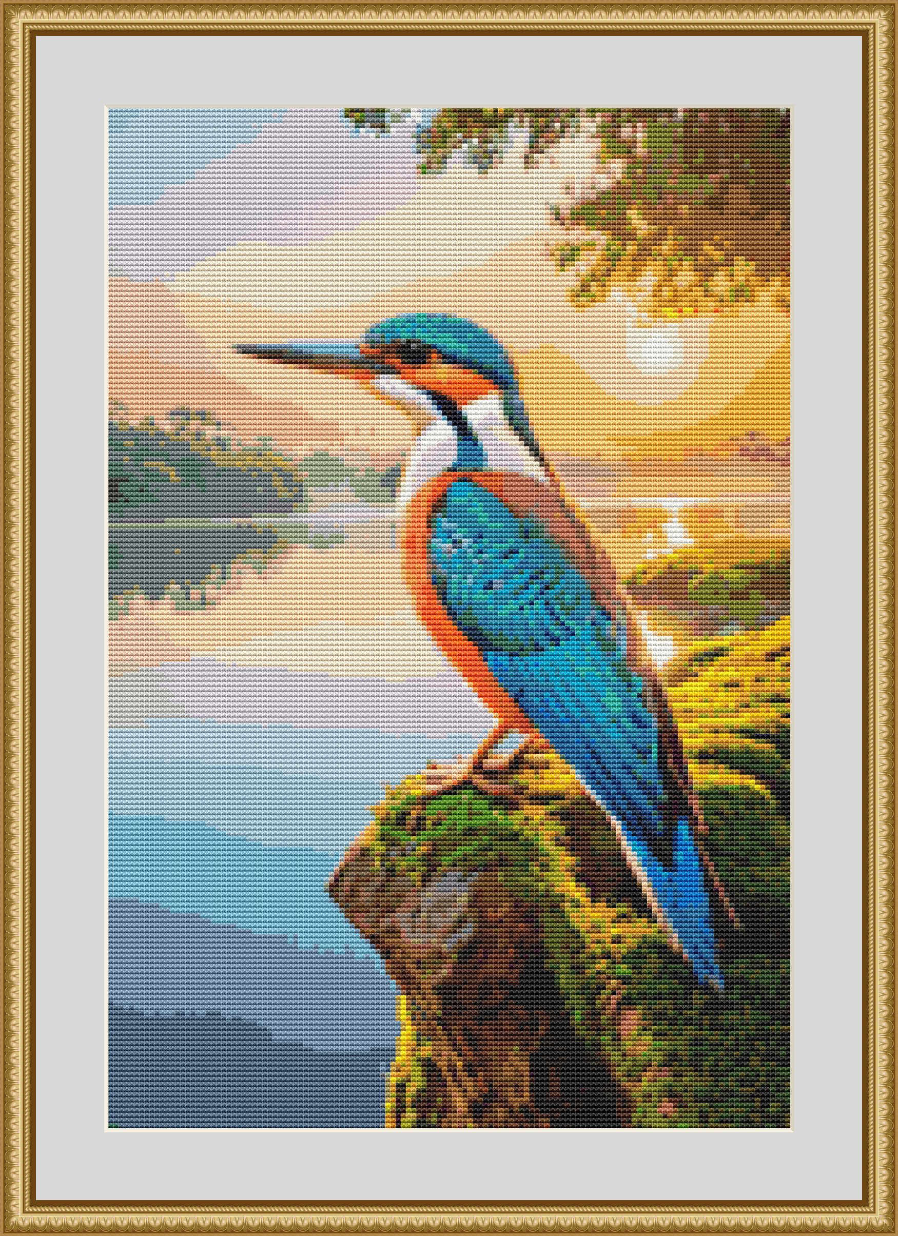This cross stitch pattern depicts a picture of a beautiful Kingfisher bird.