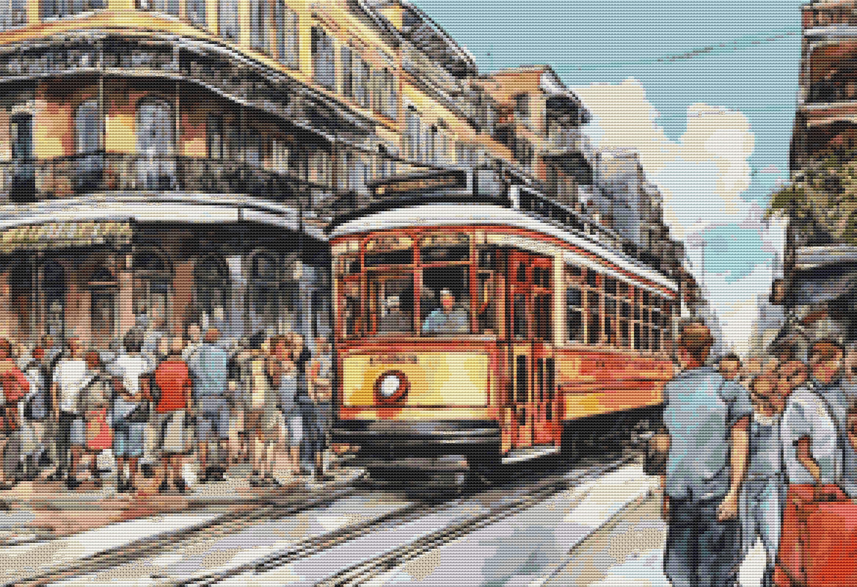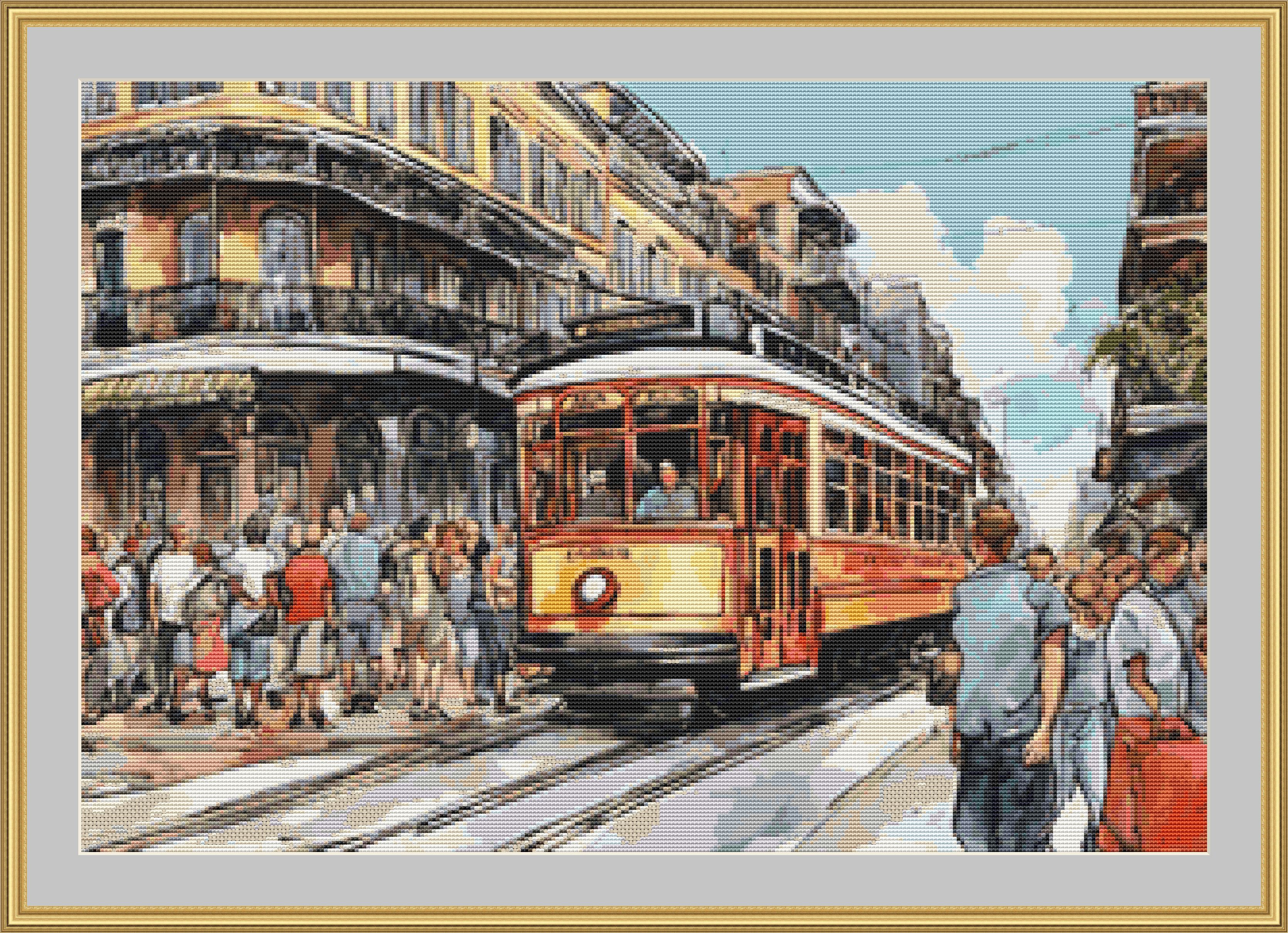This cross stitch pattern depicts a picture of a street in the city of New Orleans.