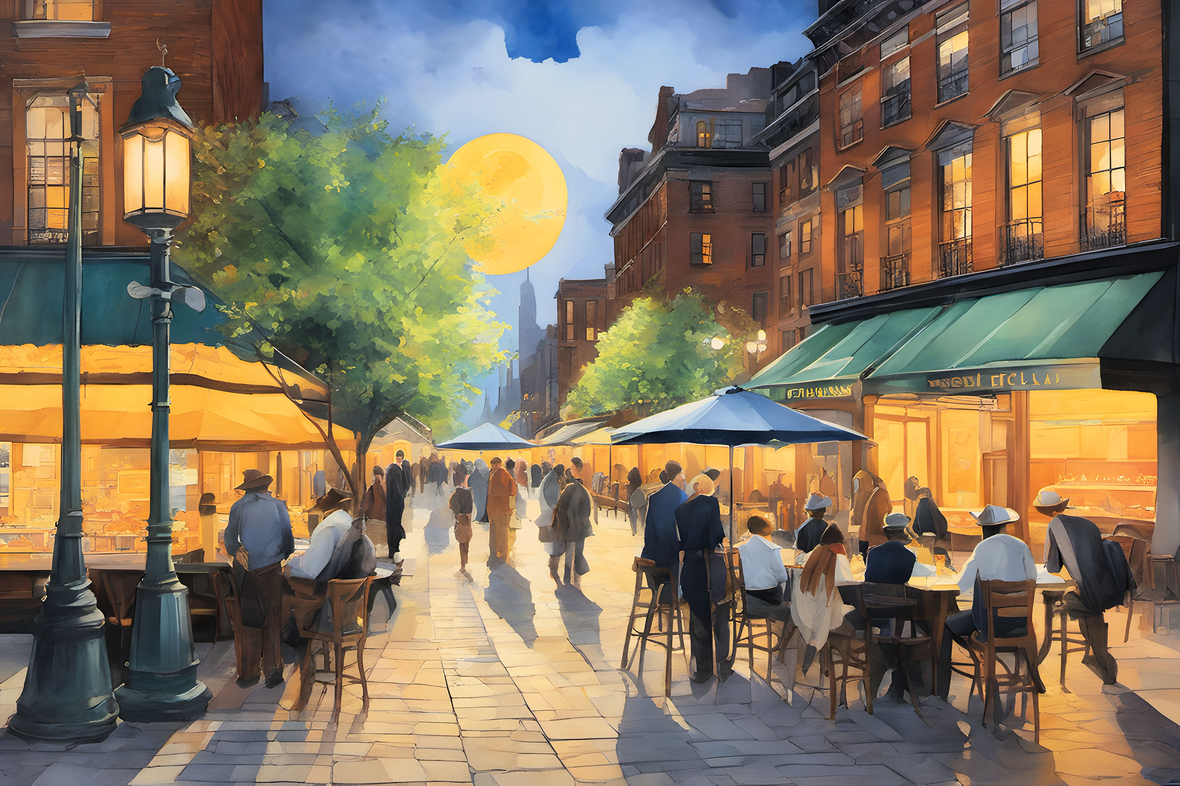This cross stitch pattern depicts a picture of cafes in the evening.