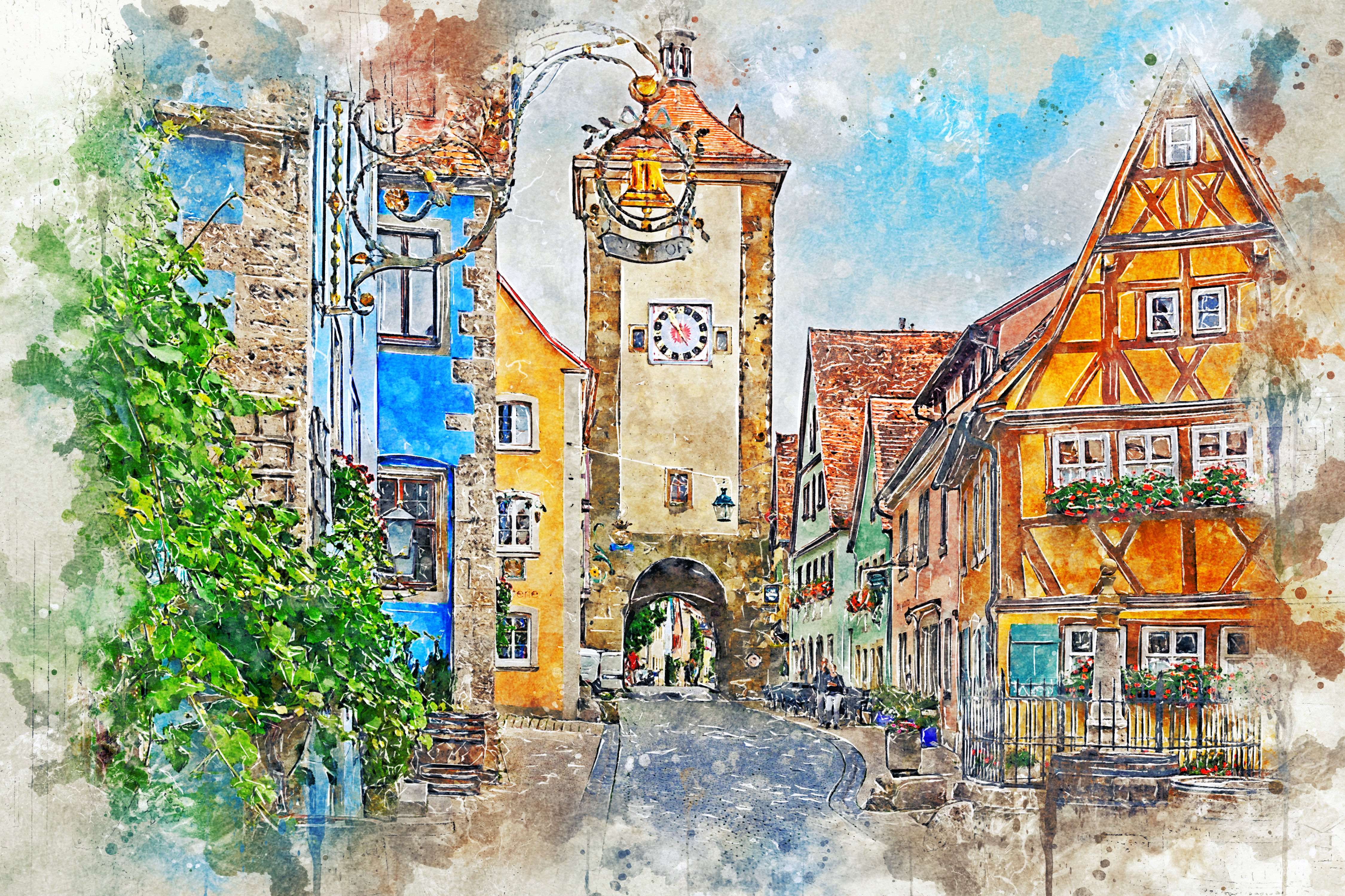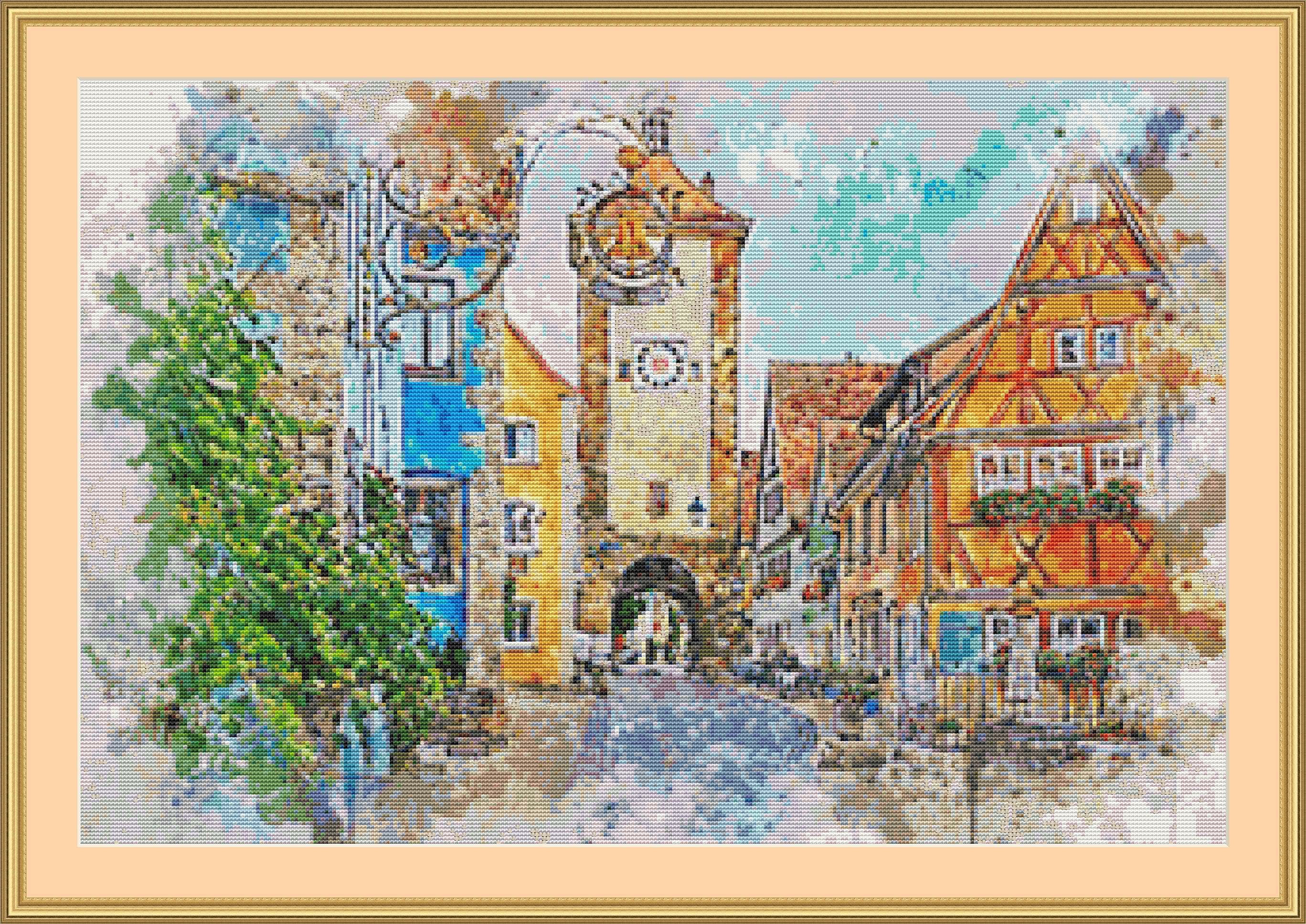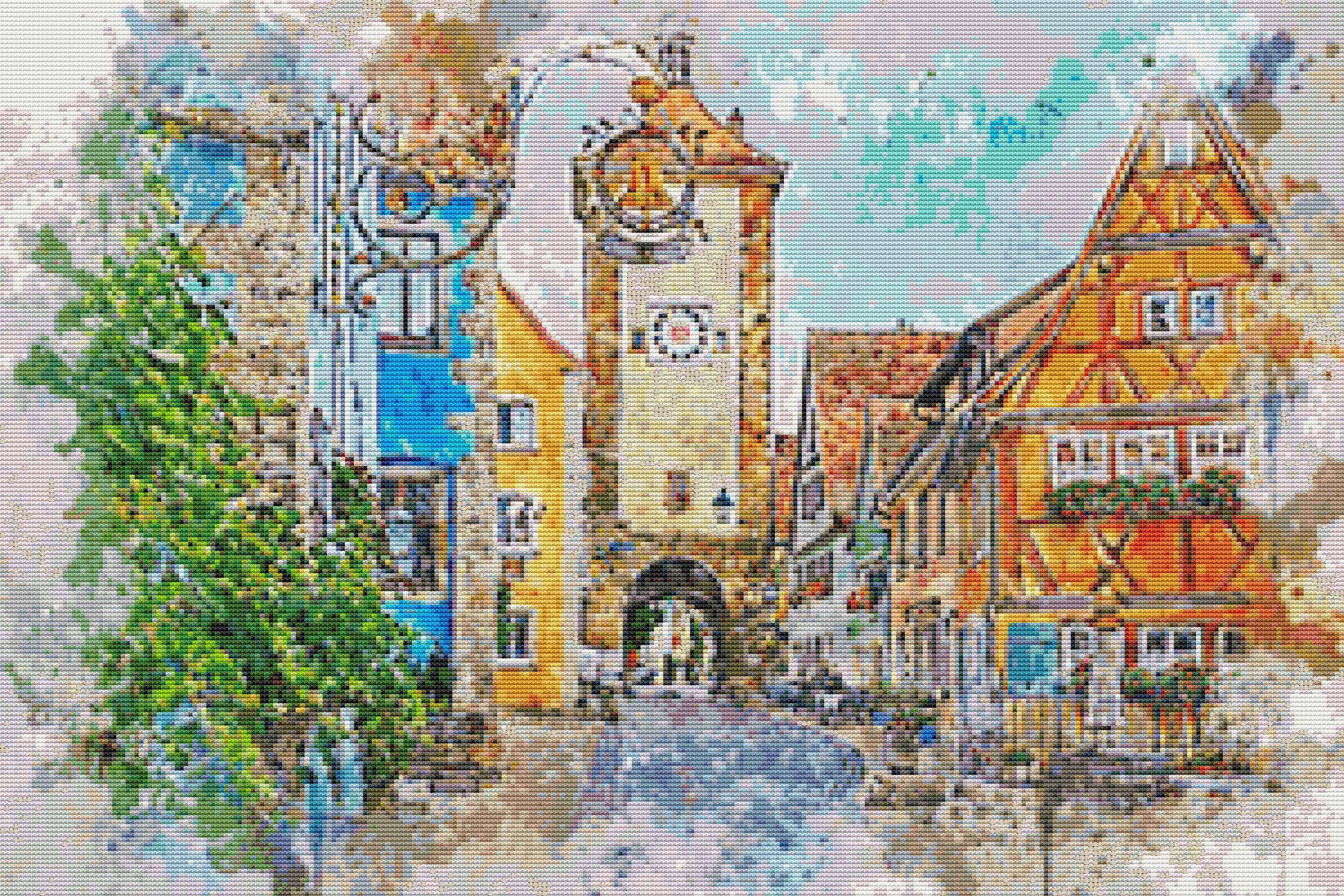 This cross stitch pattern depicts a picture of a clock tower in the centre of a town.