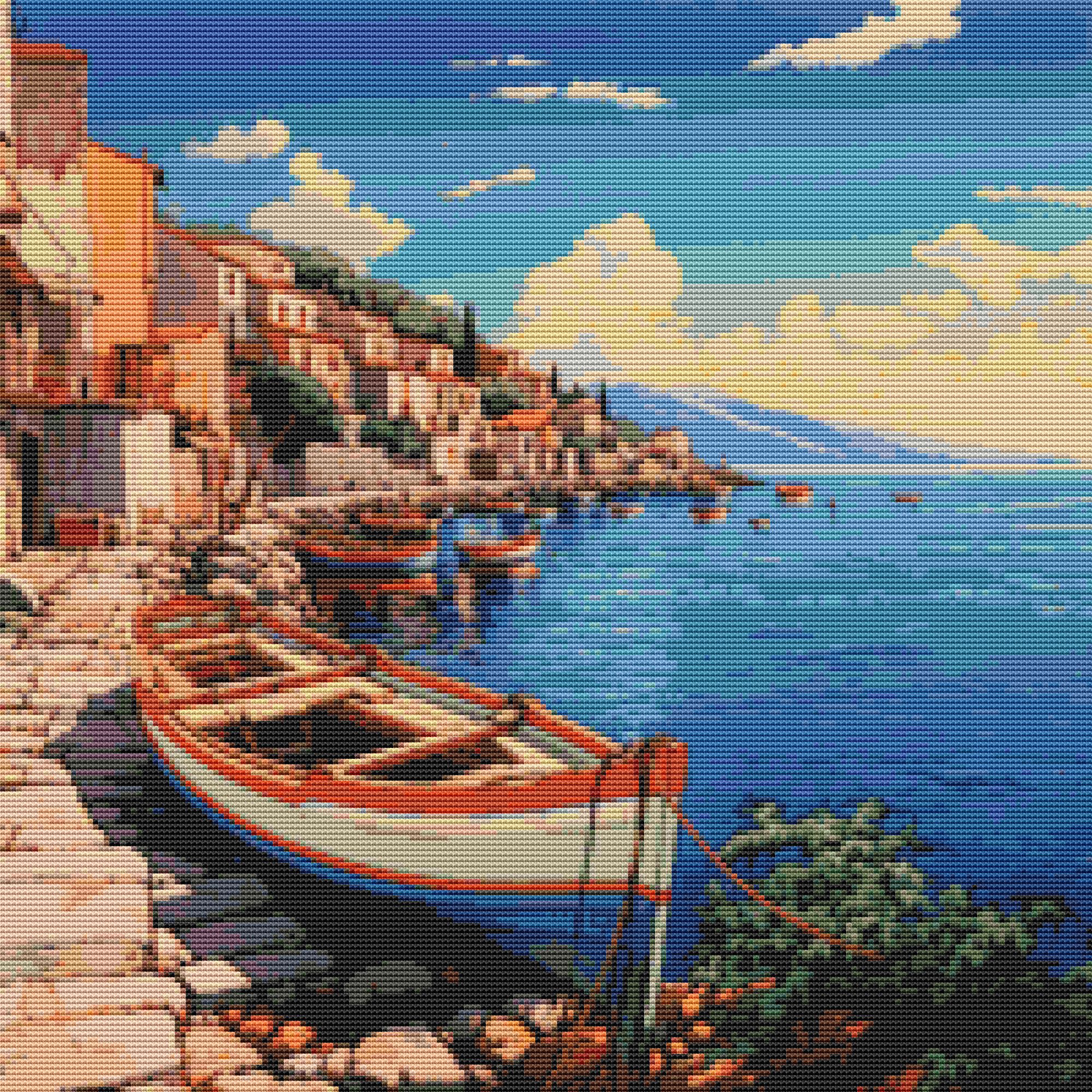This cross stitch pattern depicts a picture of a small boat on the shoreline.