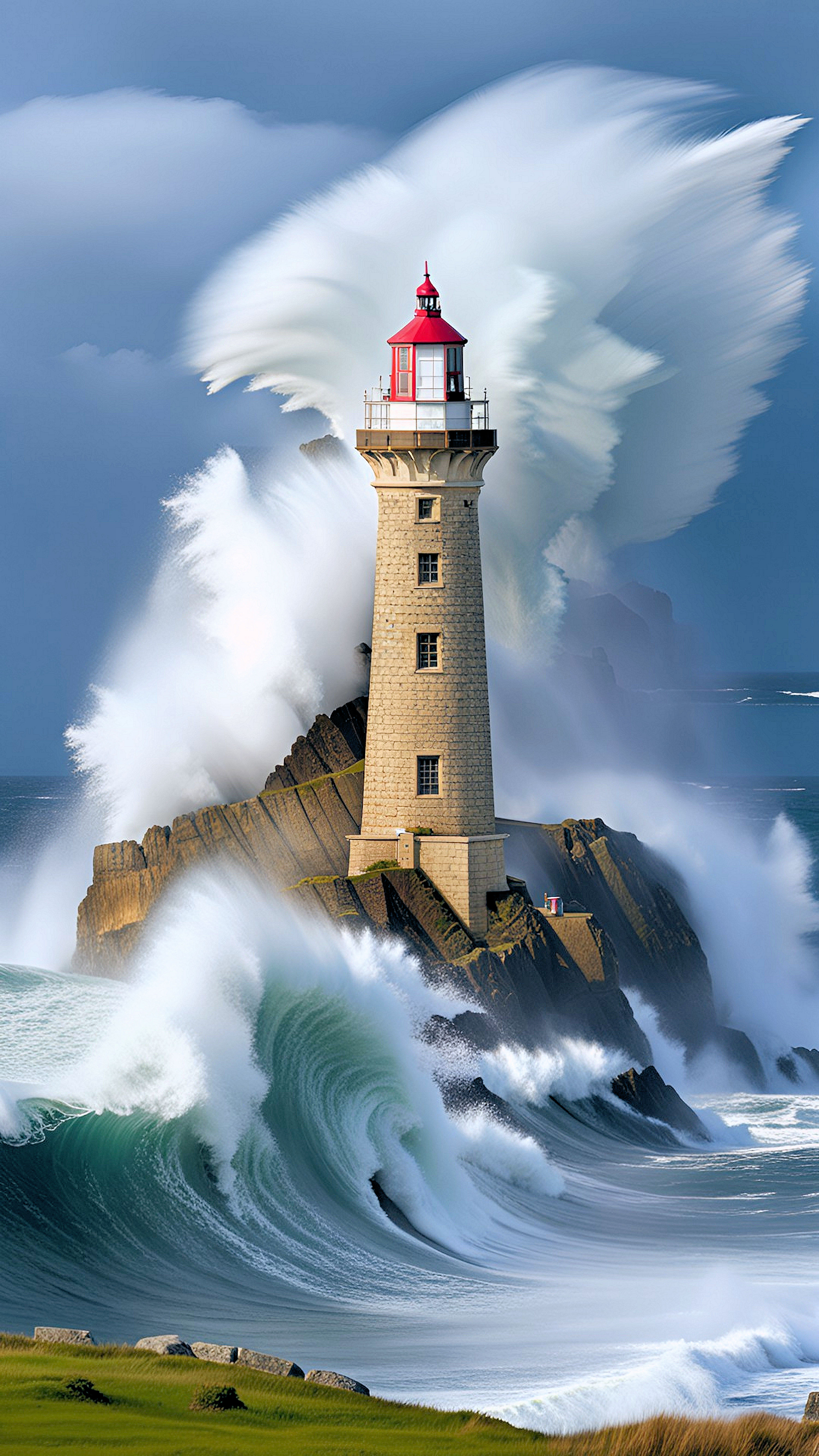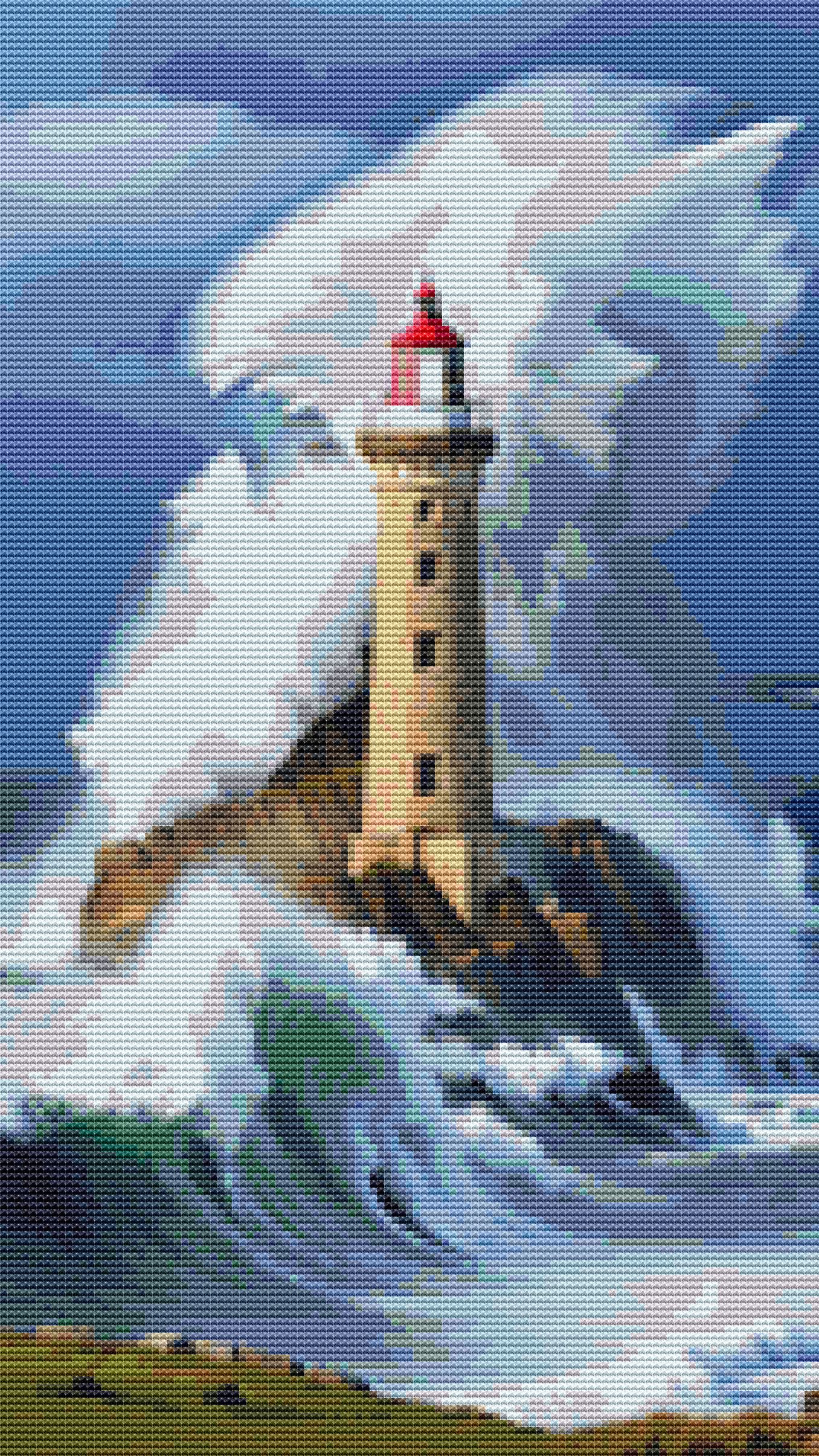 This cross stitch pattern depicts a picture of a lighthouse brave the storm.