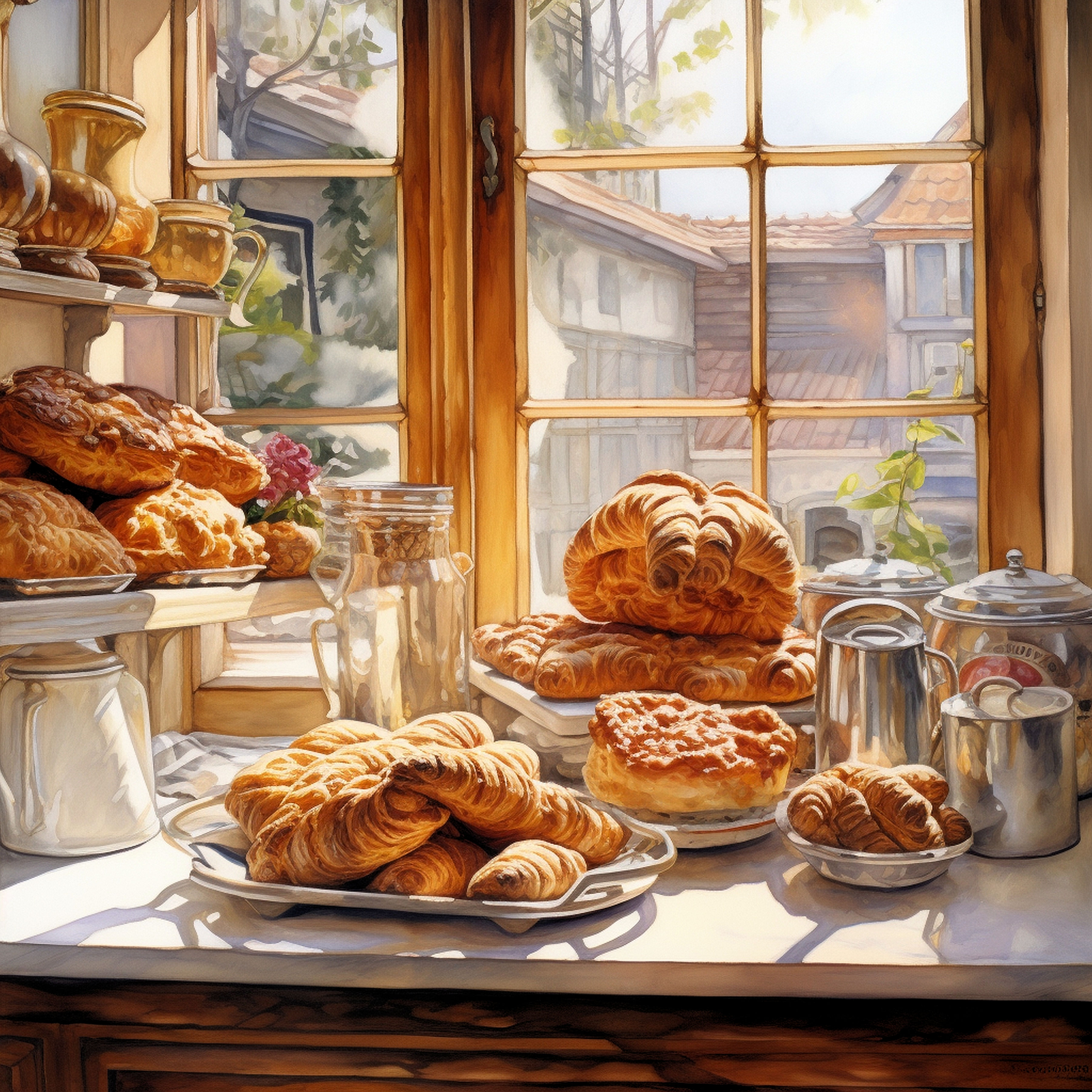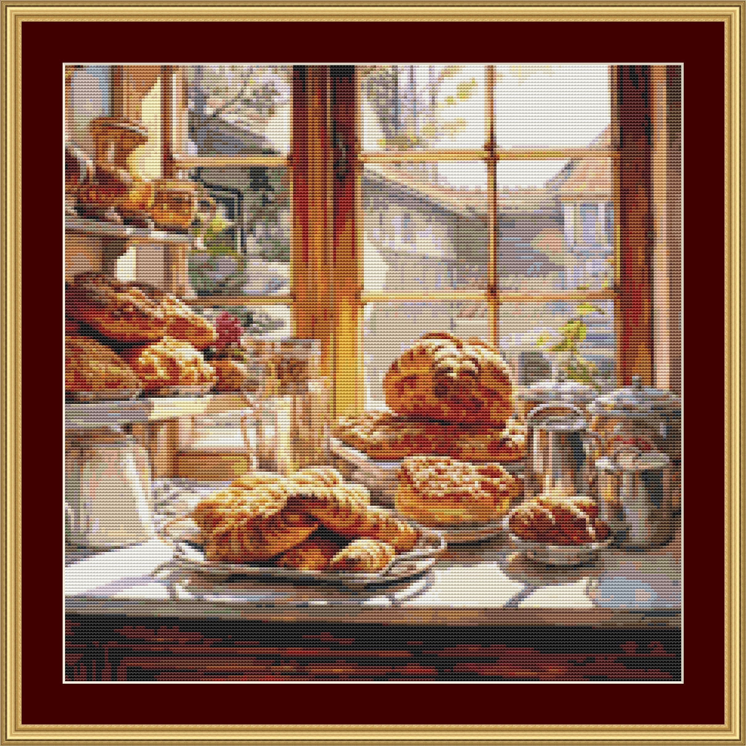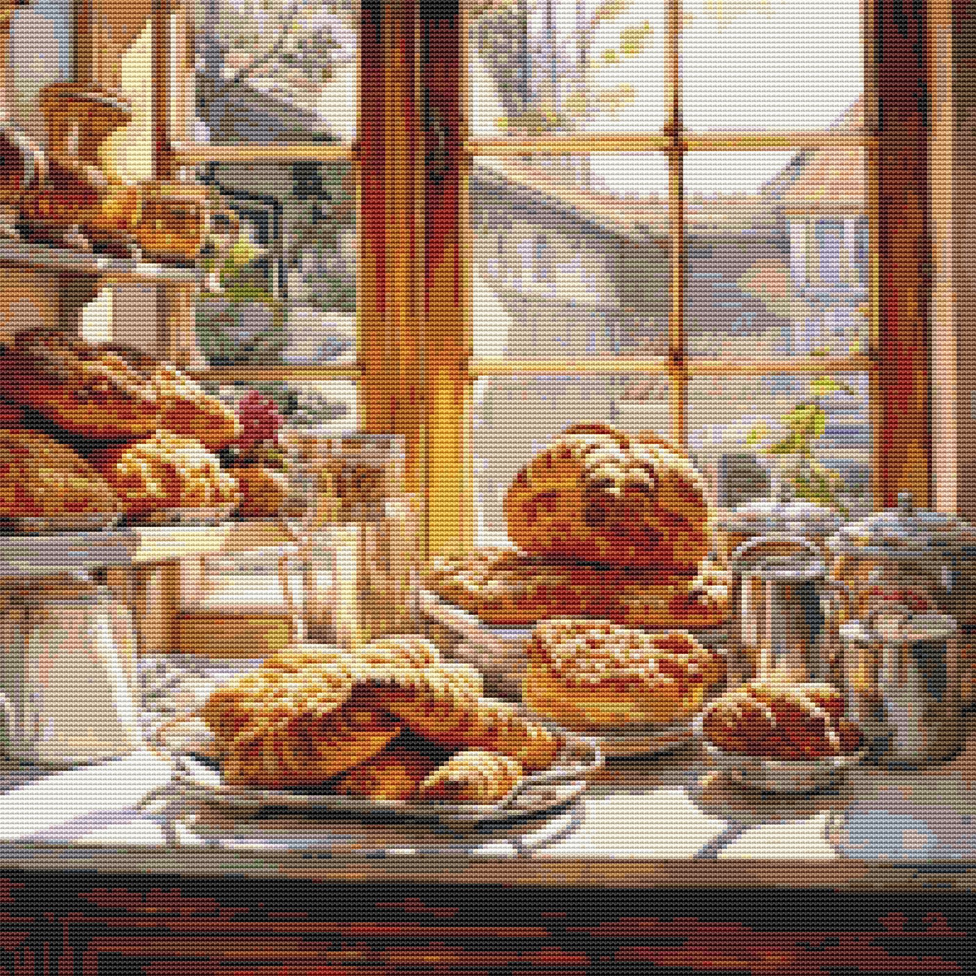This cross stitch pattern depicts a picture of all the bakery in a window.