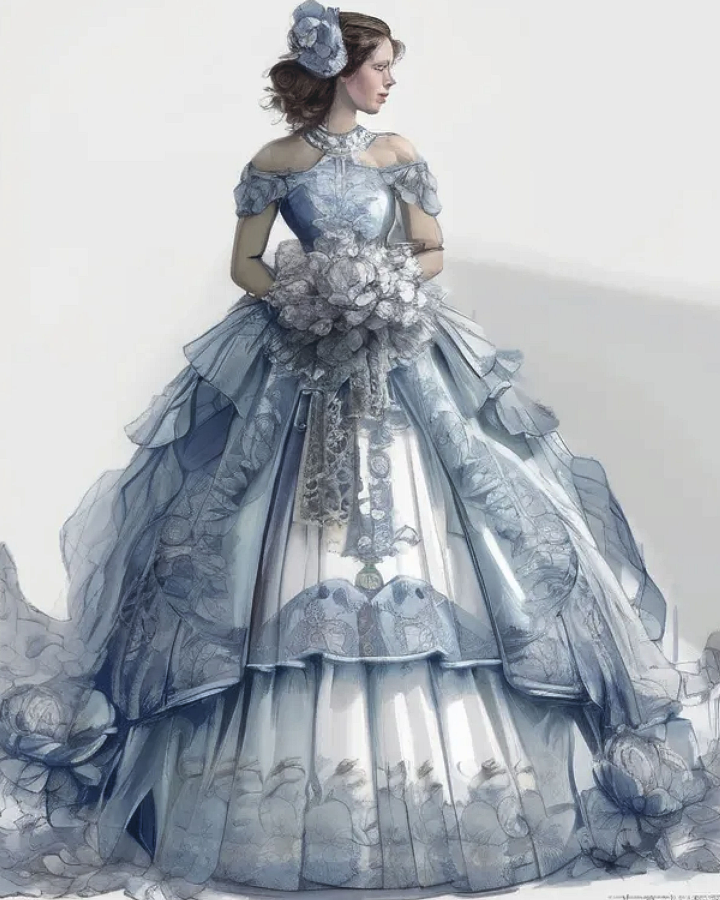 This cross stitch pattern depicts a picture of a young woman dressed in a stunning gown from the Victorian era.