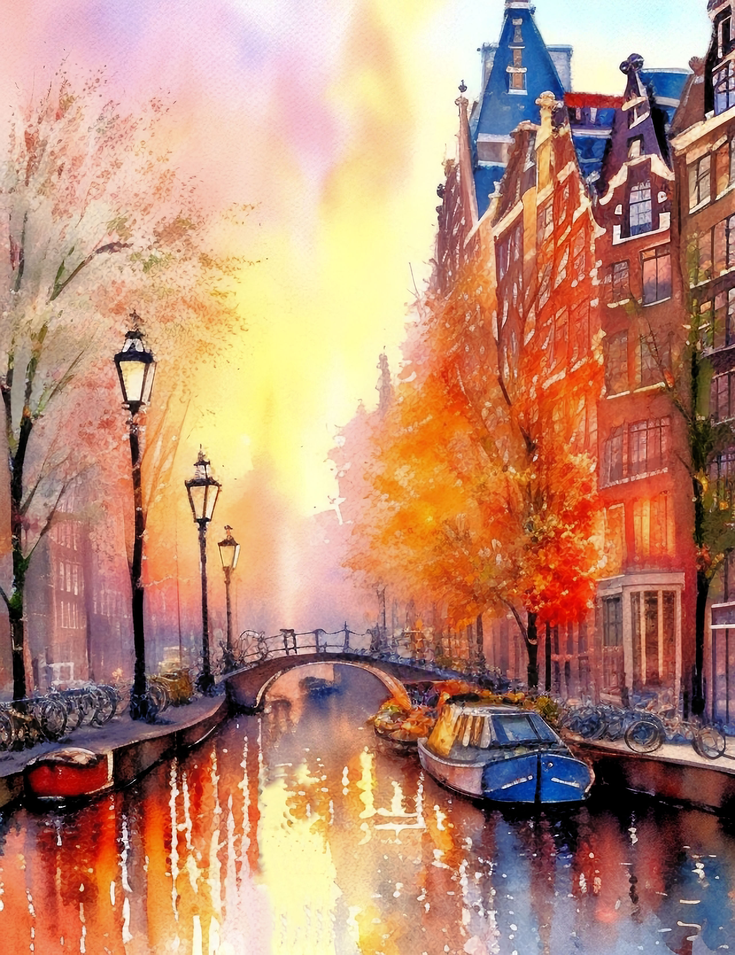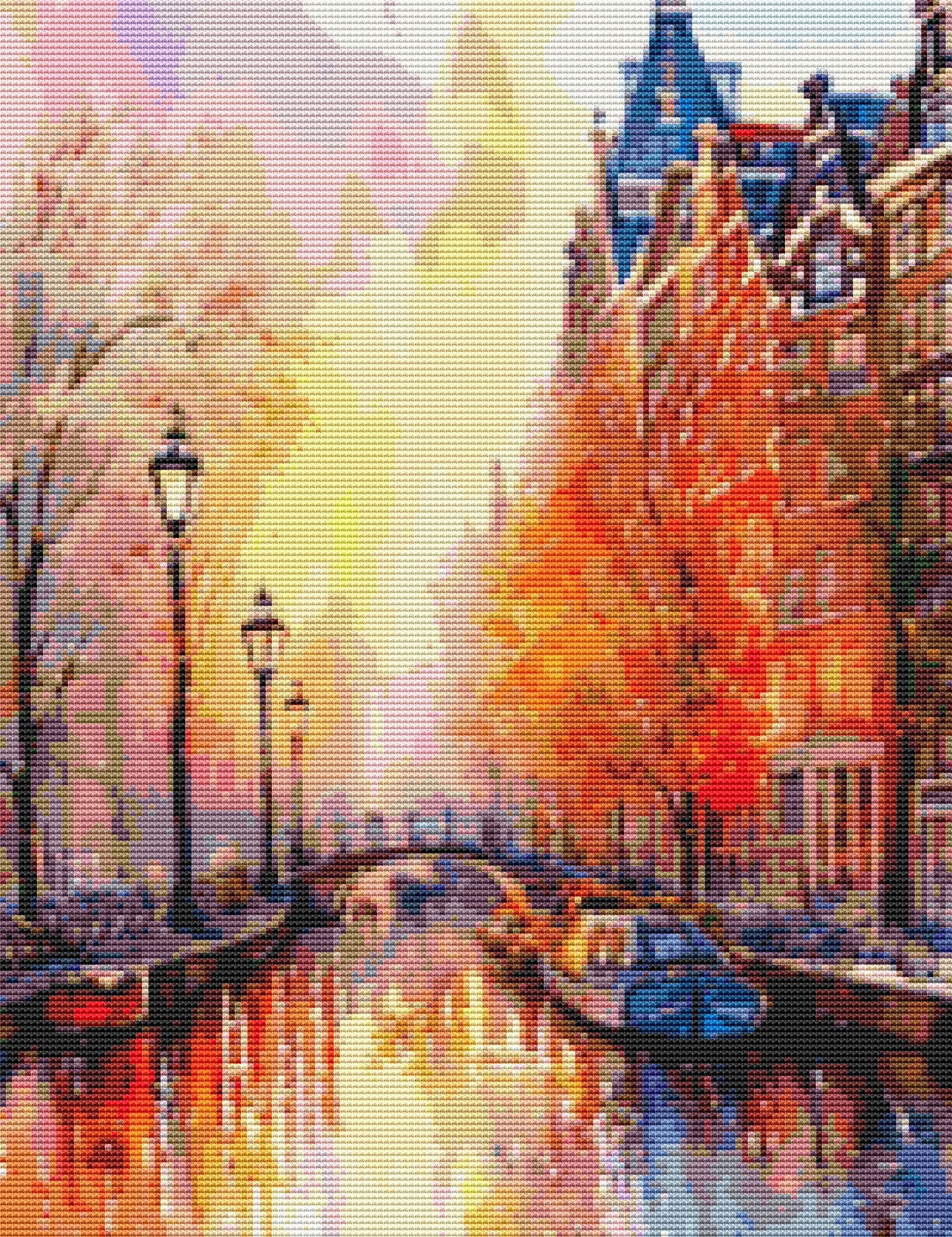 This cross stitch pattern depicts a picture of a view of one of the canals in Amsterdam.
