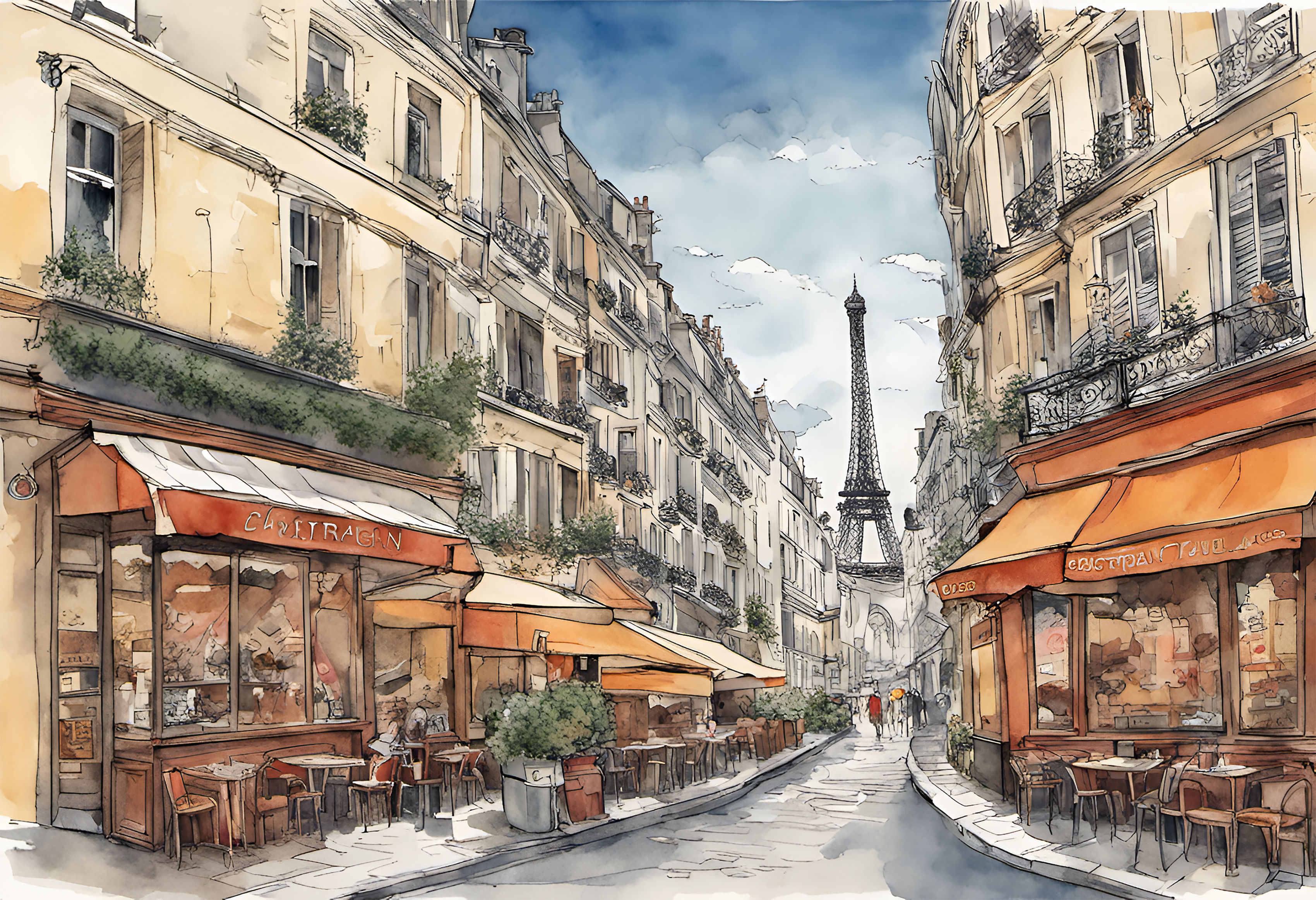 This cross stitch pattern depicts a picture of a street with cafes in Paris.