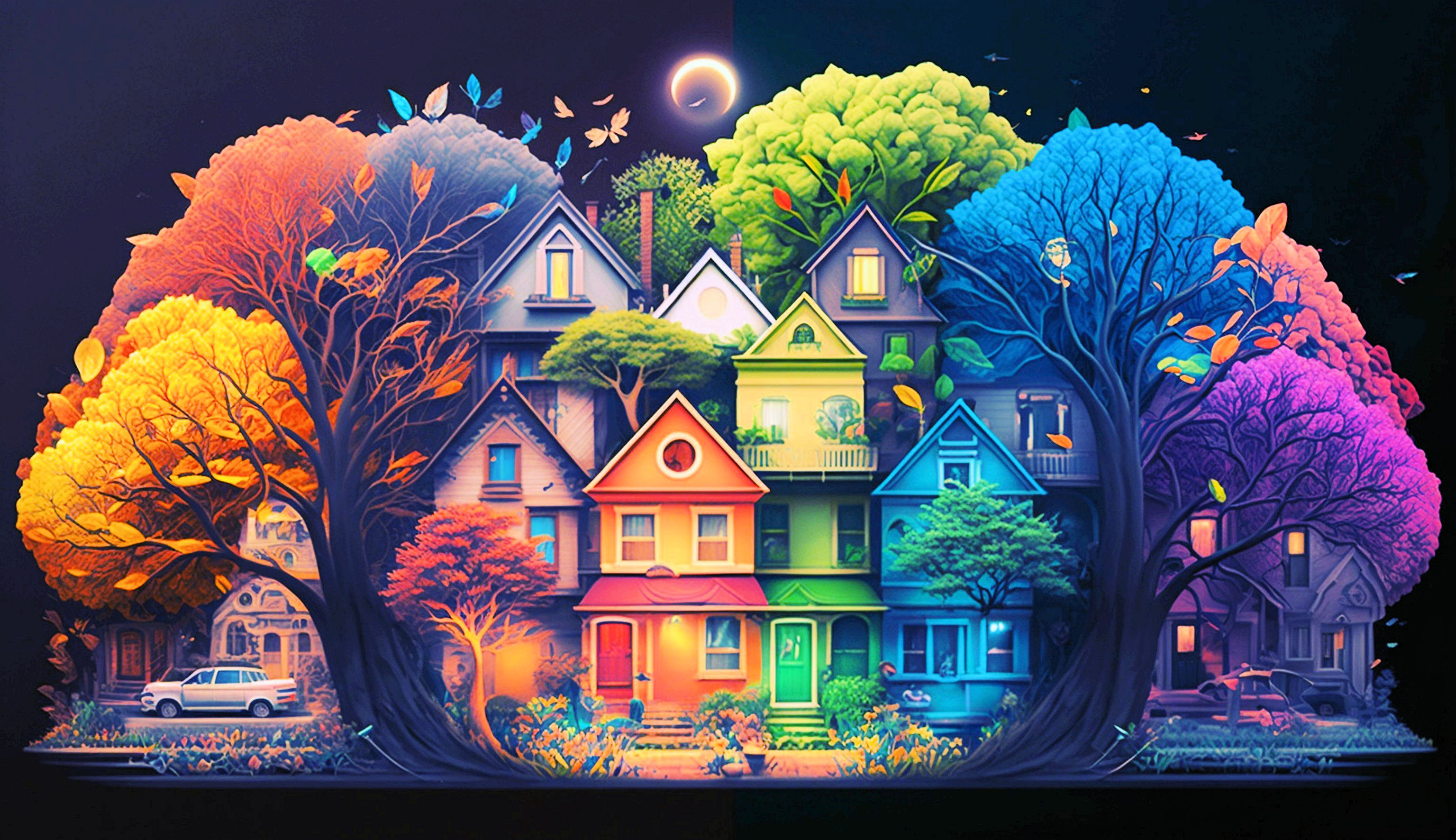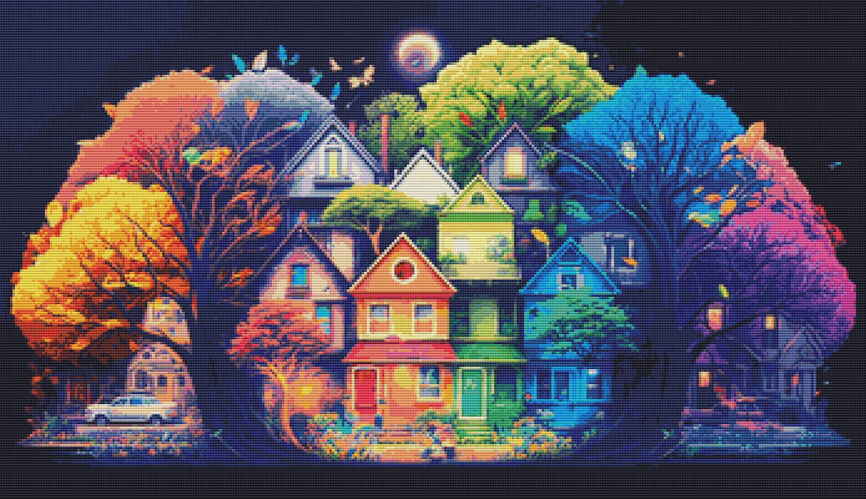 This cross stitch pattern depicts a picture of a street of colourful houses.