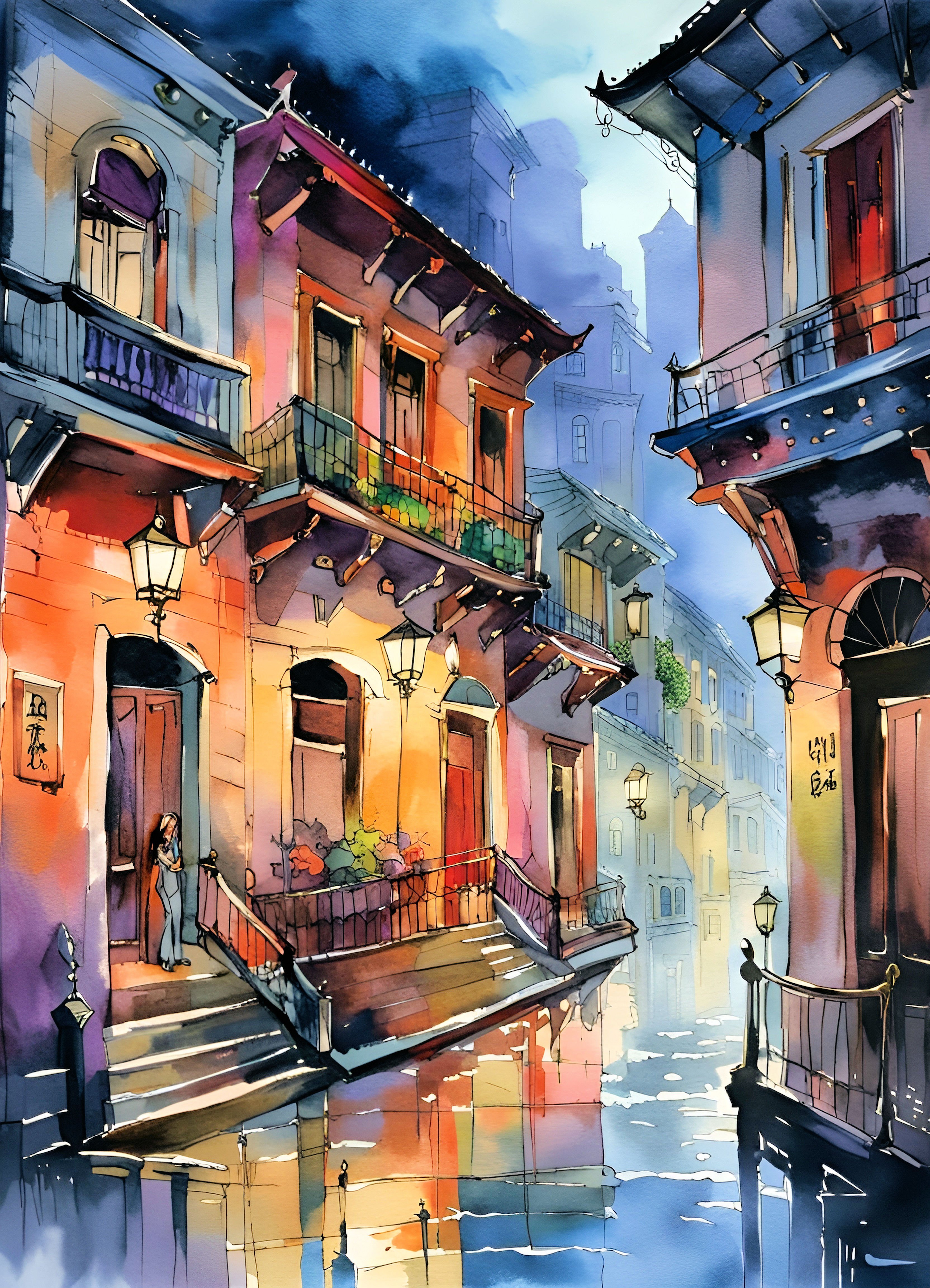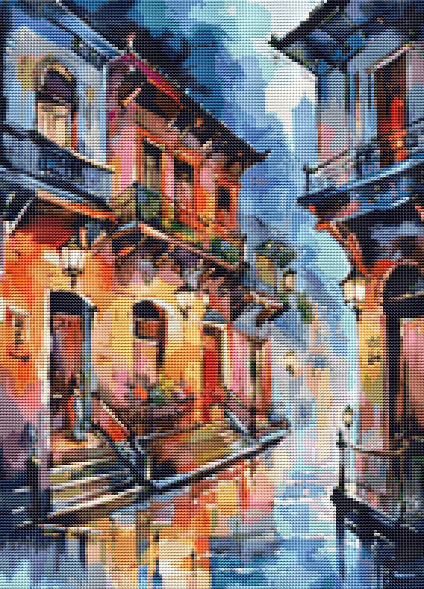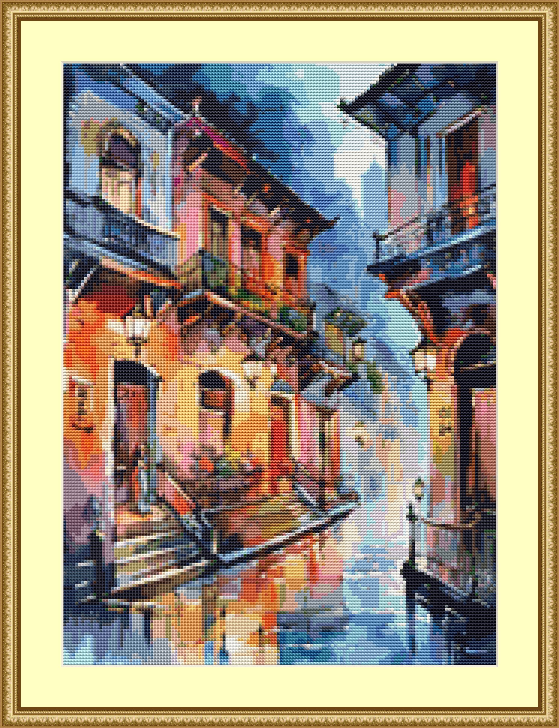 This cross stitch pattern depicts a picture of a lonely wet street.
