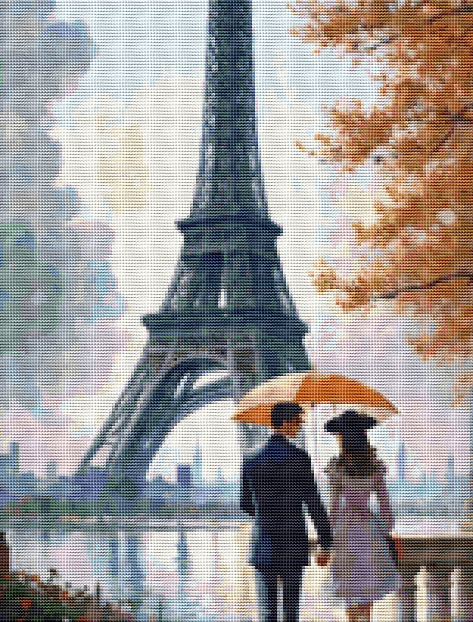 This cross stitch pattern depicts a picture of the iconic land mark in Paris.