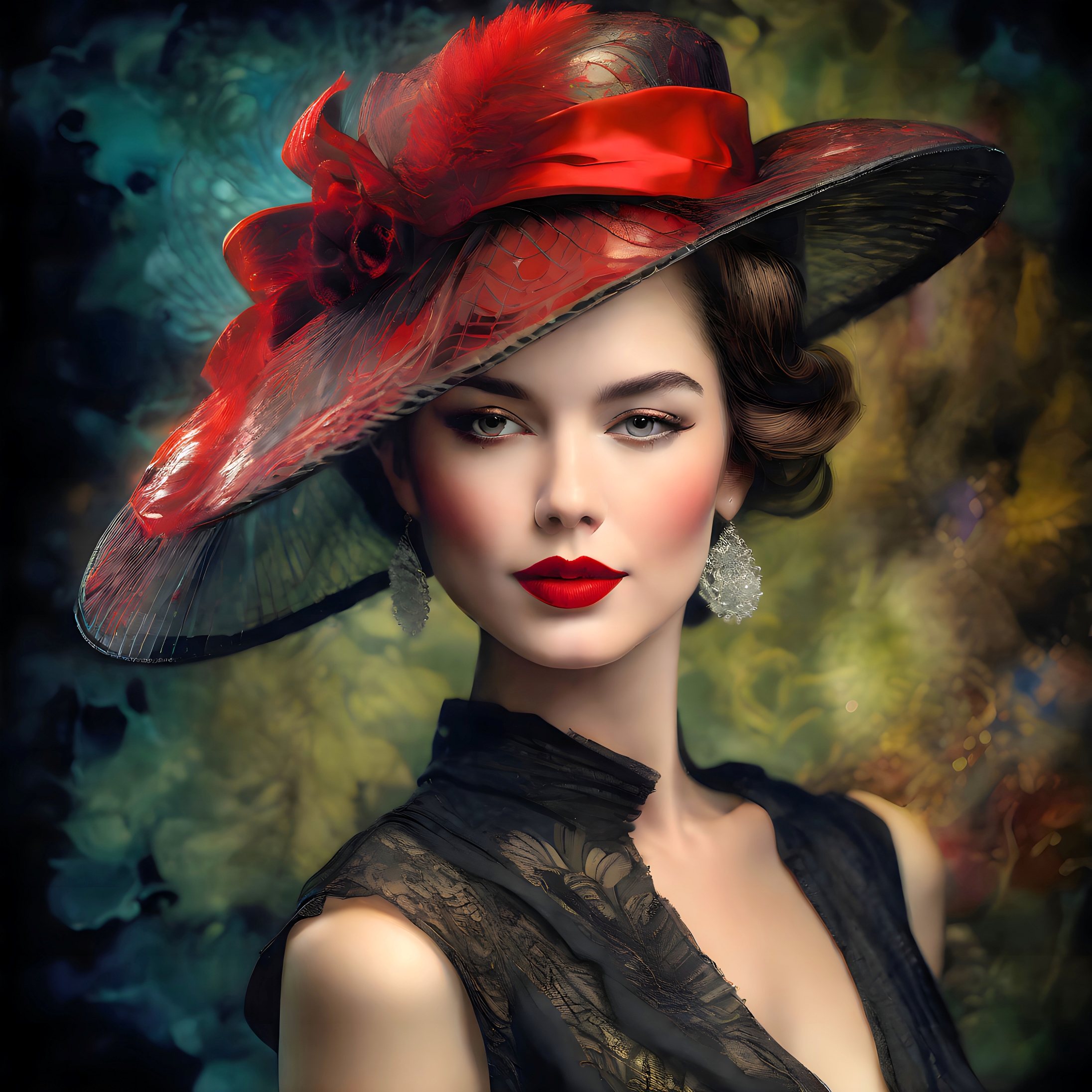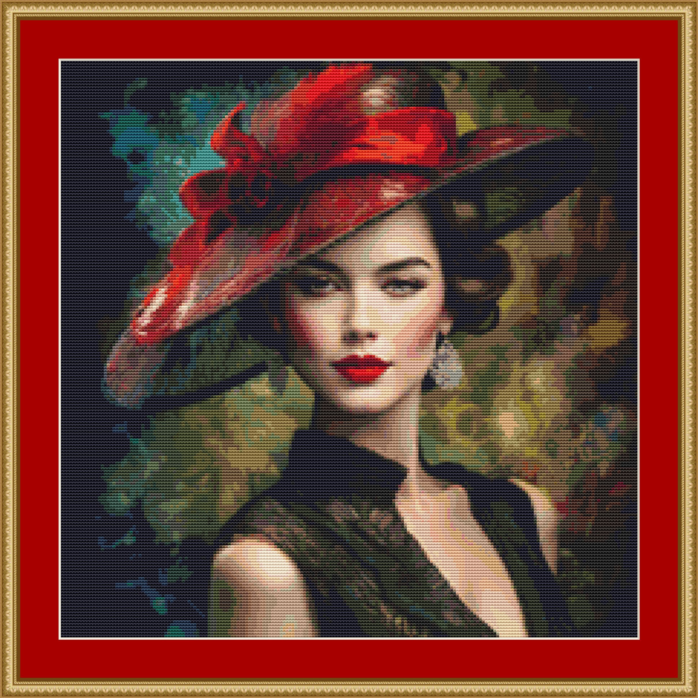 This cross stitch pattern depicts a picture of a beautiful woman wearing a red hat with a red ribbon on it.