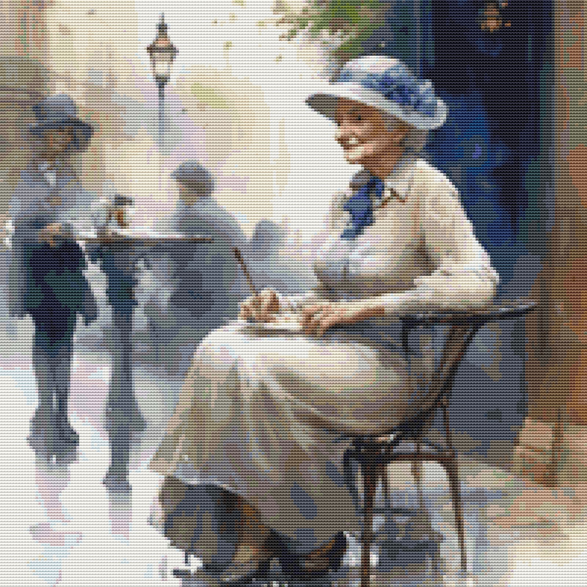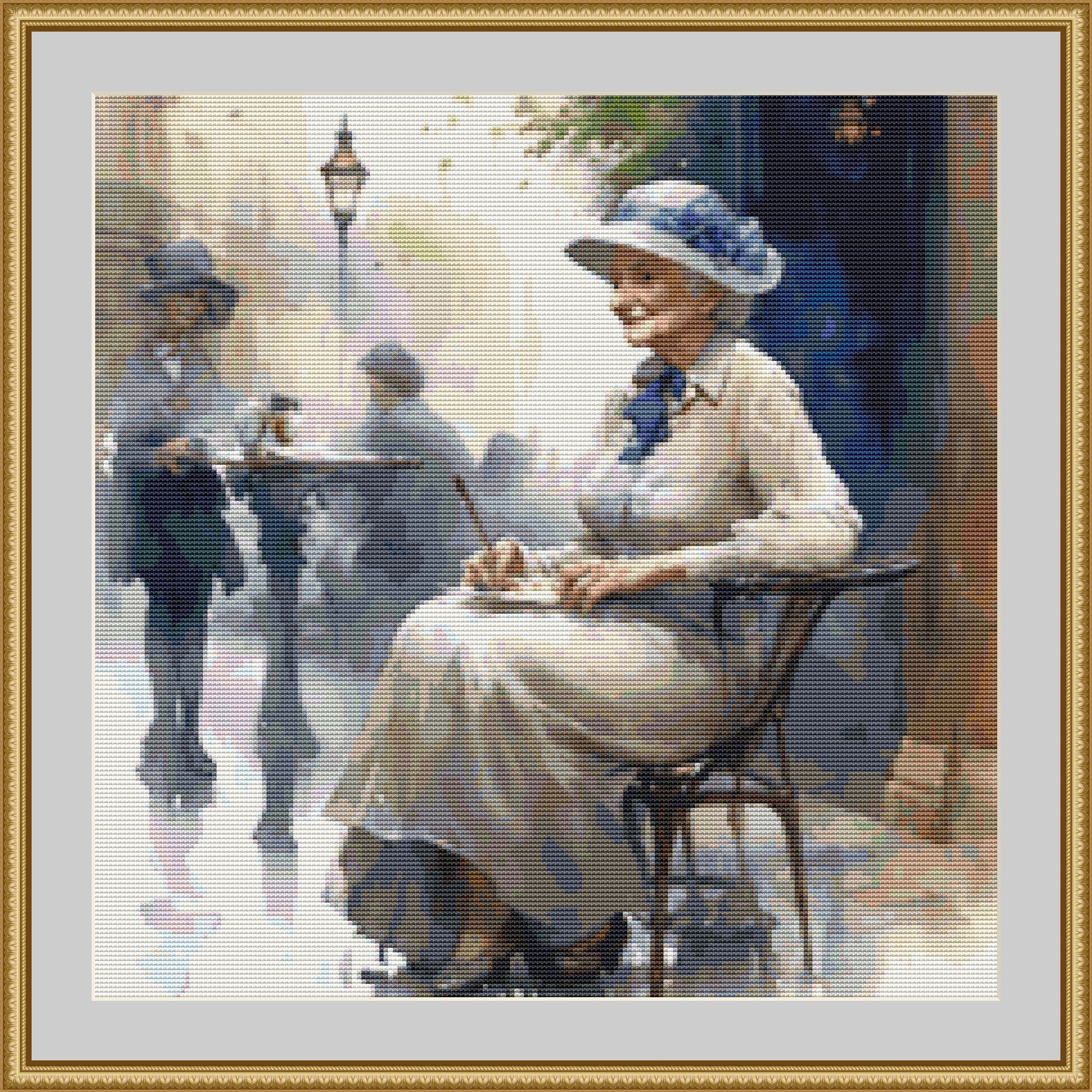 This cross stitch pattern depicts a picture of a lady sat at a cafe table relaxing.