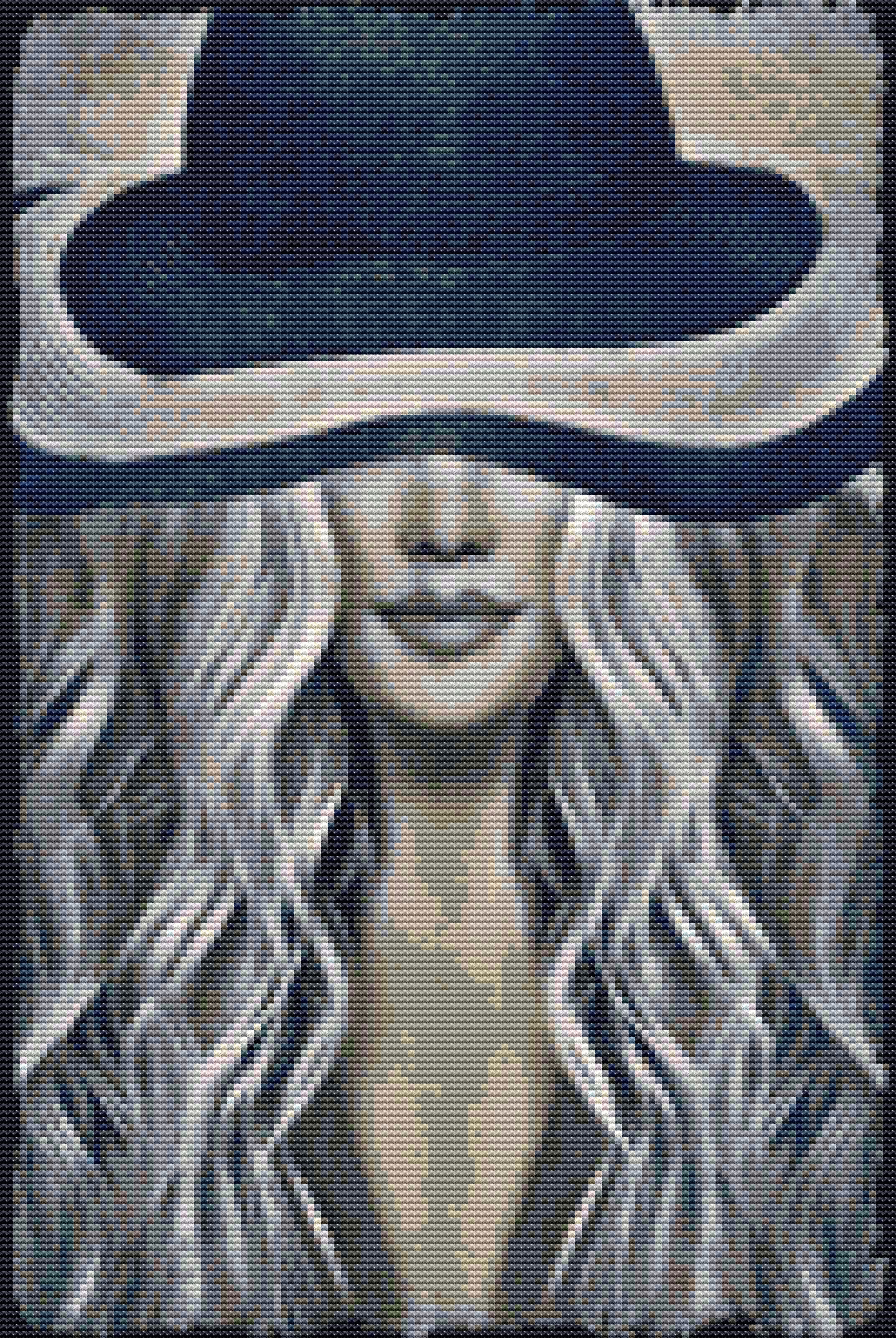 This cross stitch pattern of a woman wearing a wide brimmed hat.