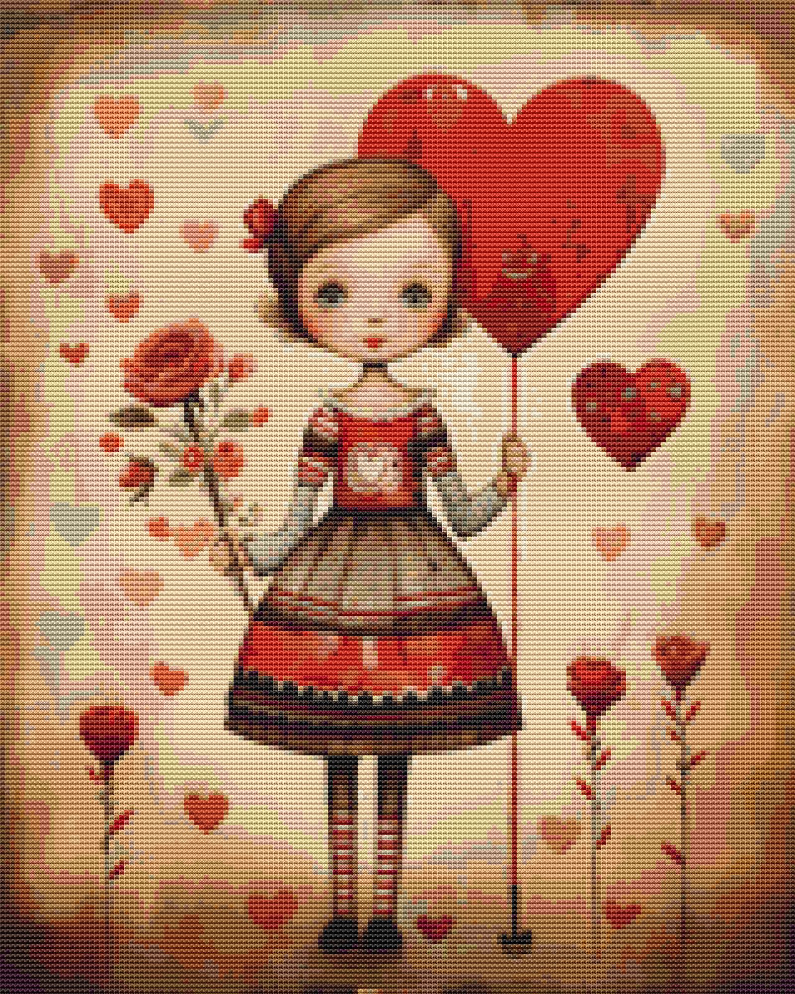 This cross stitch pattern depicts a picture of a pretty girl with red hearts for Valentines Day.