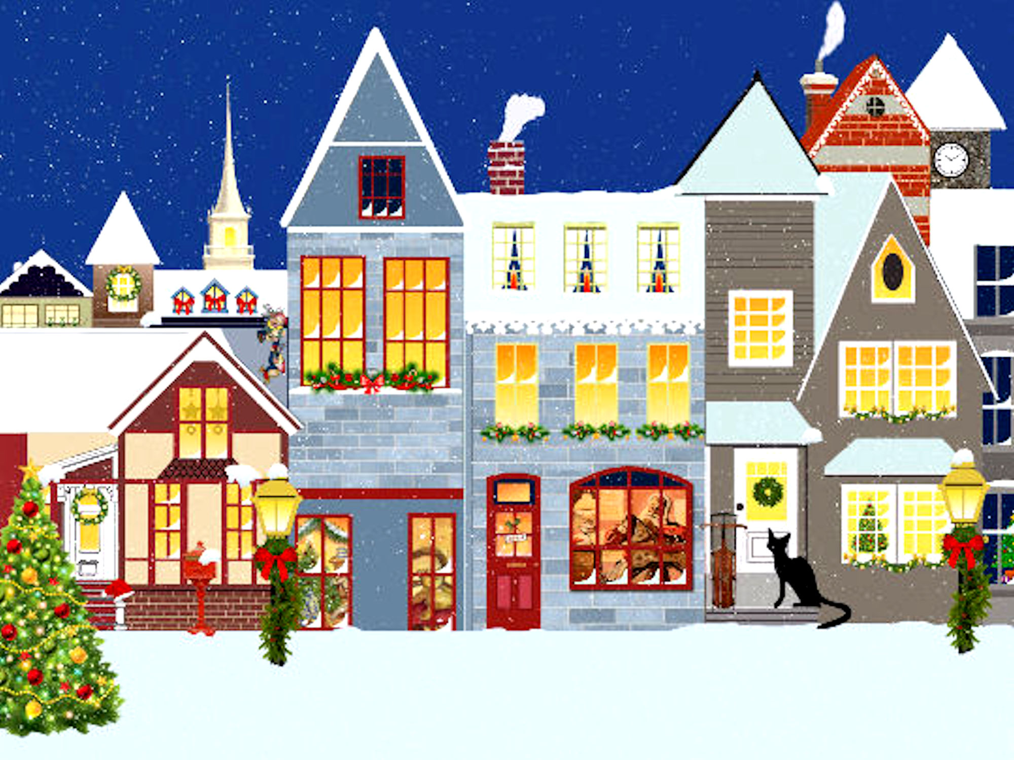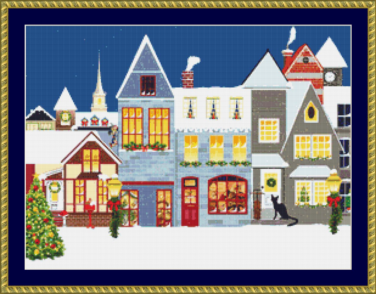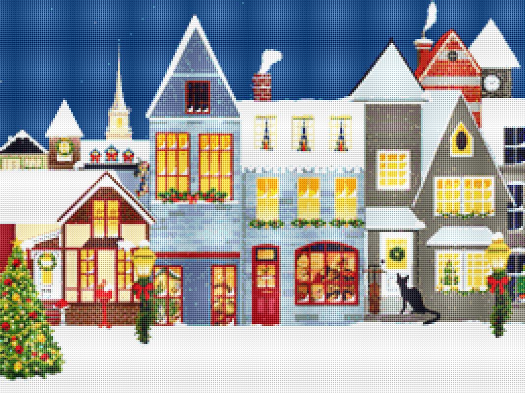 This cross stitch pattern depicts a black cat sat on the doorstep of a house. This is a street scene with the houses decorated for Christmas and snow all around.