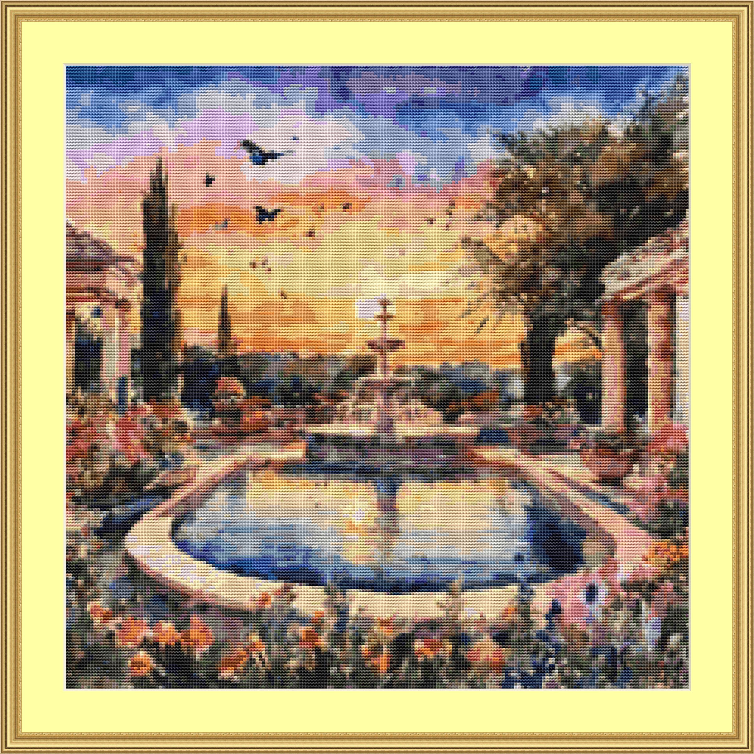 This cross stitch pattern depicts a picture of a fountain in a garden.