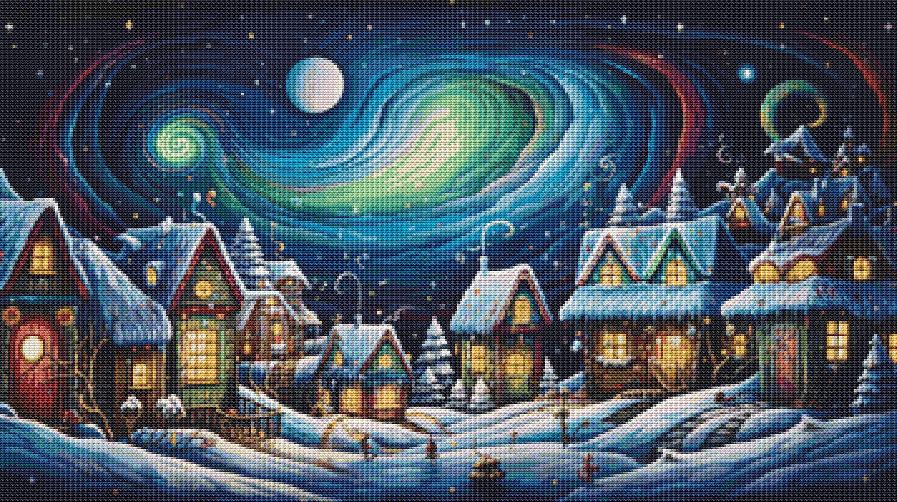 This cross stitch pattern depicts a picture of a snowy village at night.