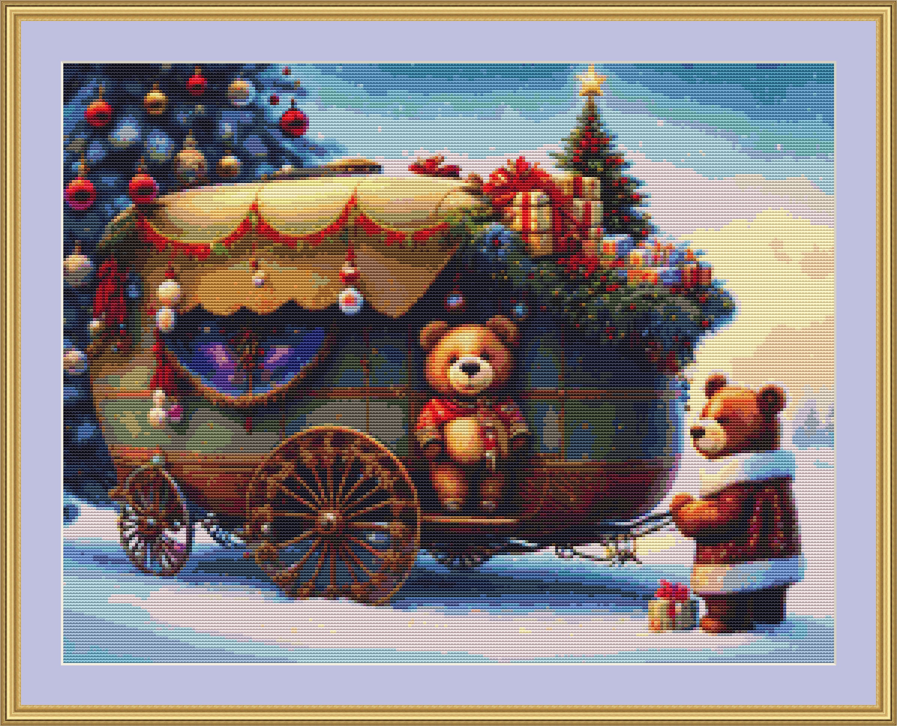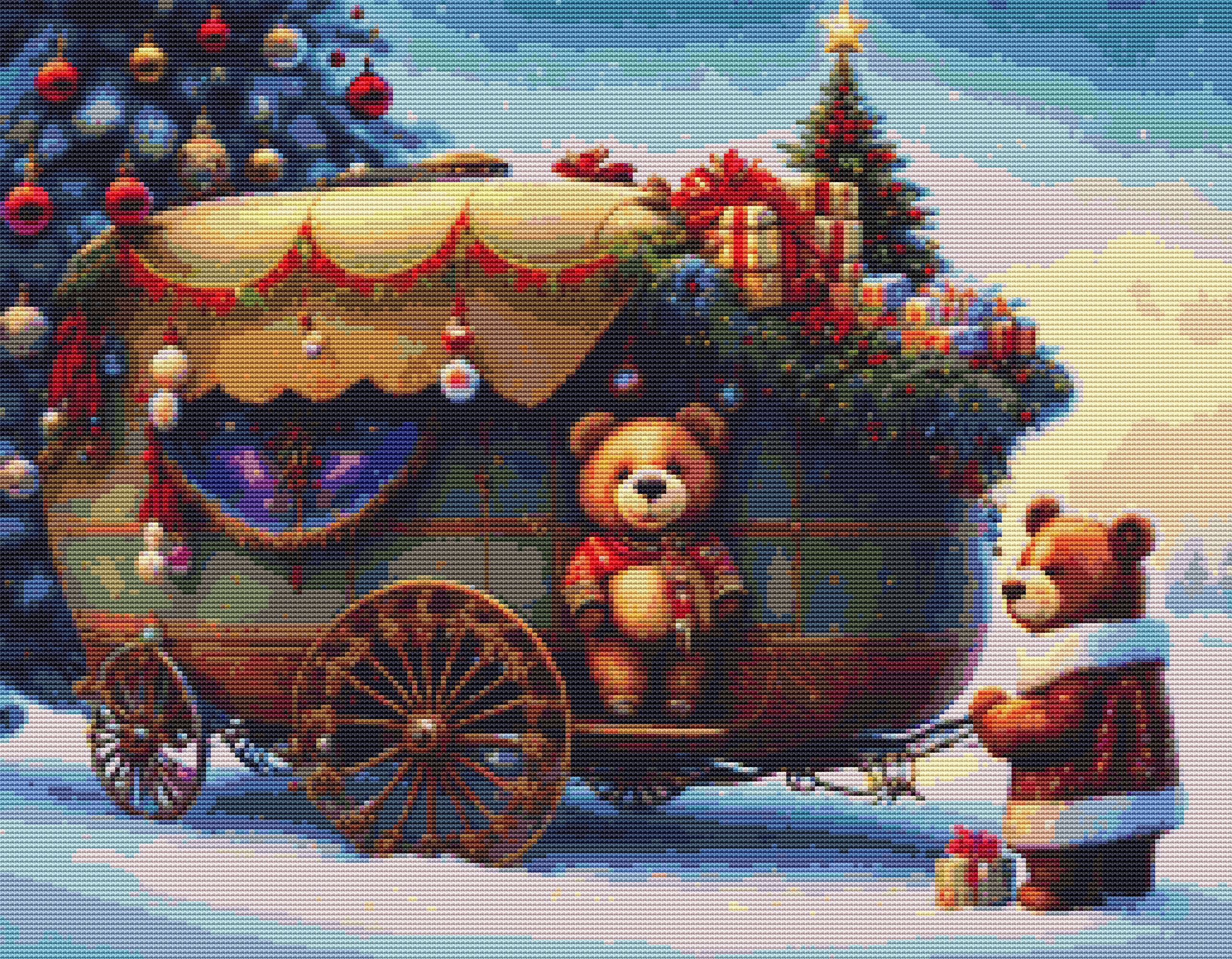 This cross stitch pattern depicts a picture of two teddy bears with their Christmas caravan.