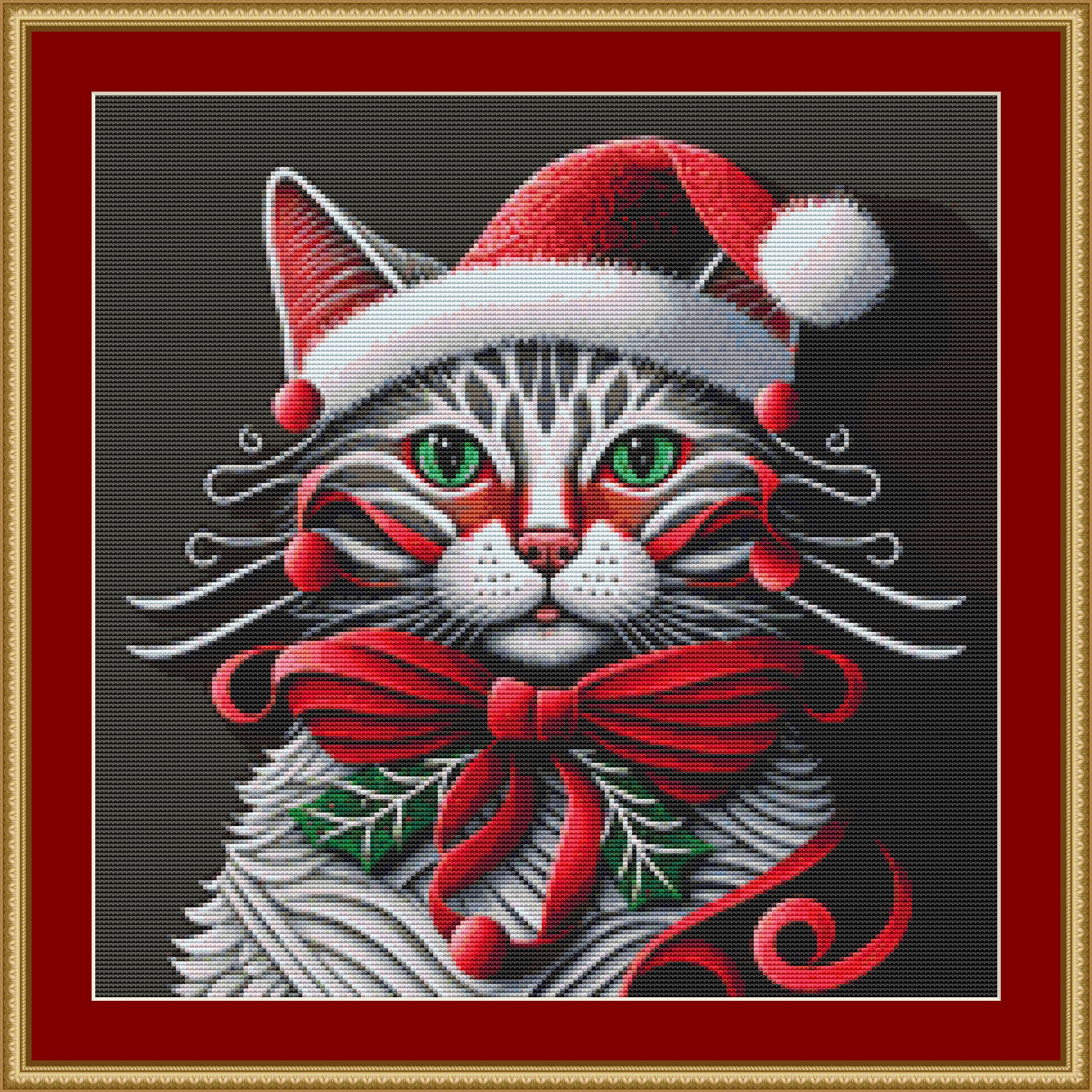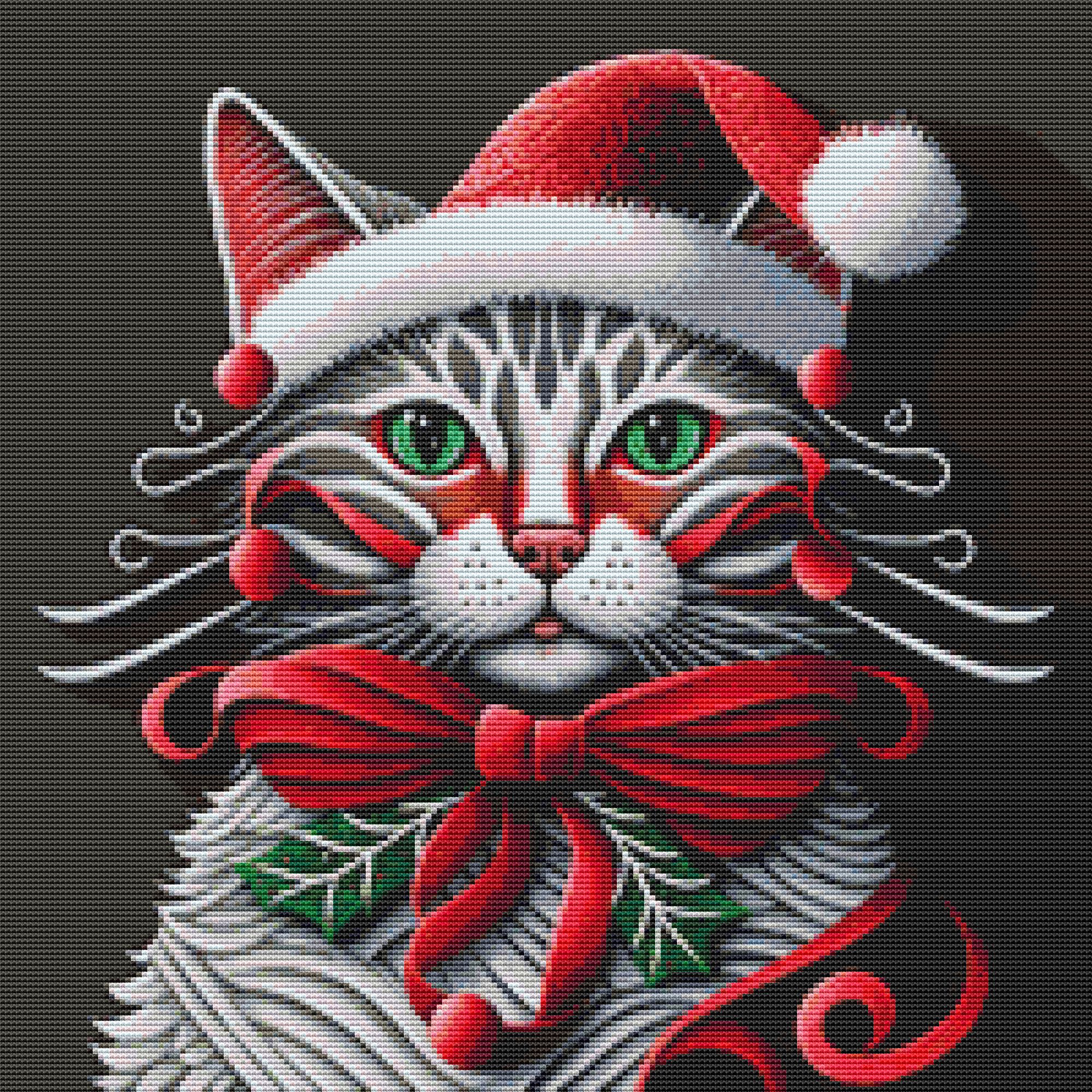 This cross stitch pattern depicts a picture of a cat dressed up for Christmas.
