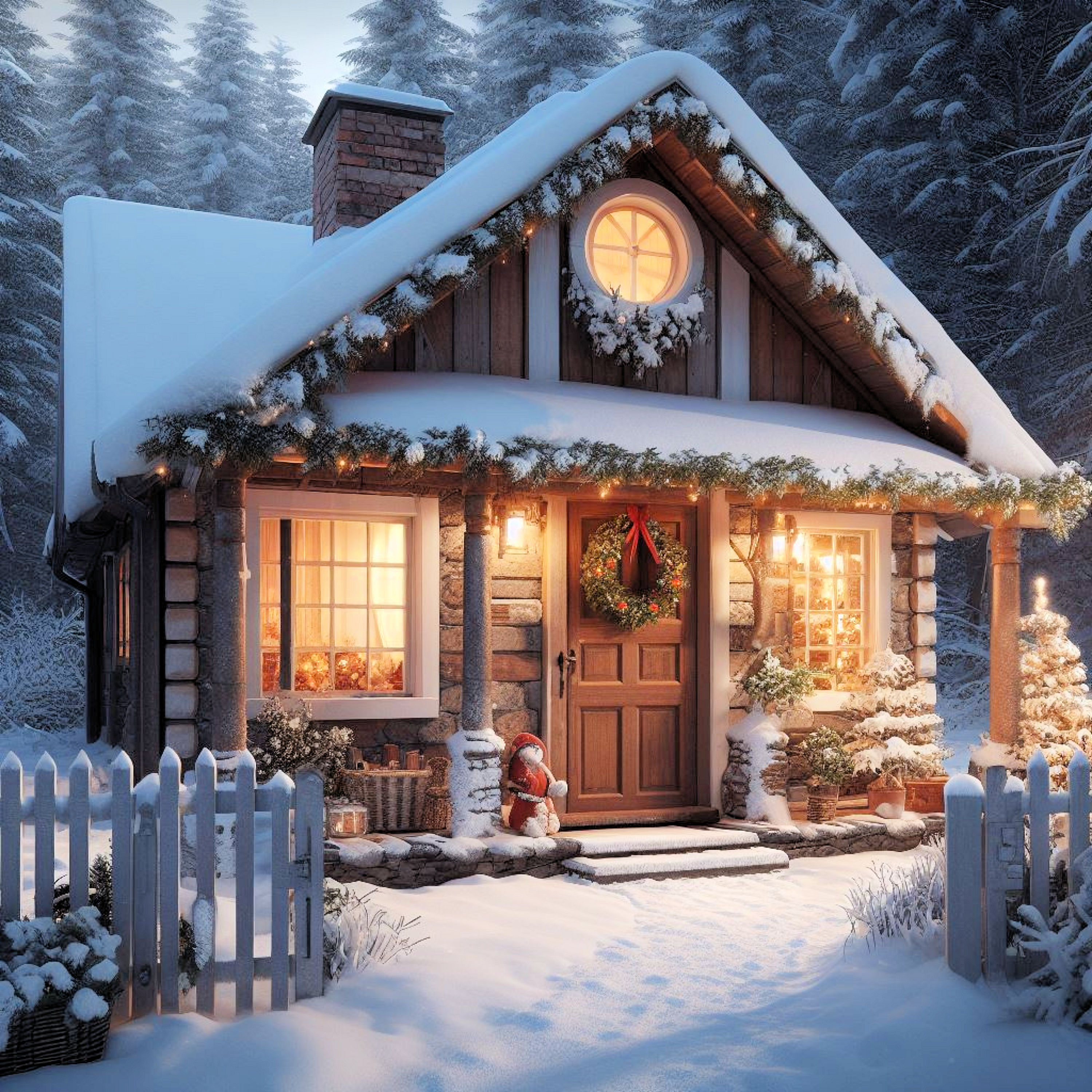 This cross stitch pattern depicts a picture of a cottage decorated for Christmas.