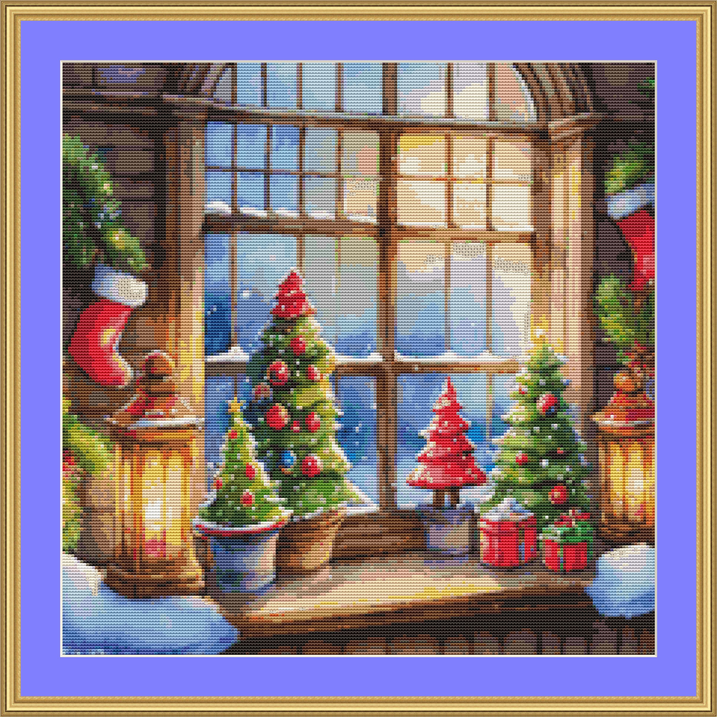 This cross stitch pattern depicts a picture of a window shelf covered in Christmas decorations.
