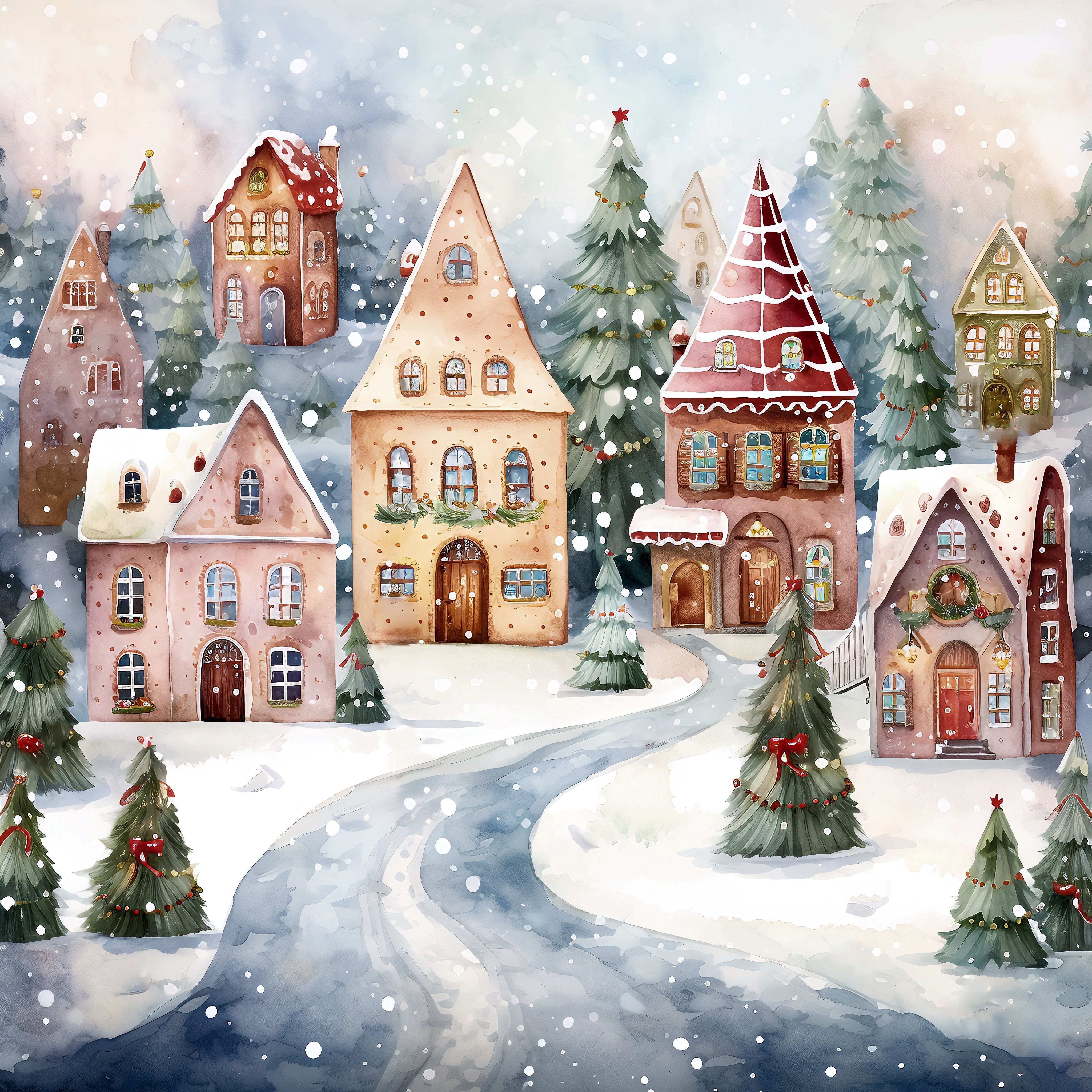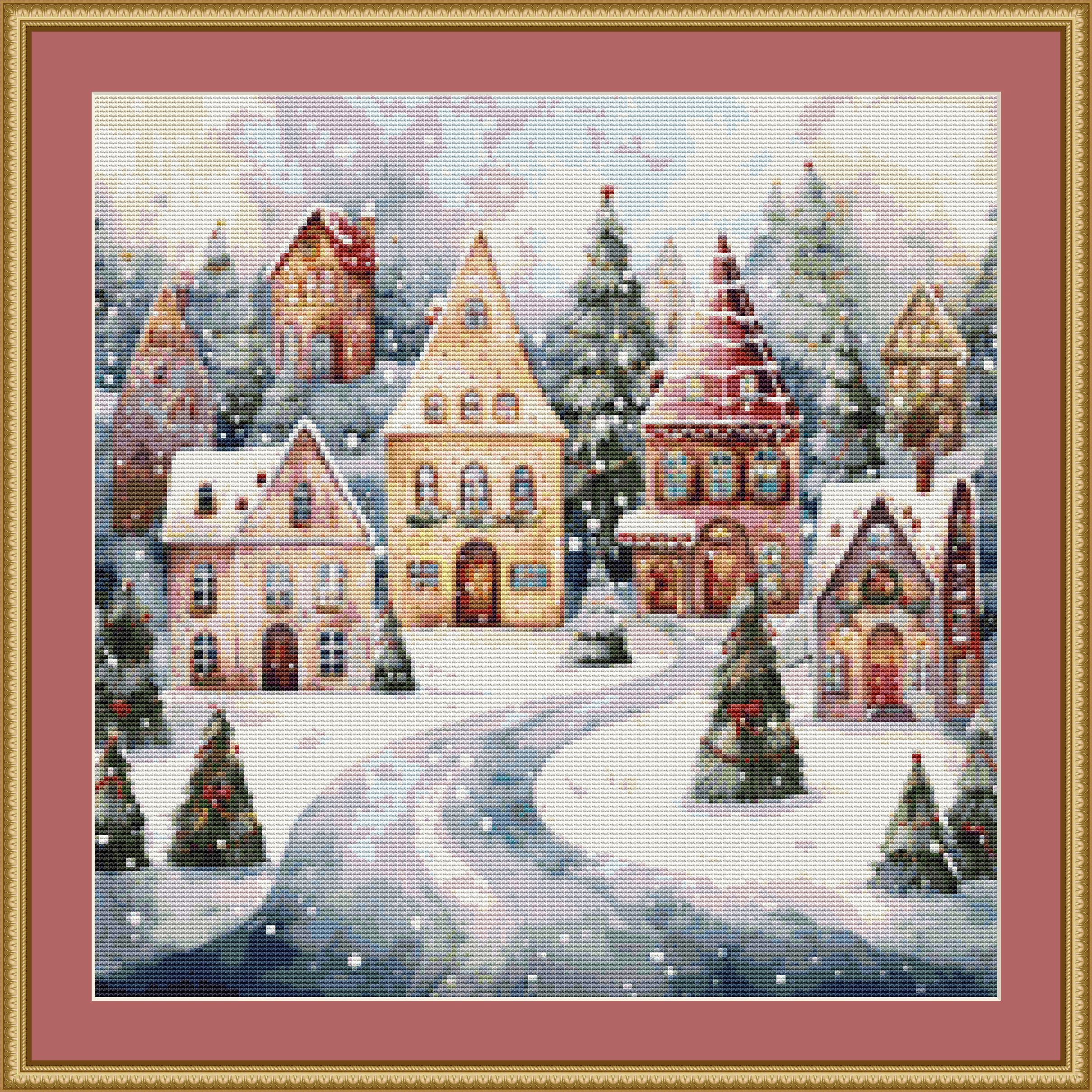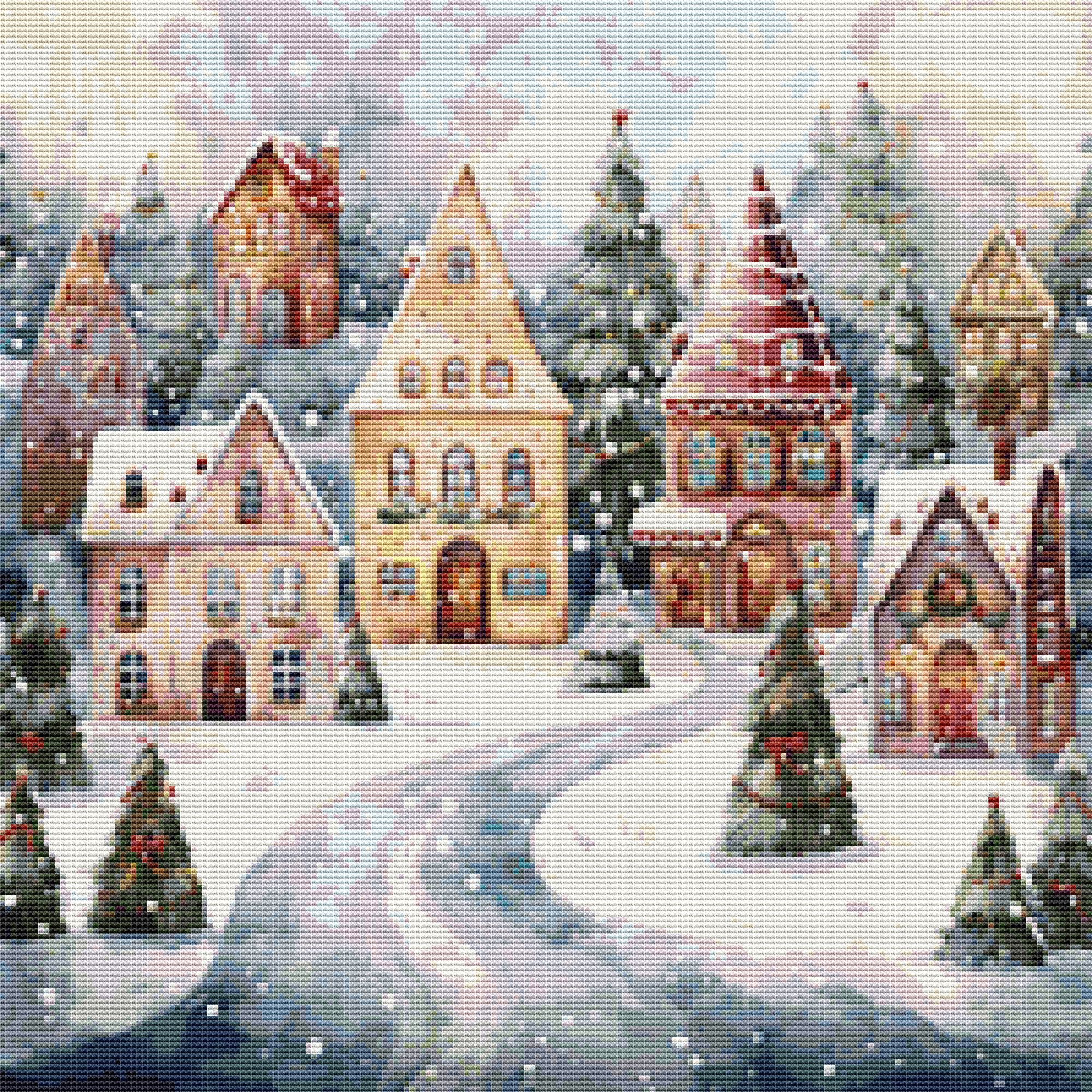 This cross stitch pattern depicts a picture of some house with different coloured roofs.