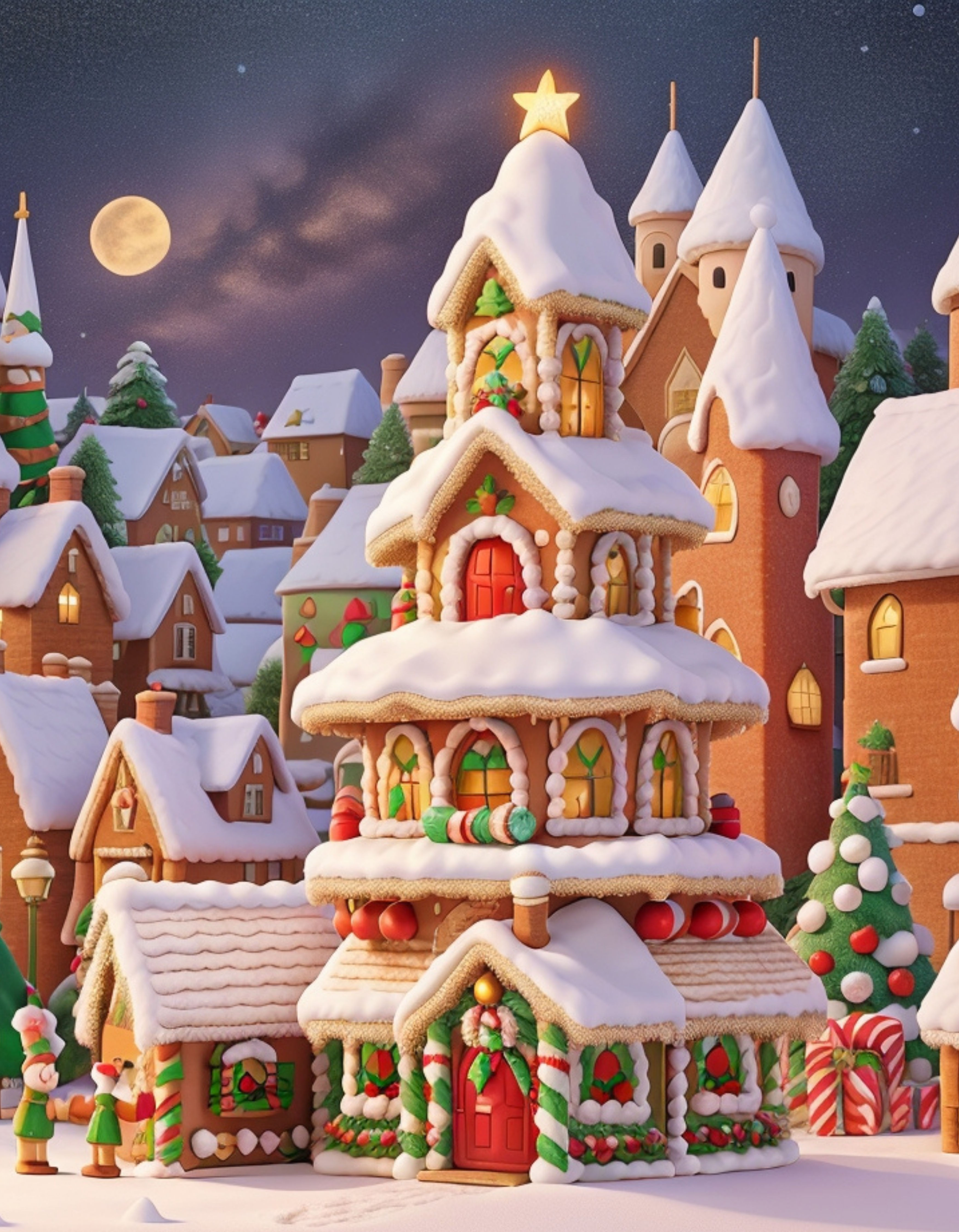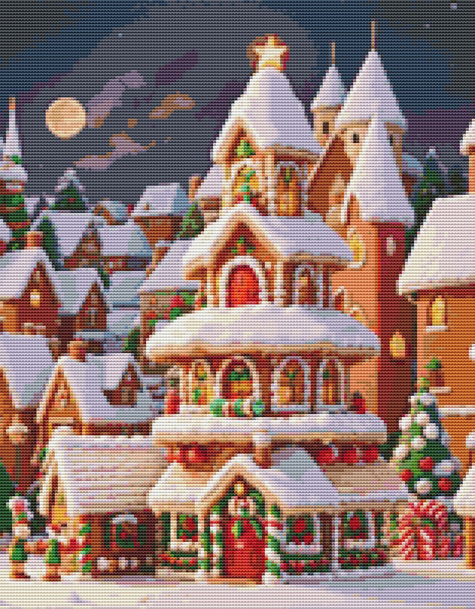 This cross stitch pattern depicts a picture of a village made out of gingerbread.