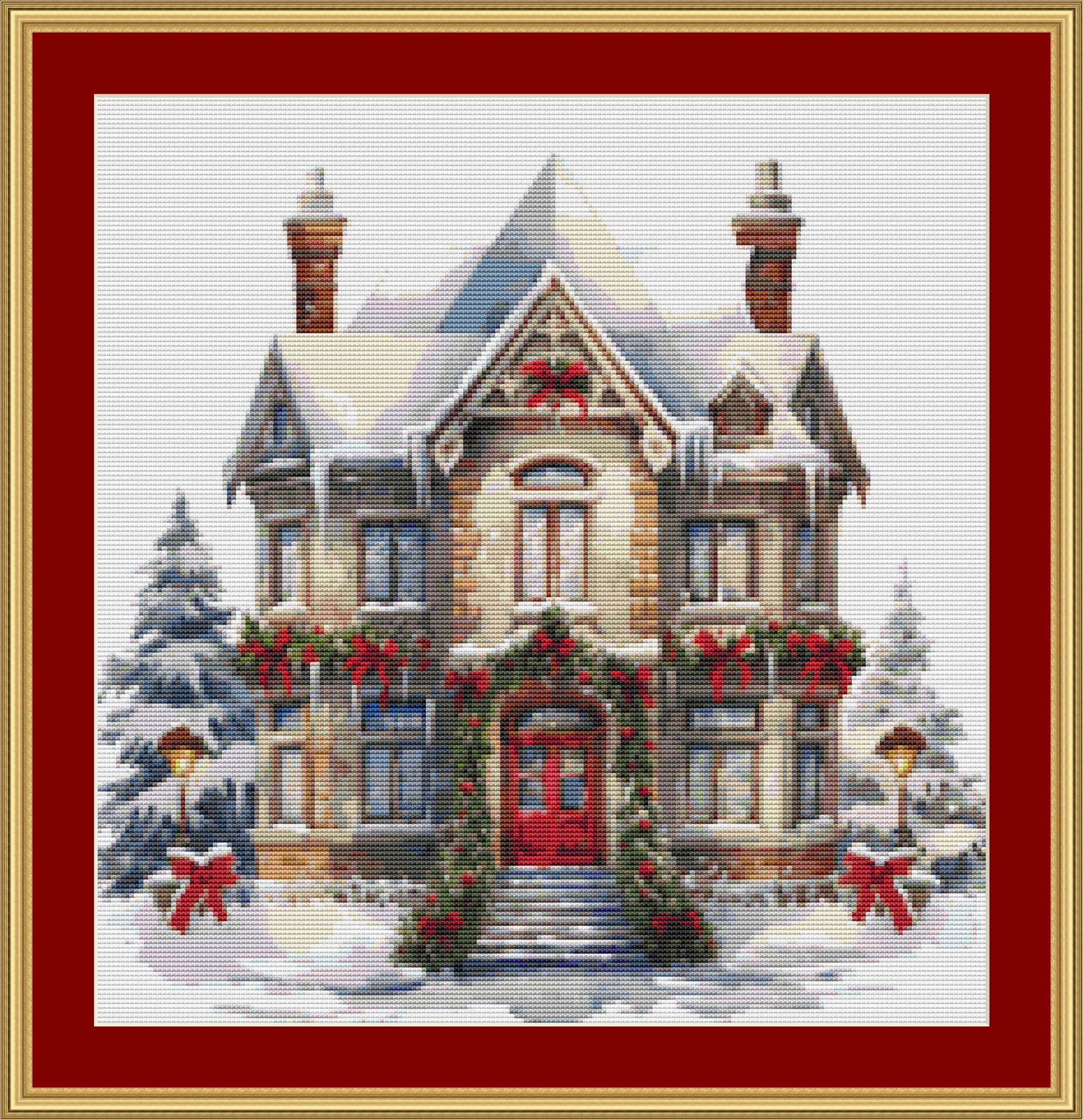 This cross stitch pattern depicts a picture of a lovely house decorated for Christmas.