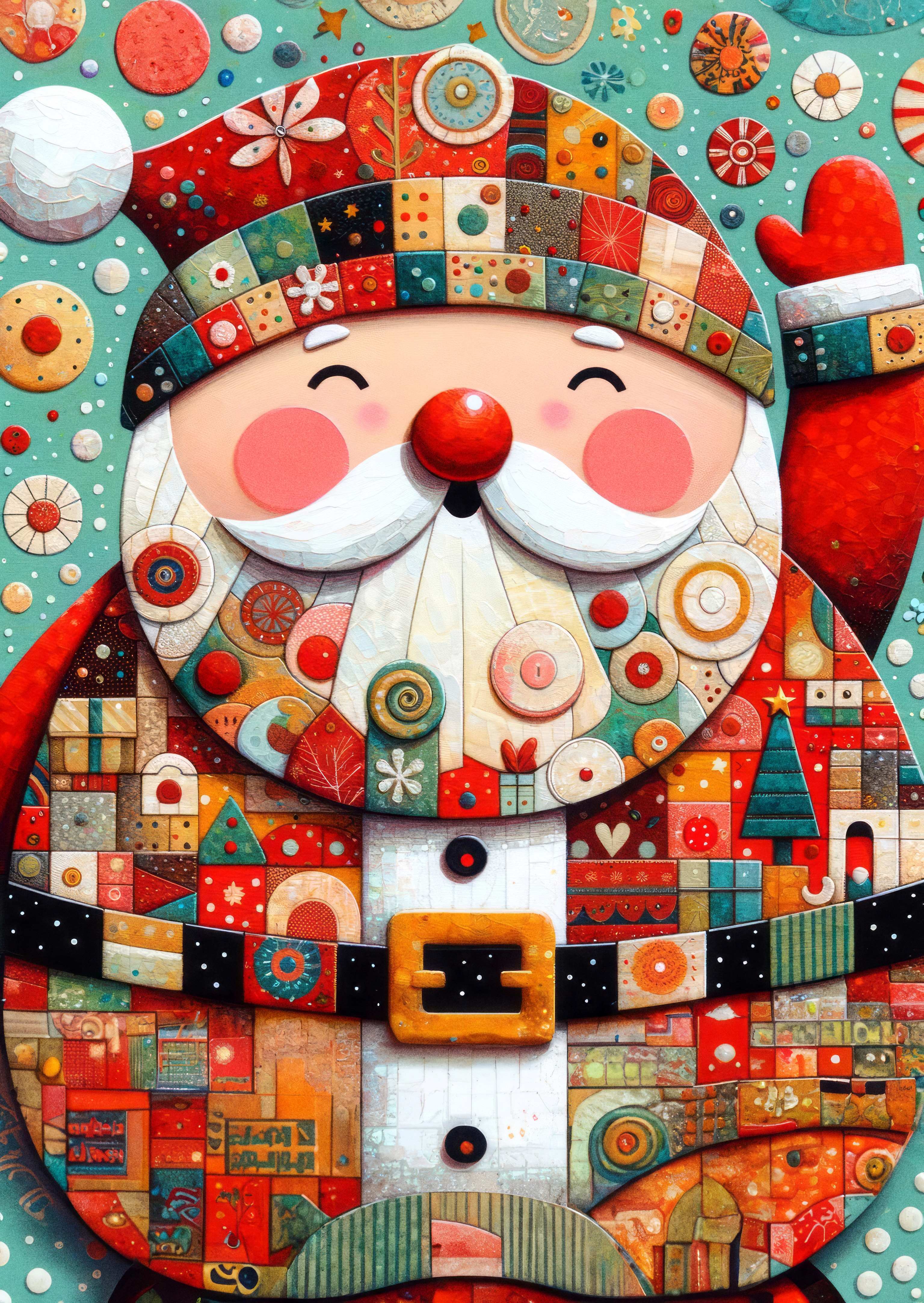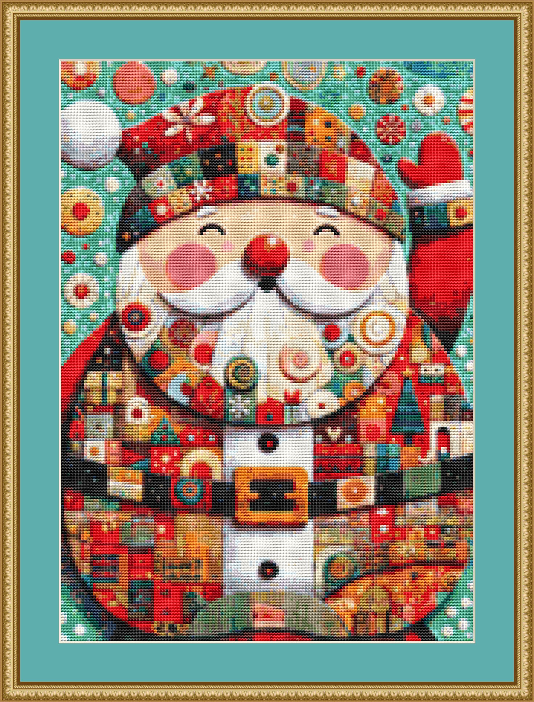 This cross stitch pattern depicts a picture of a patchwork picture of a Santa.