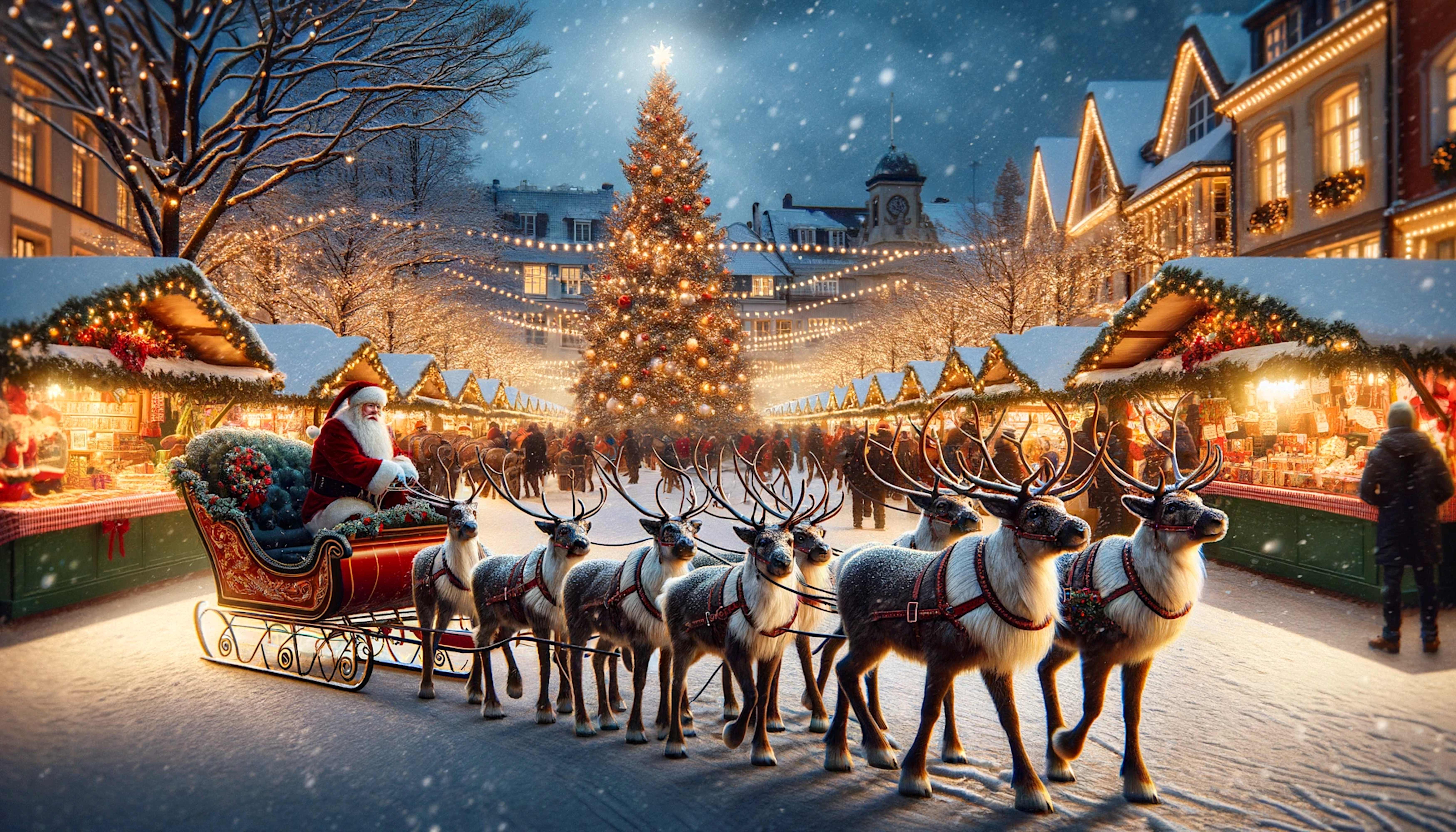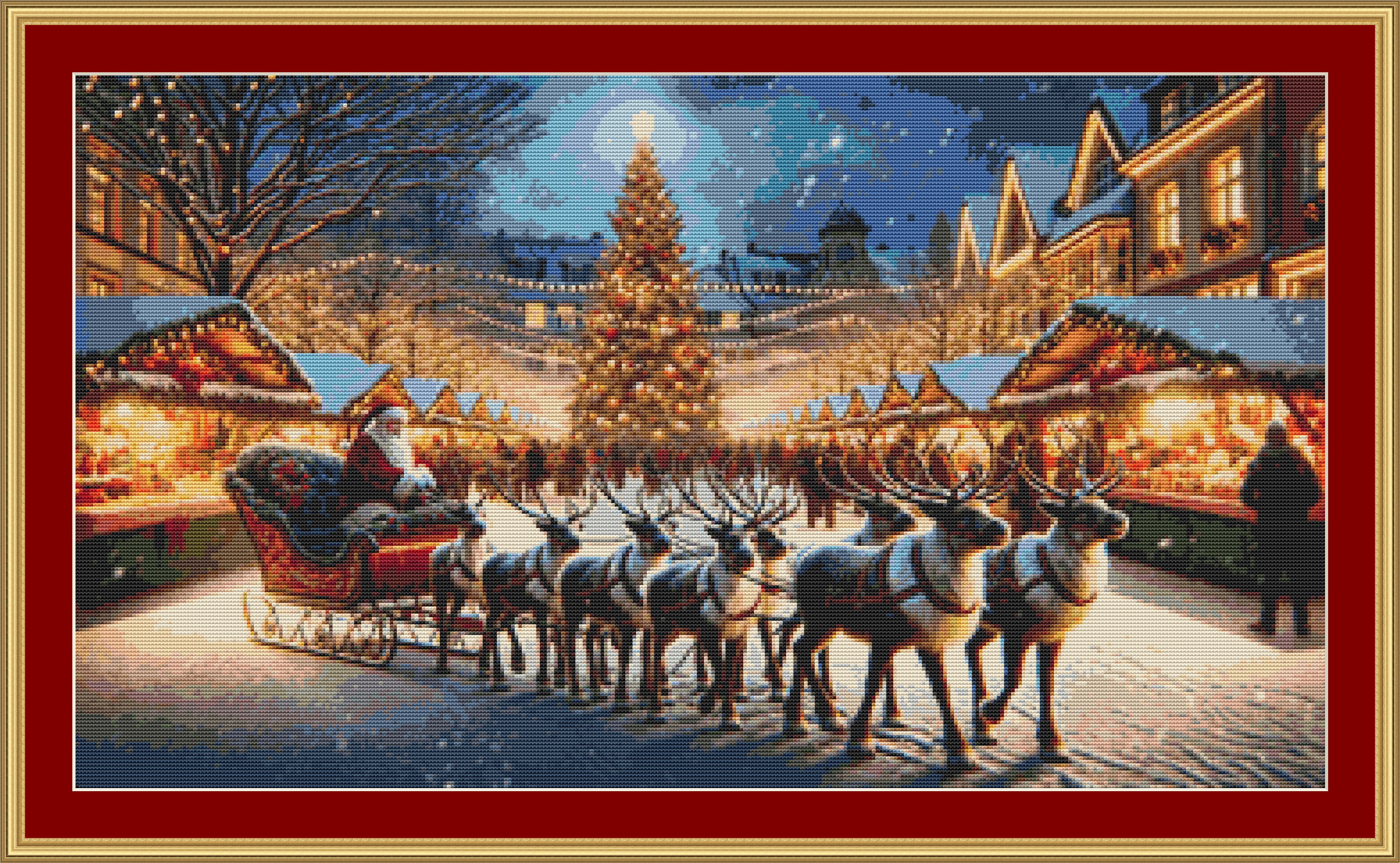 This cross stitch pattern depicts a picture of Santa and his reindeer at a Christmas market.
