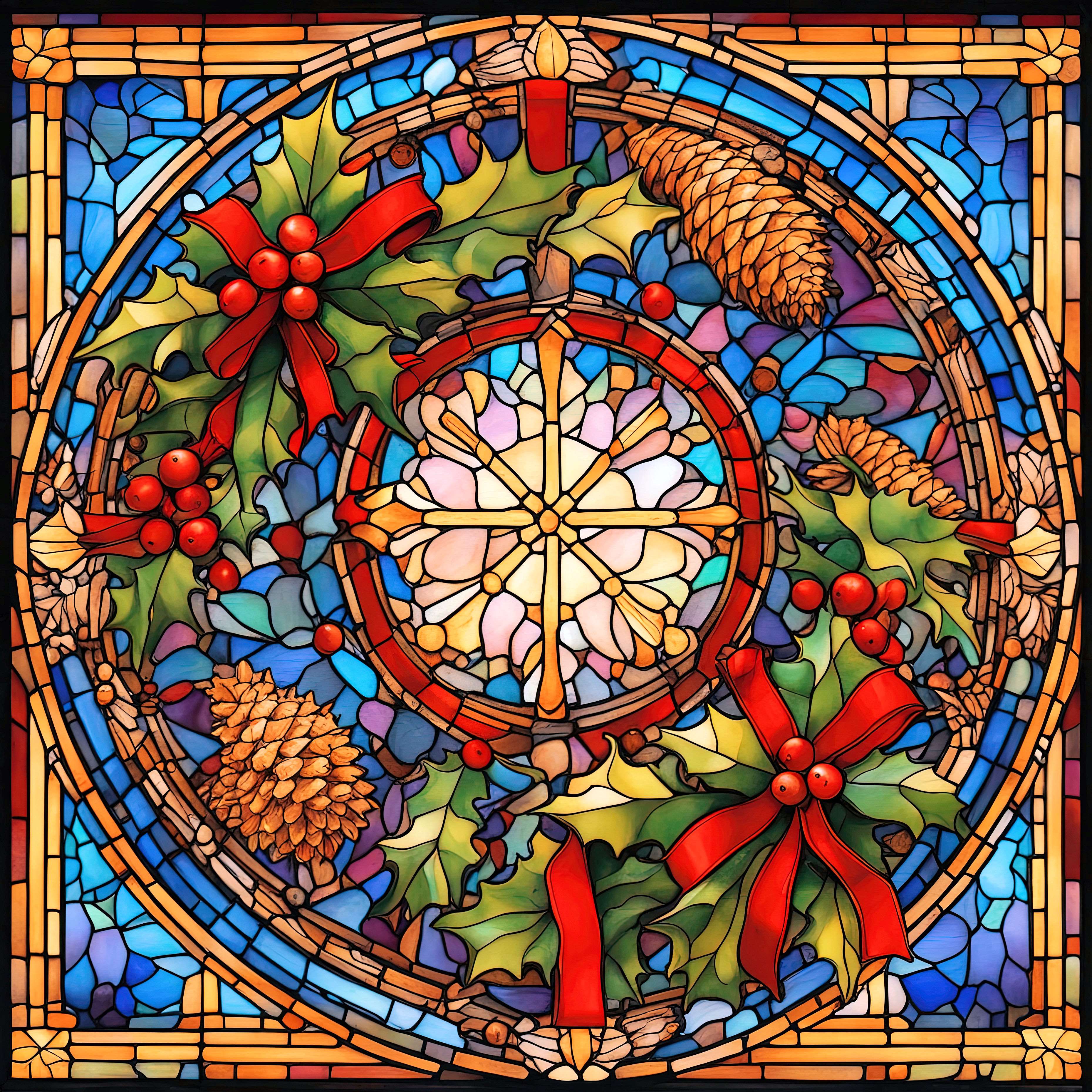 This cross stitch pattern depicts a picture of a wreath using stained glass.