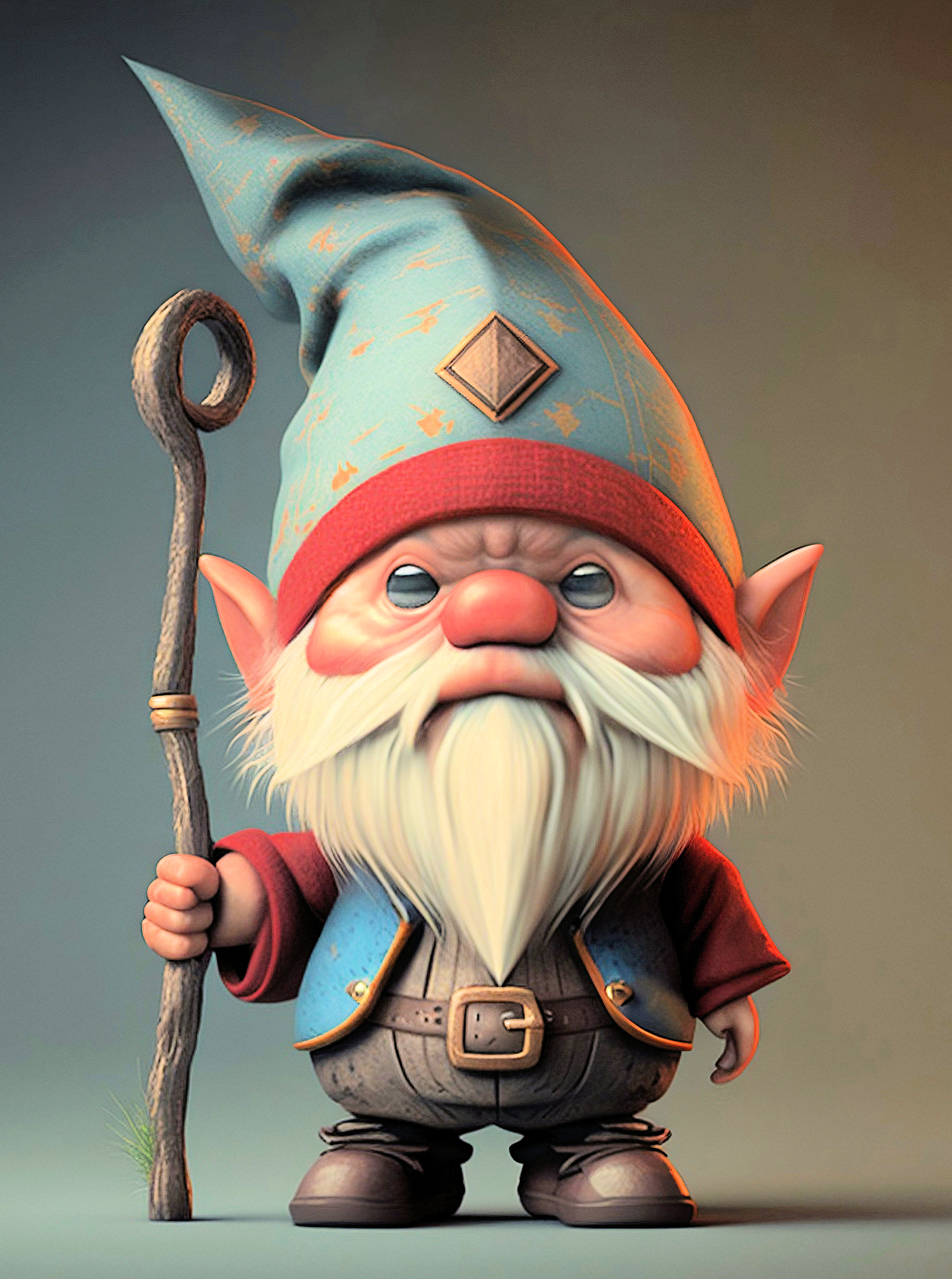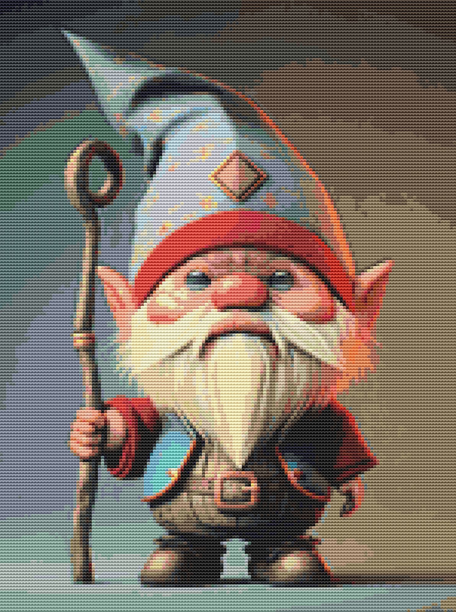 This cross stitch pattern depicts a picture of an elf with a staff.