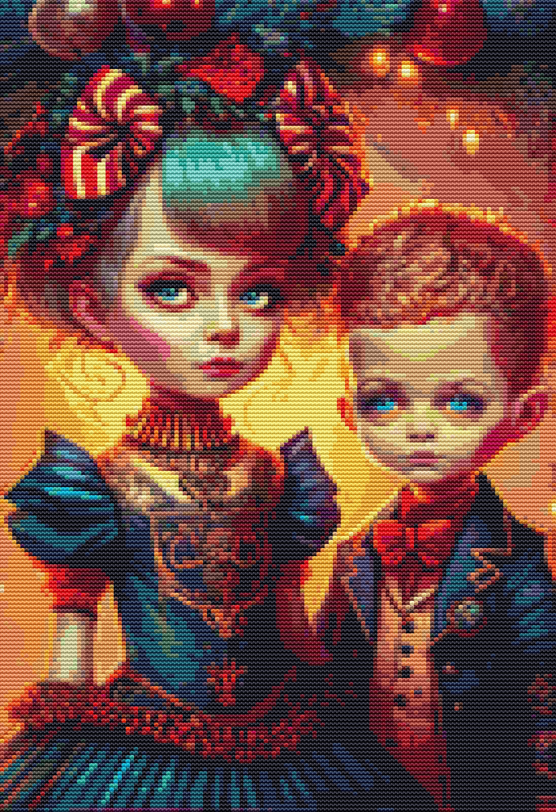 This cross stitch pattern depicts a picture of a boy and girl dressed in their best clothes.
