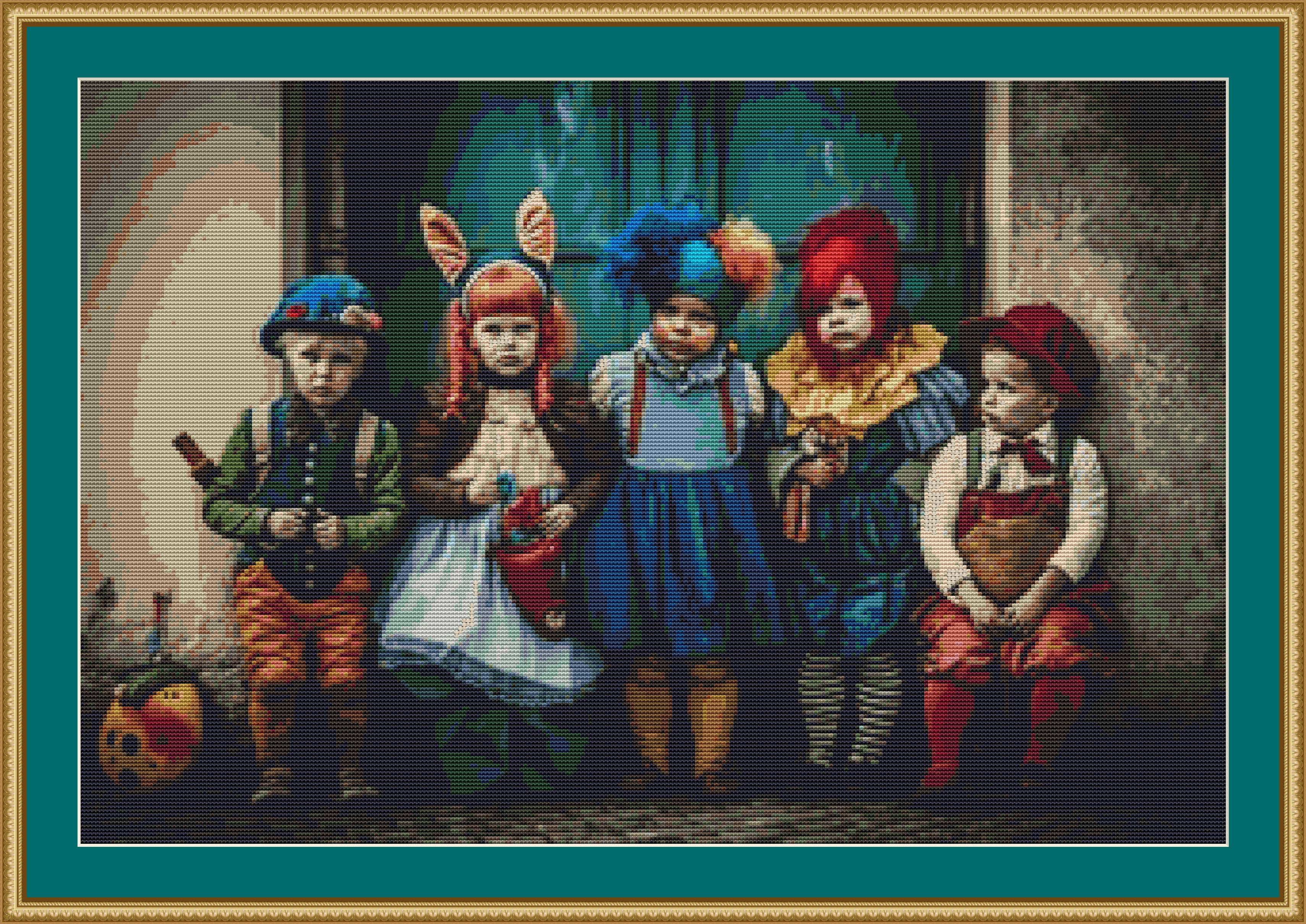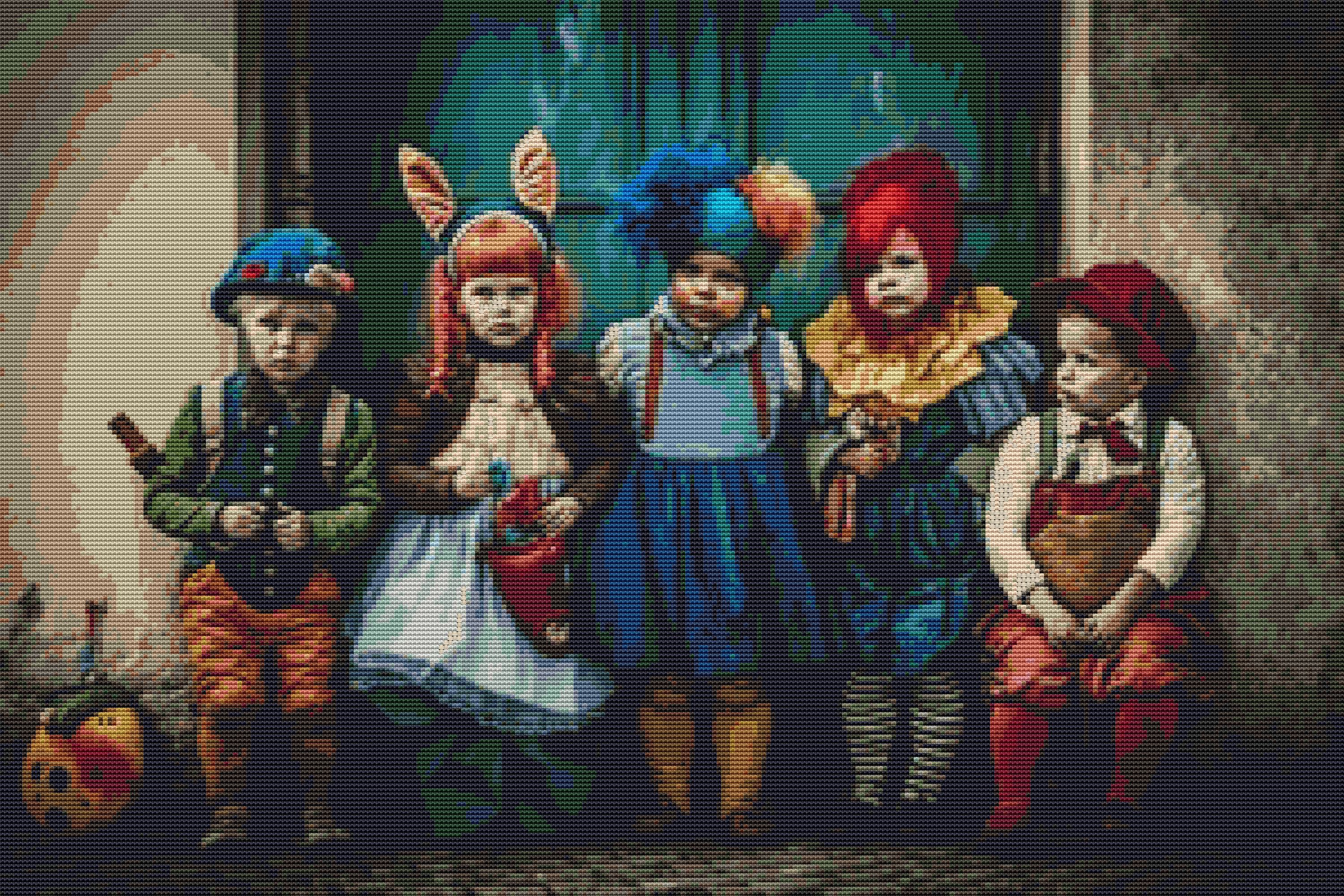 This cross stitch pattern depicts a picture of a group of children dressed for a carnival.