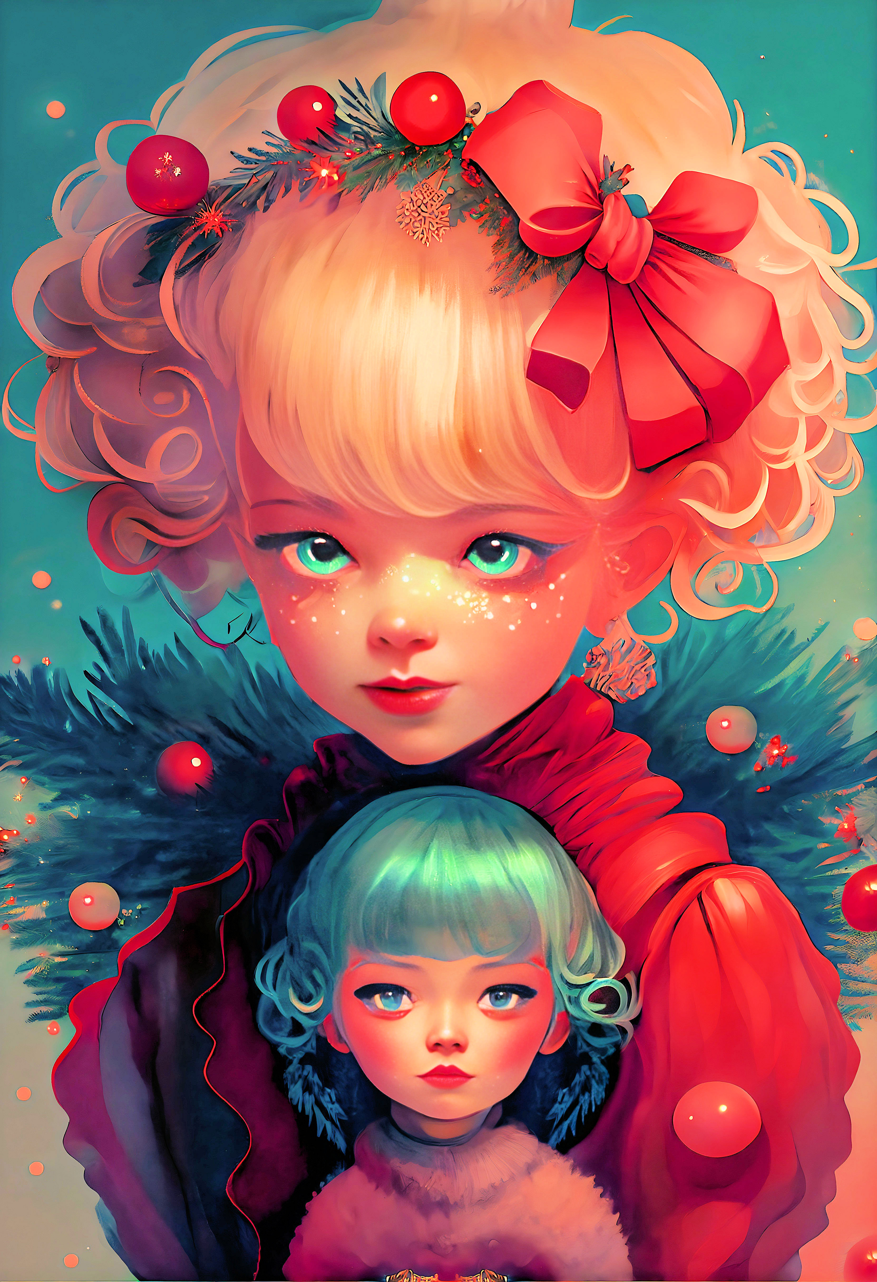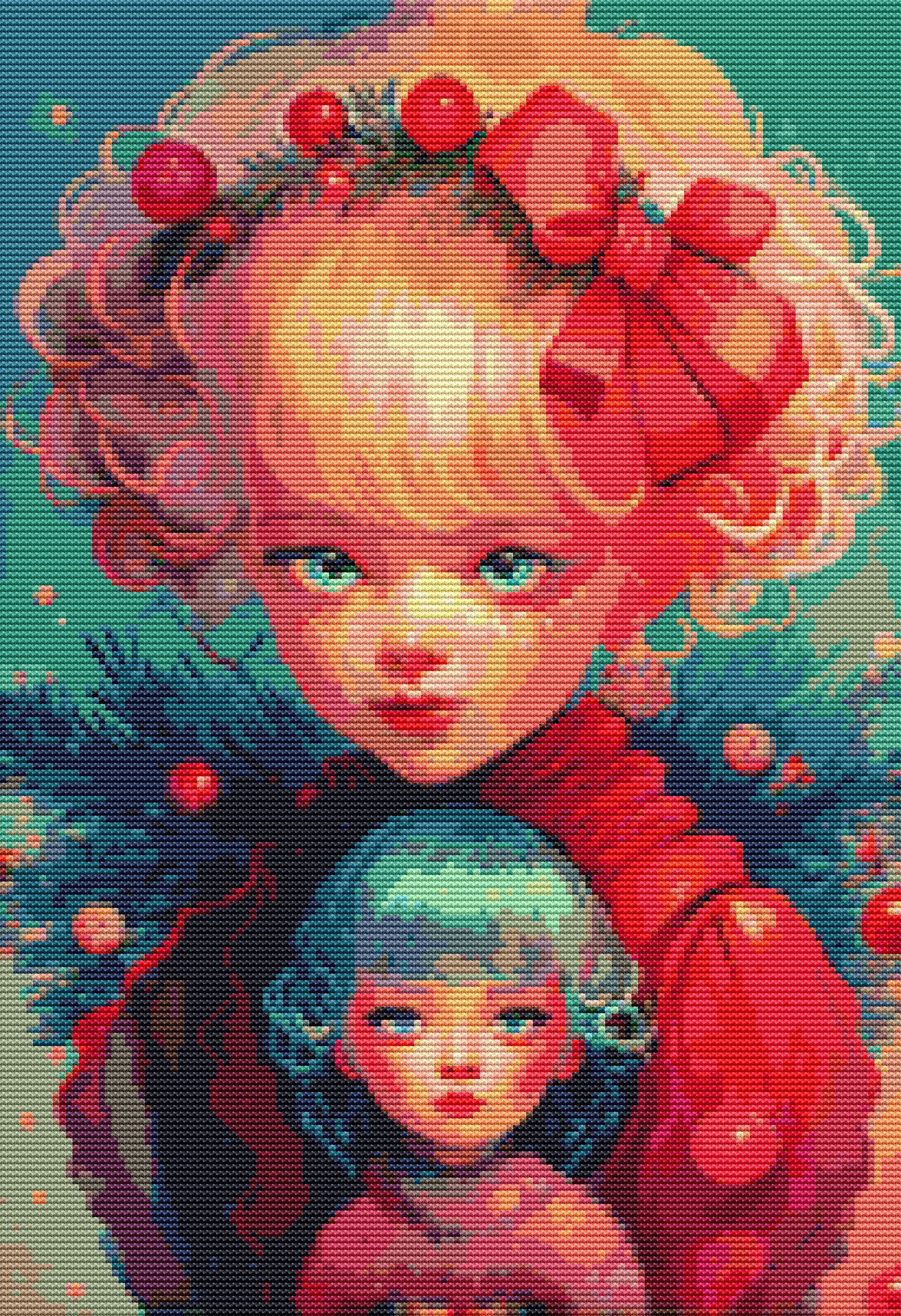 This cross stitch pattern depicts a picture of a little girl and her doll.