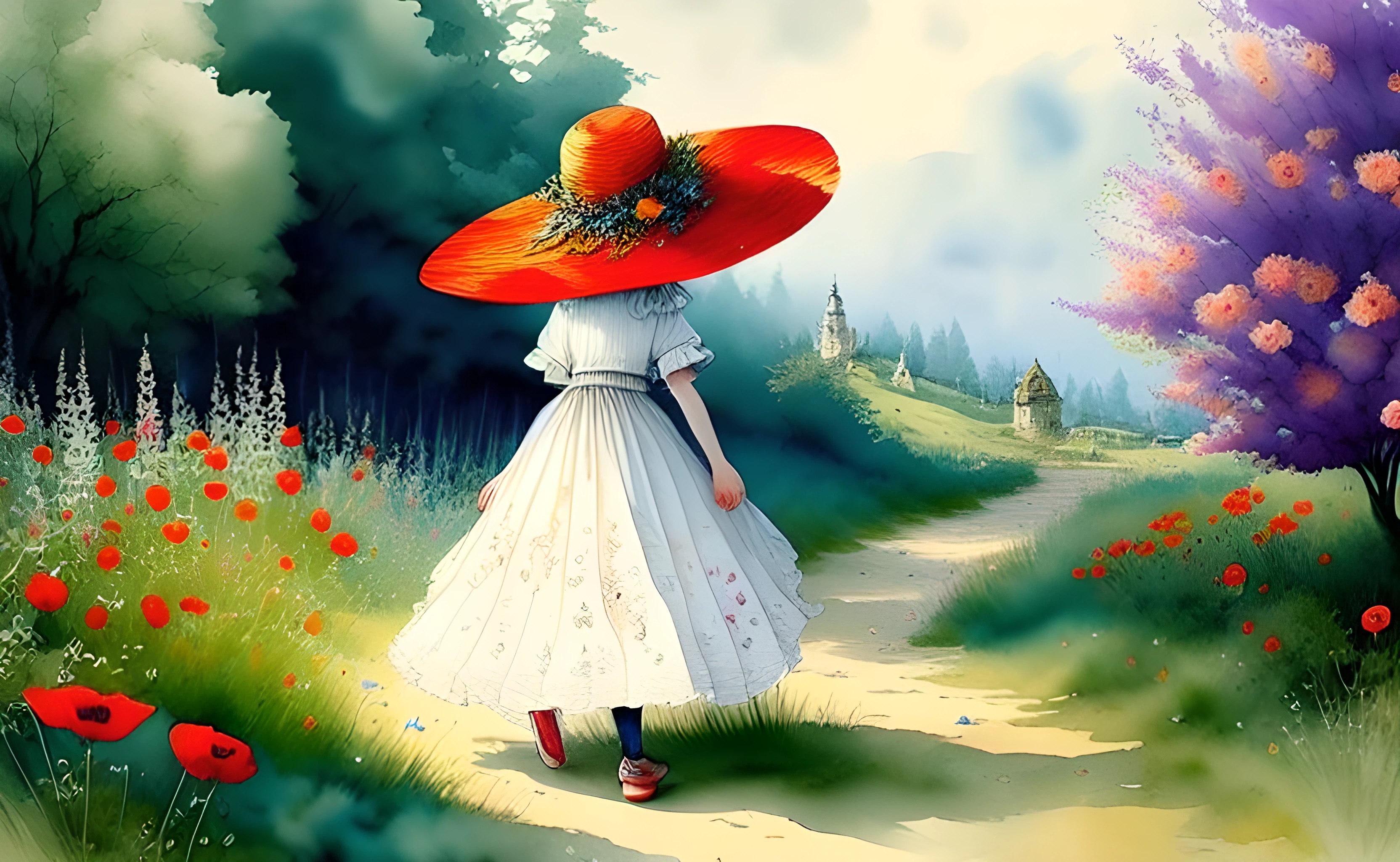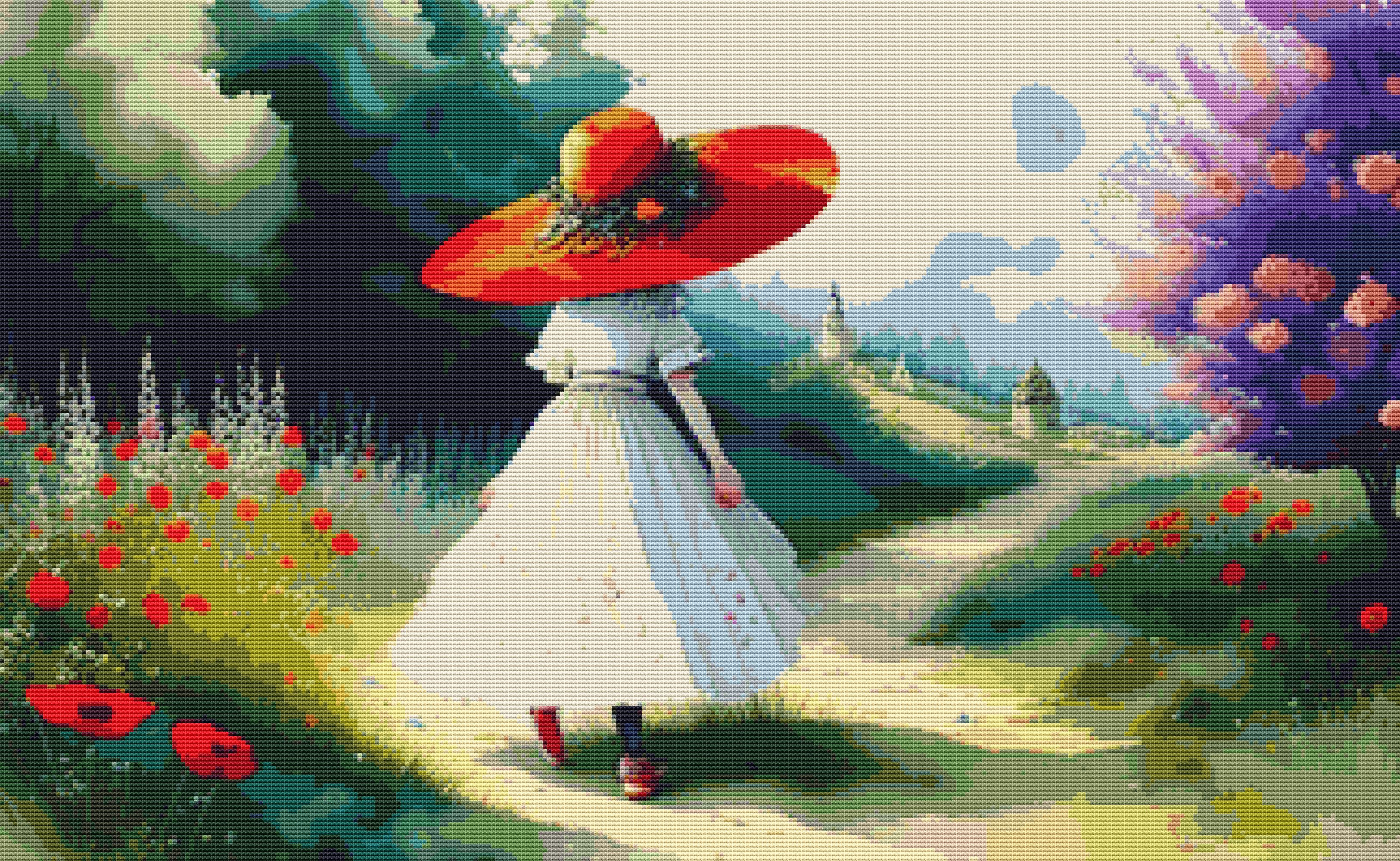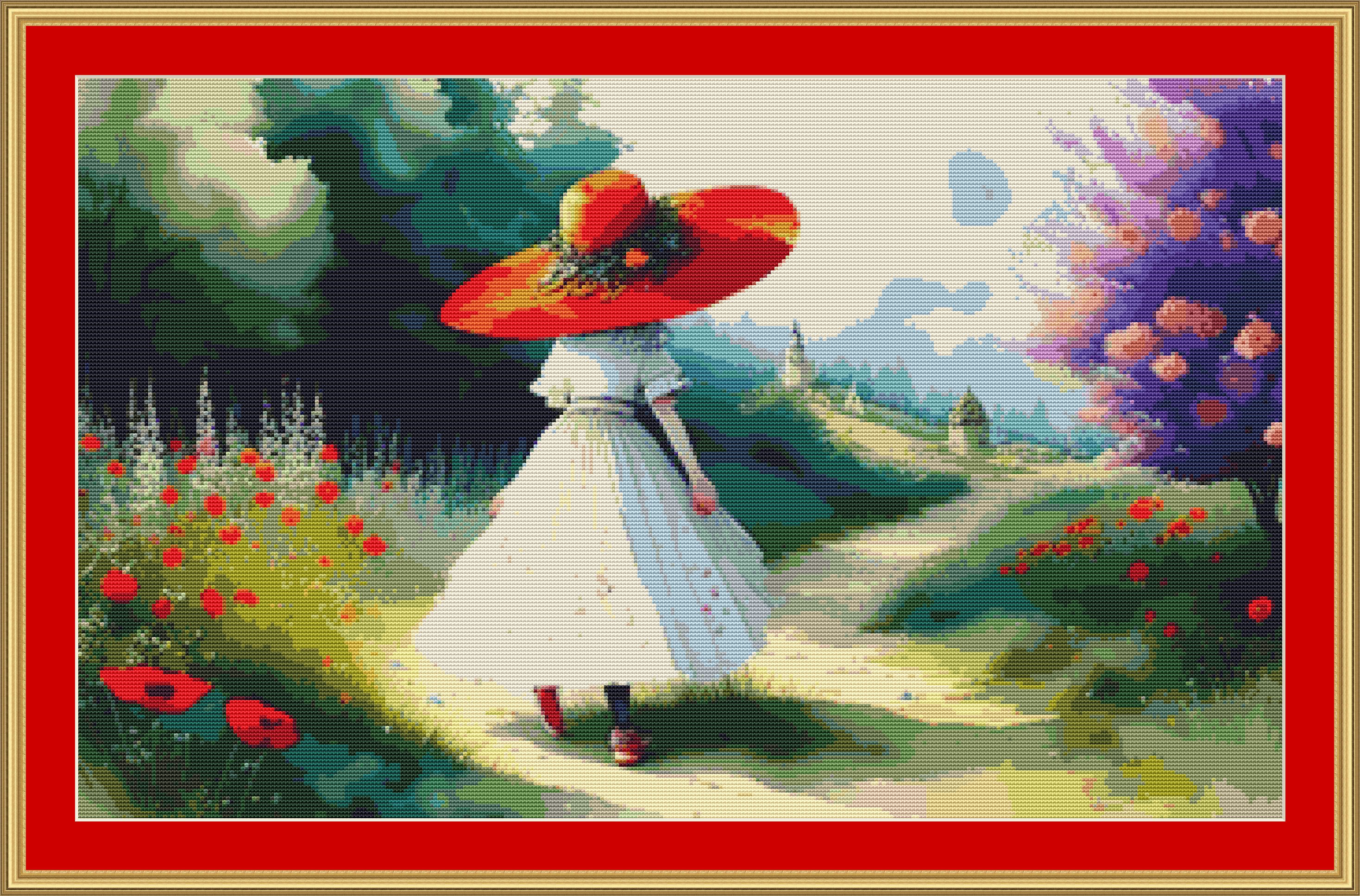 This cross stitch pattern depicts a picture of a little girl wearing a red hat.