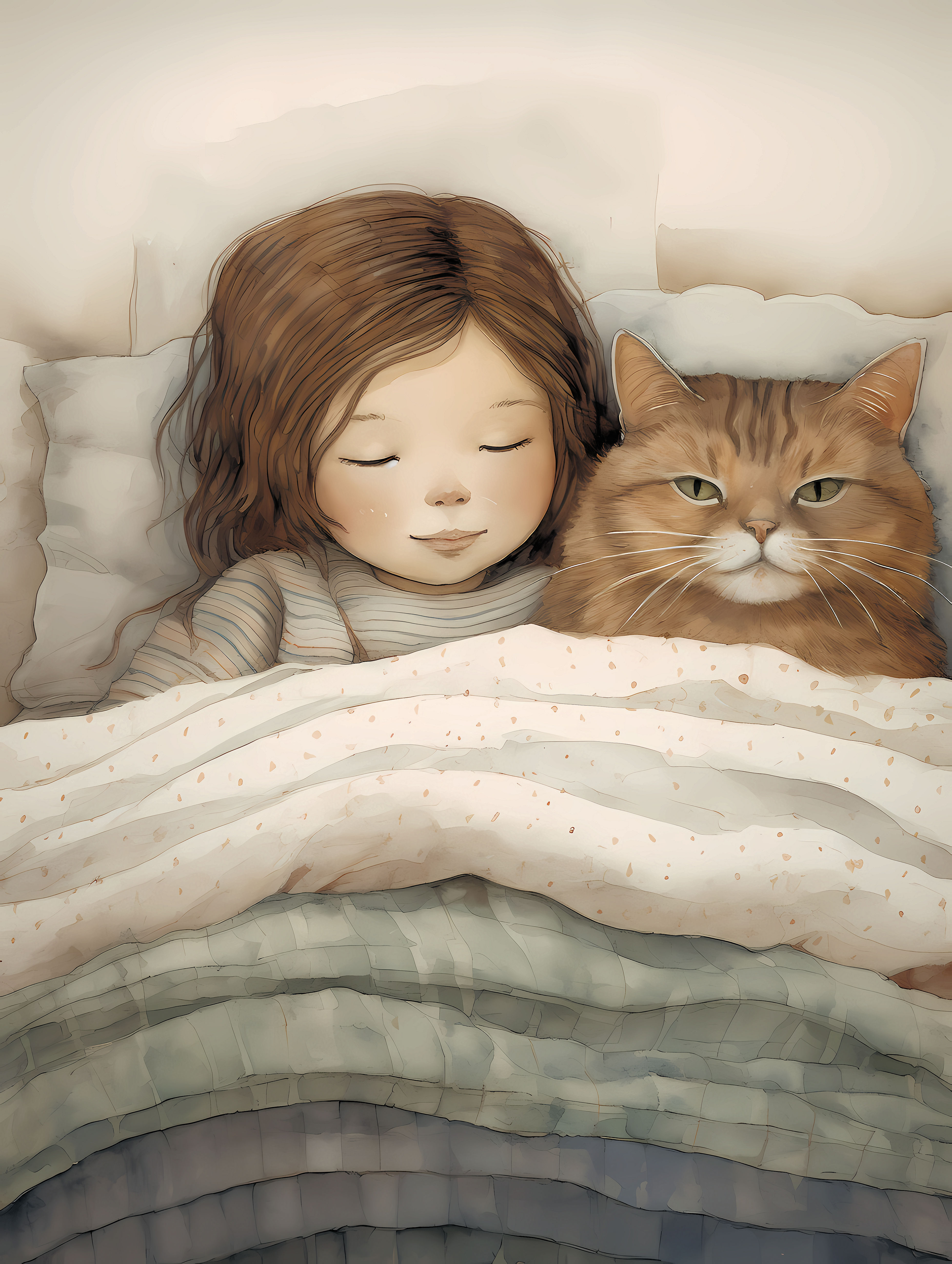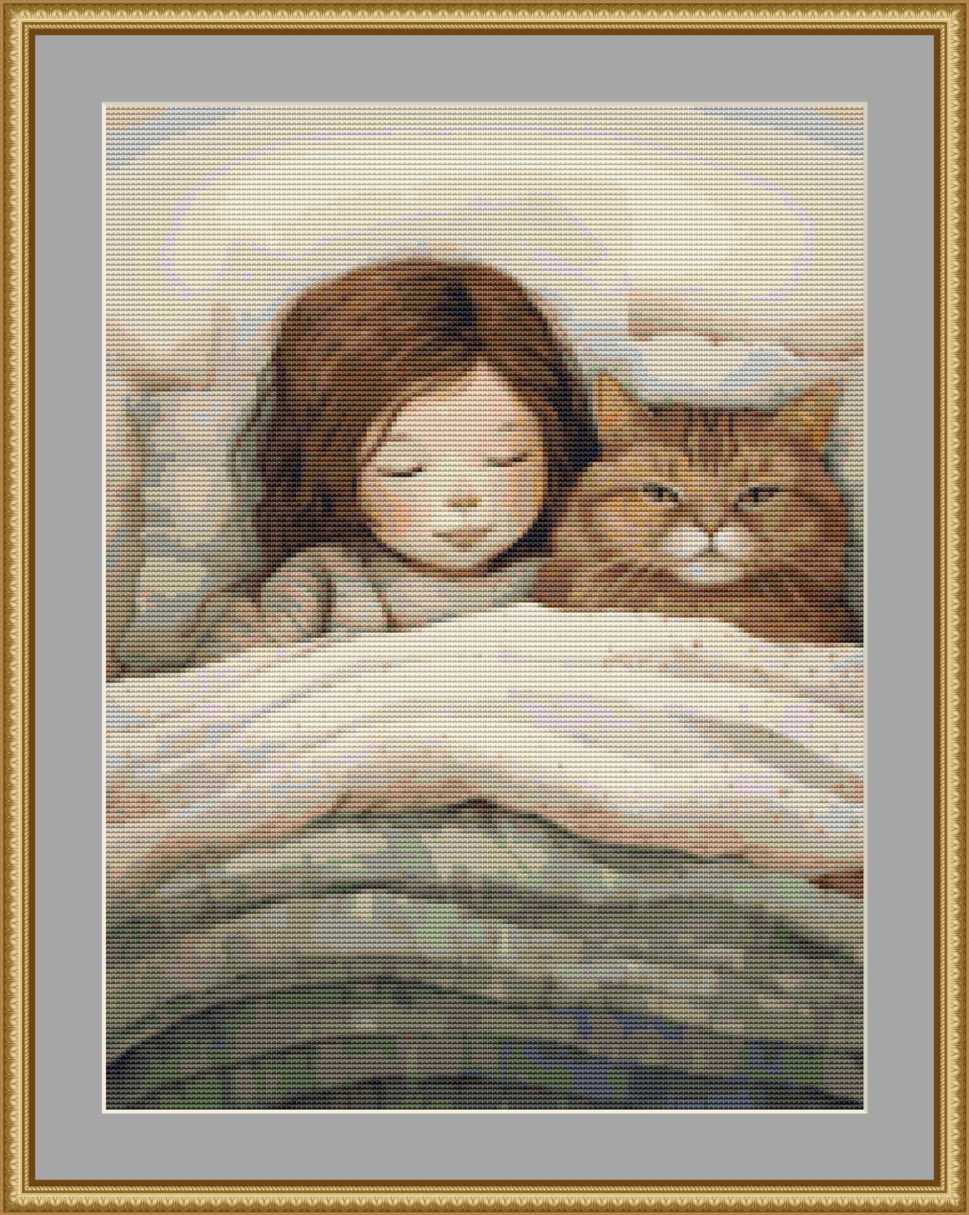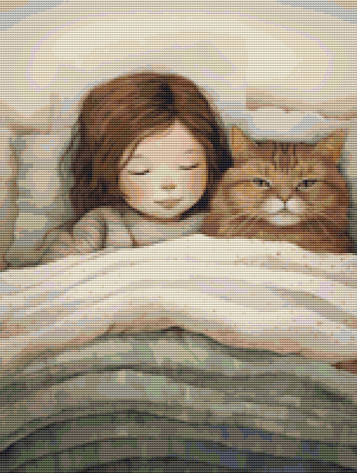 This cross stitch pattern depicts a picture of a little girl and her cat snuggling together in bed.
