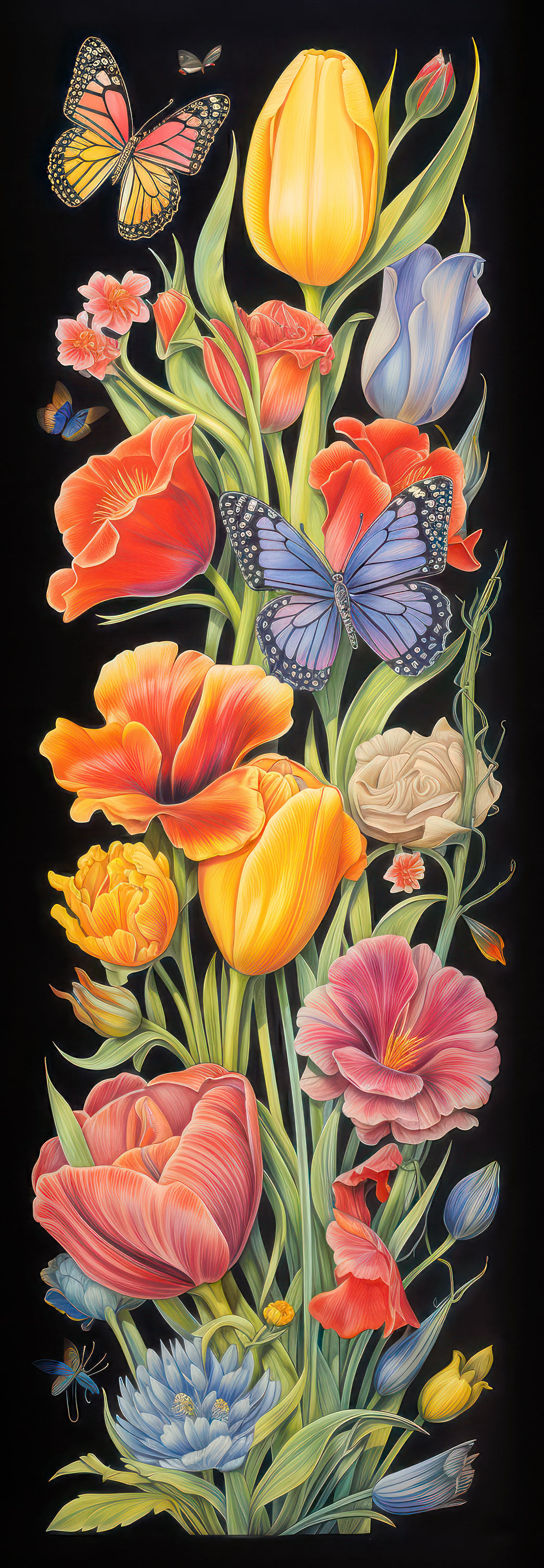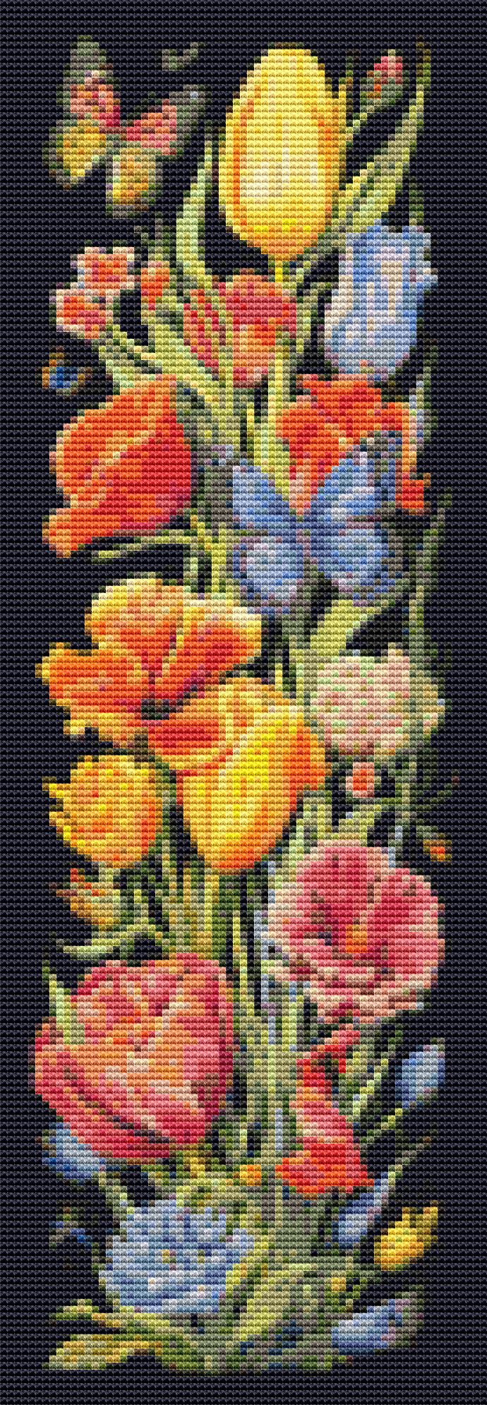 This cross stitch pattern depicts a picture of some butterflies around some beautiful flowers.