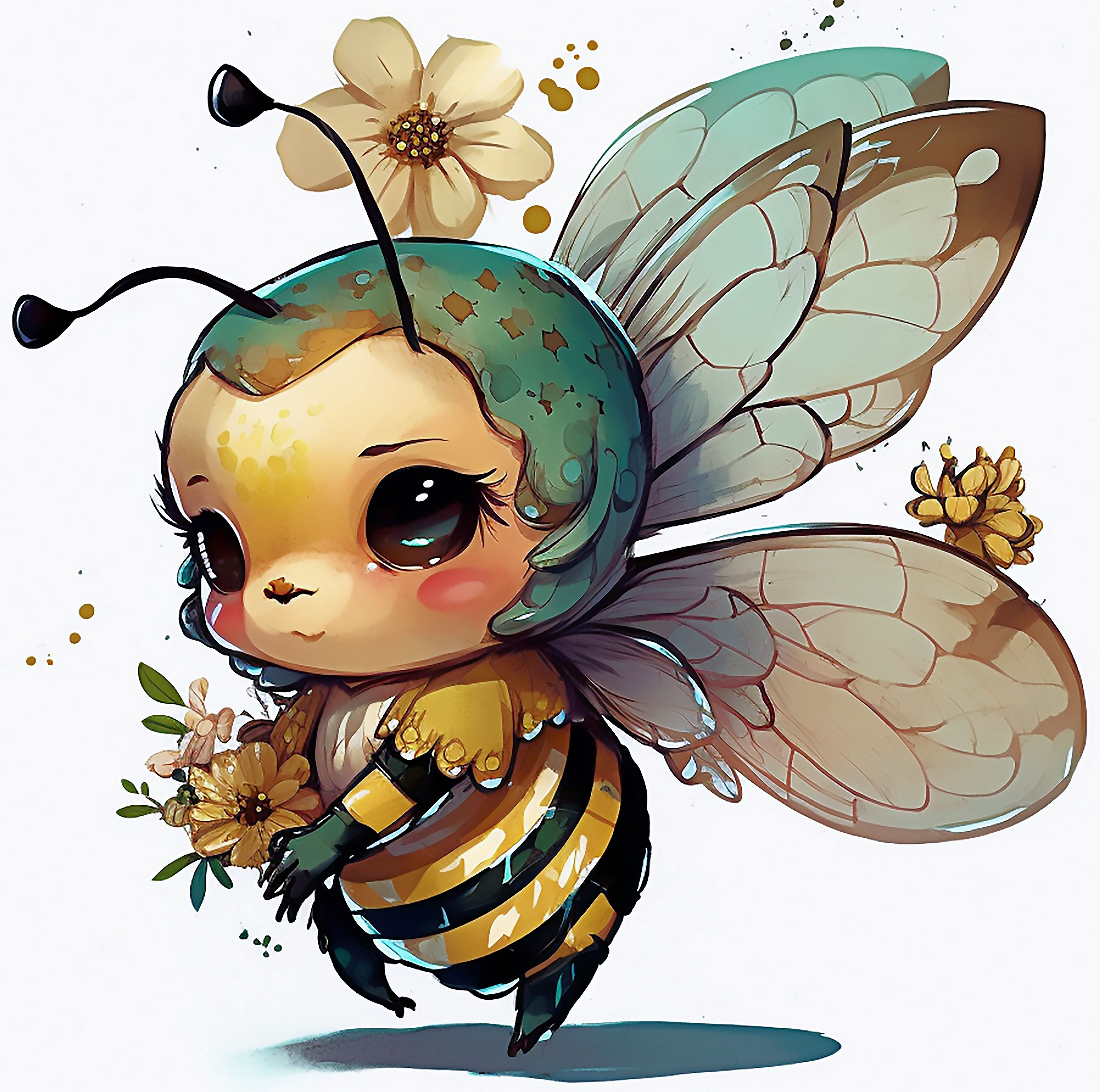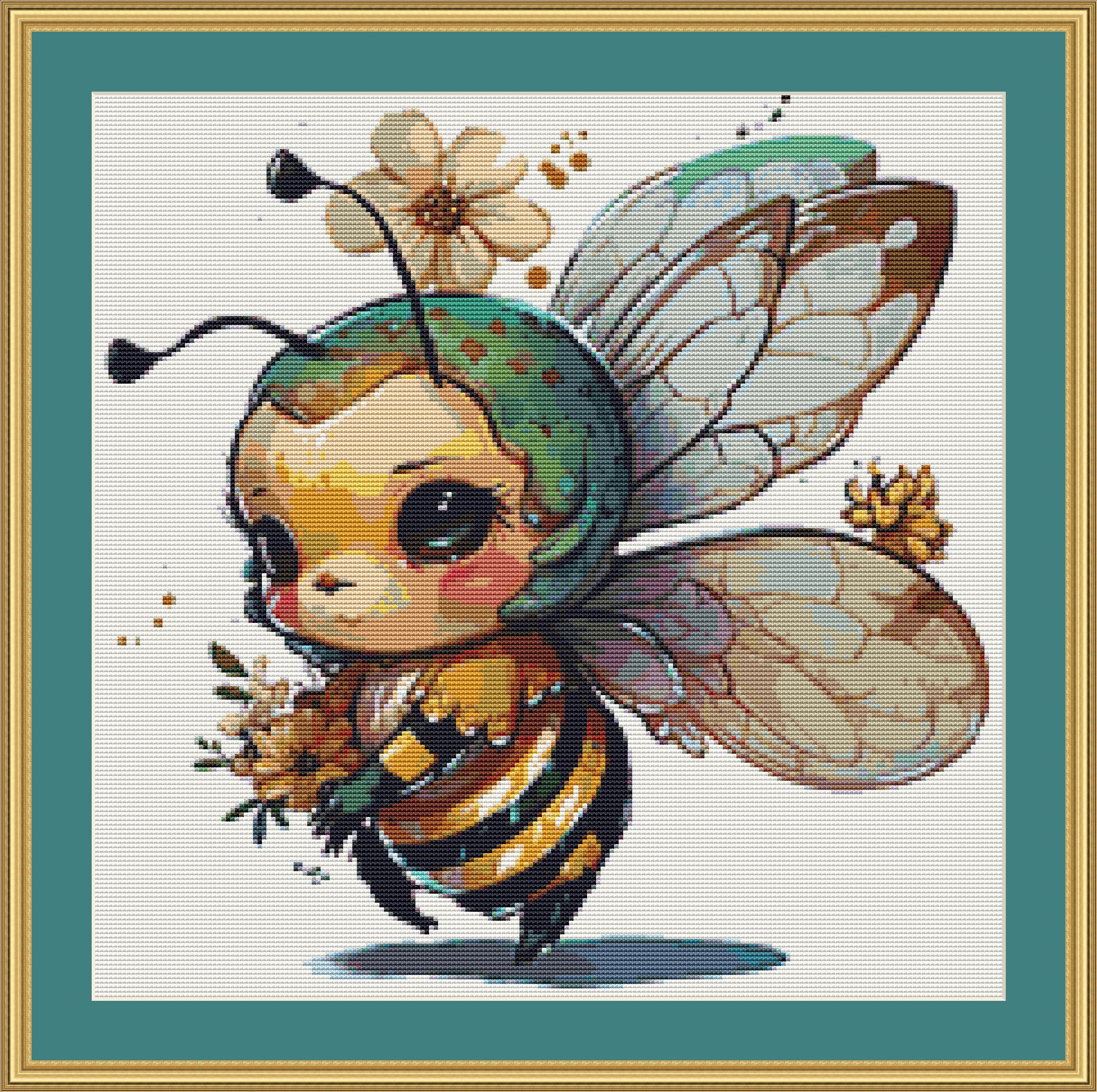 This cross stitch pattern depicts a picture of a honey bee collecting flowers.
