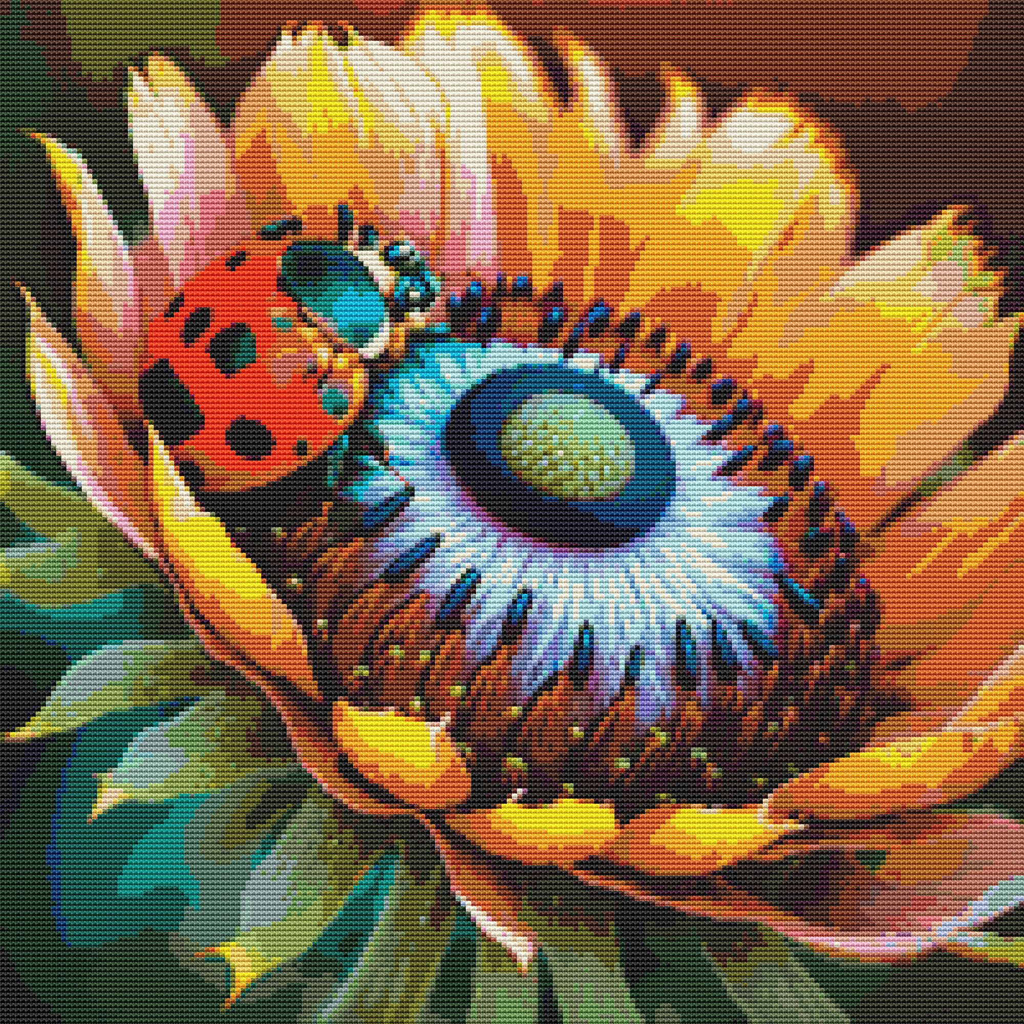 This cross stitch pattern depicts a picture of a ladybird on a flower.