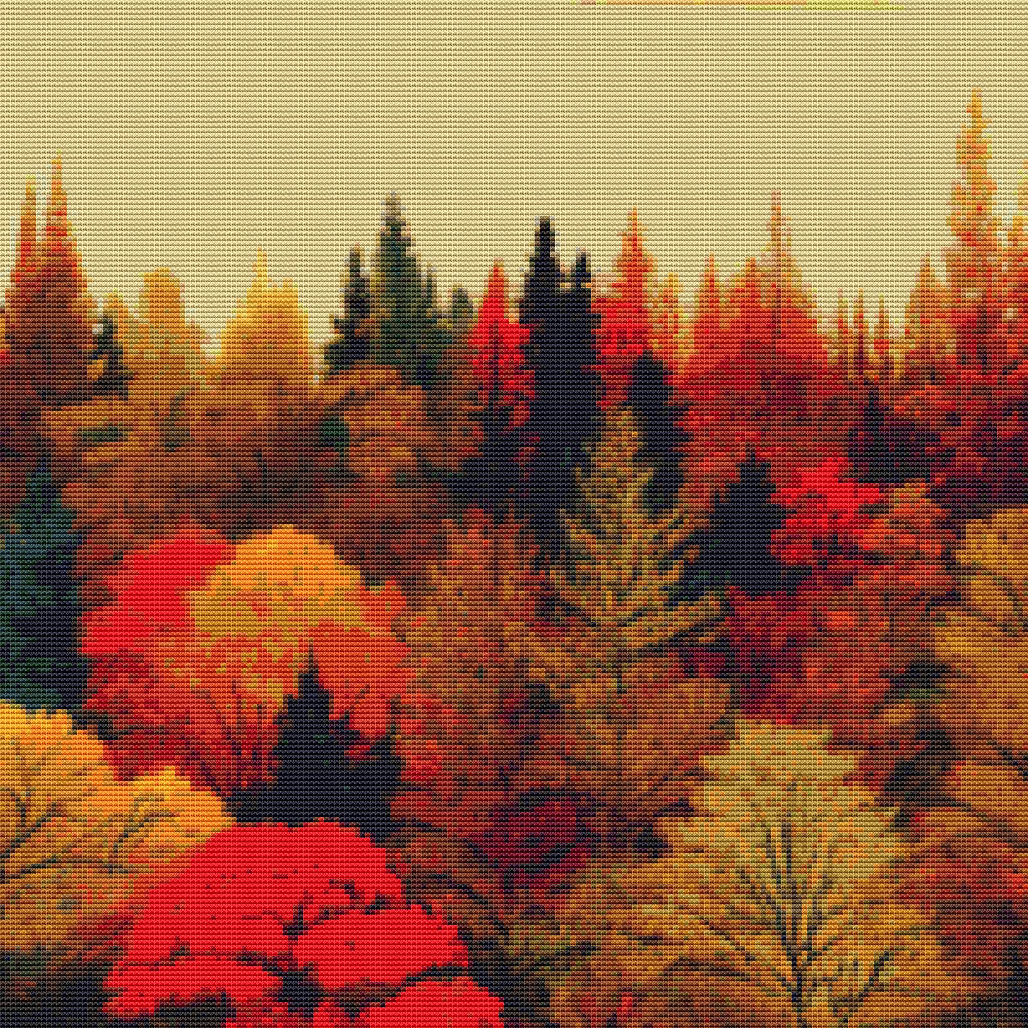 This cross stitch pattern depicts a picture of the stunning colours of the trees in autumn.