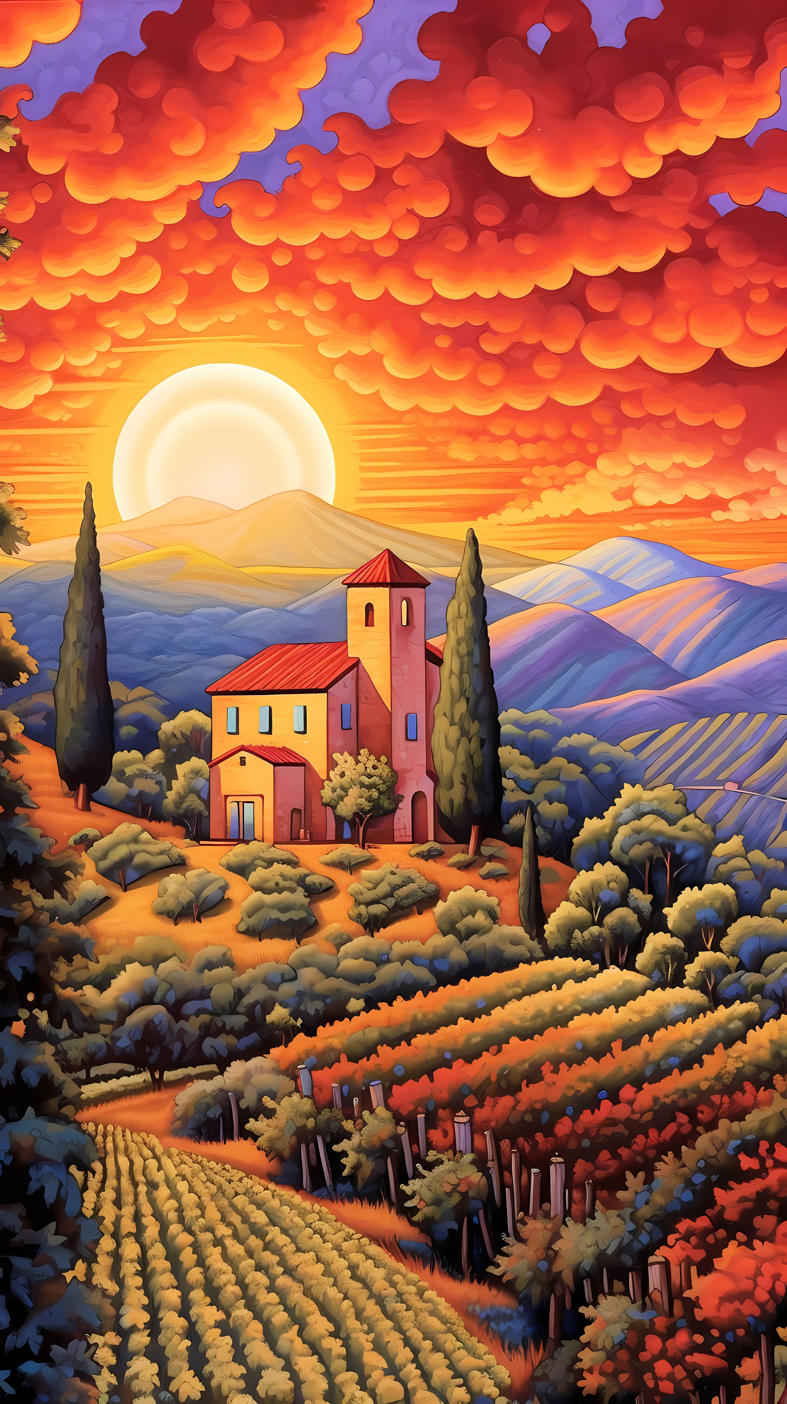 This cross stitch pattern depicts a picture of a beautiful sunset with a view of the countryside.