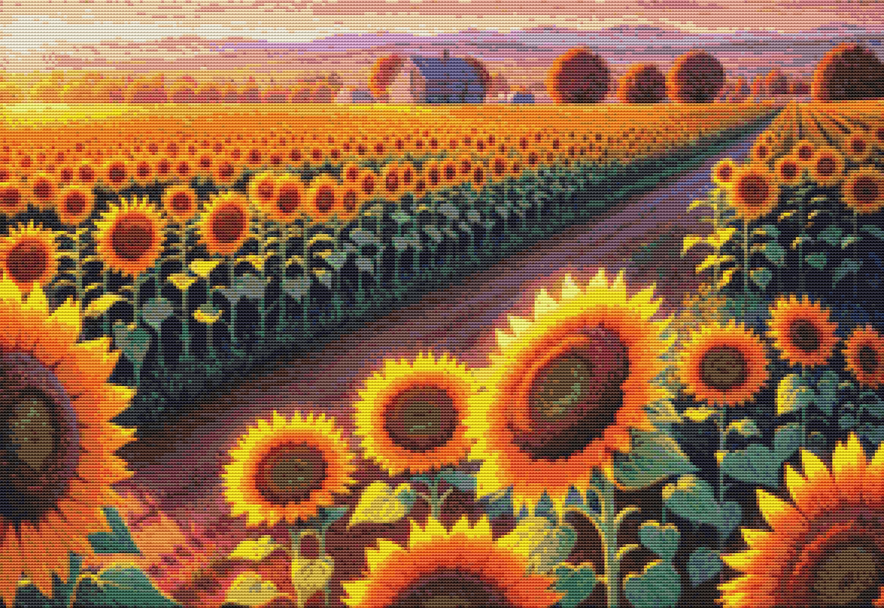 This cross stitch pattern depicts a picture of a stunning view of fields of sunflowers.